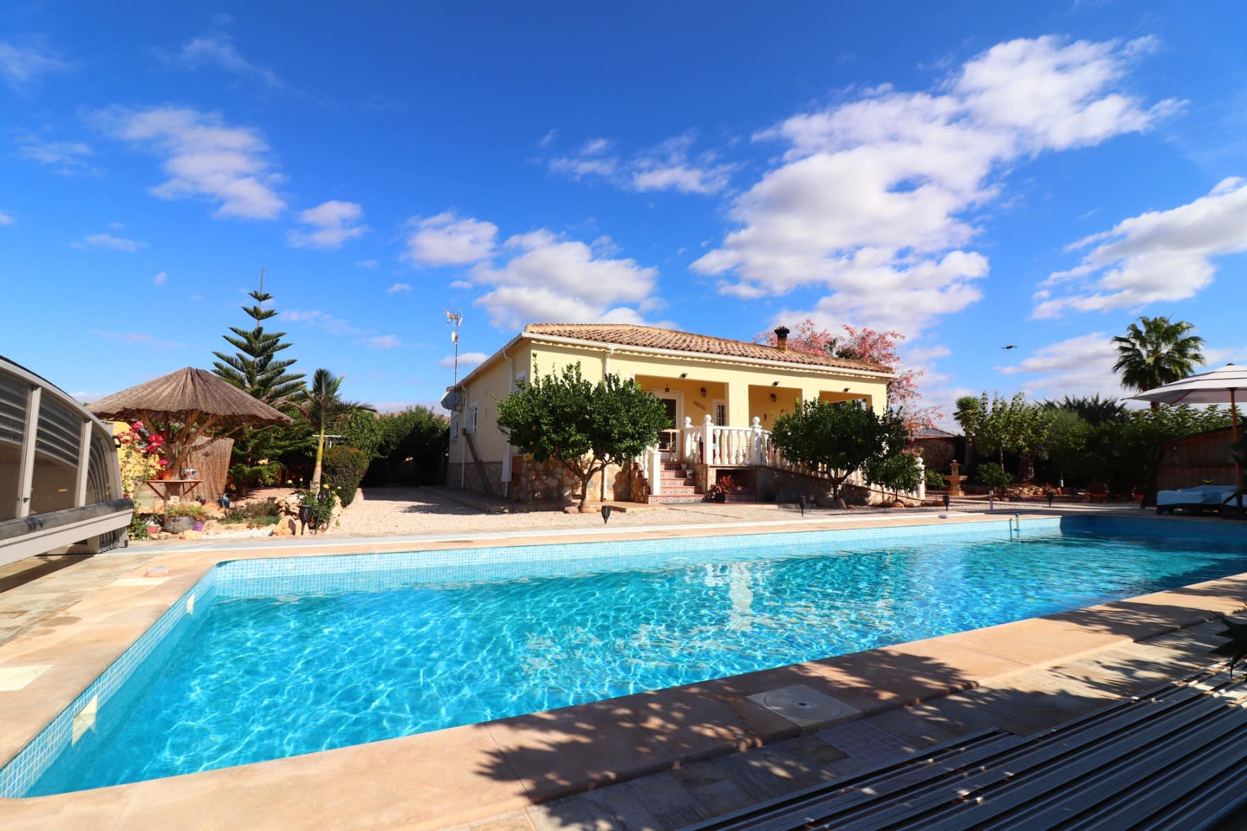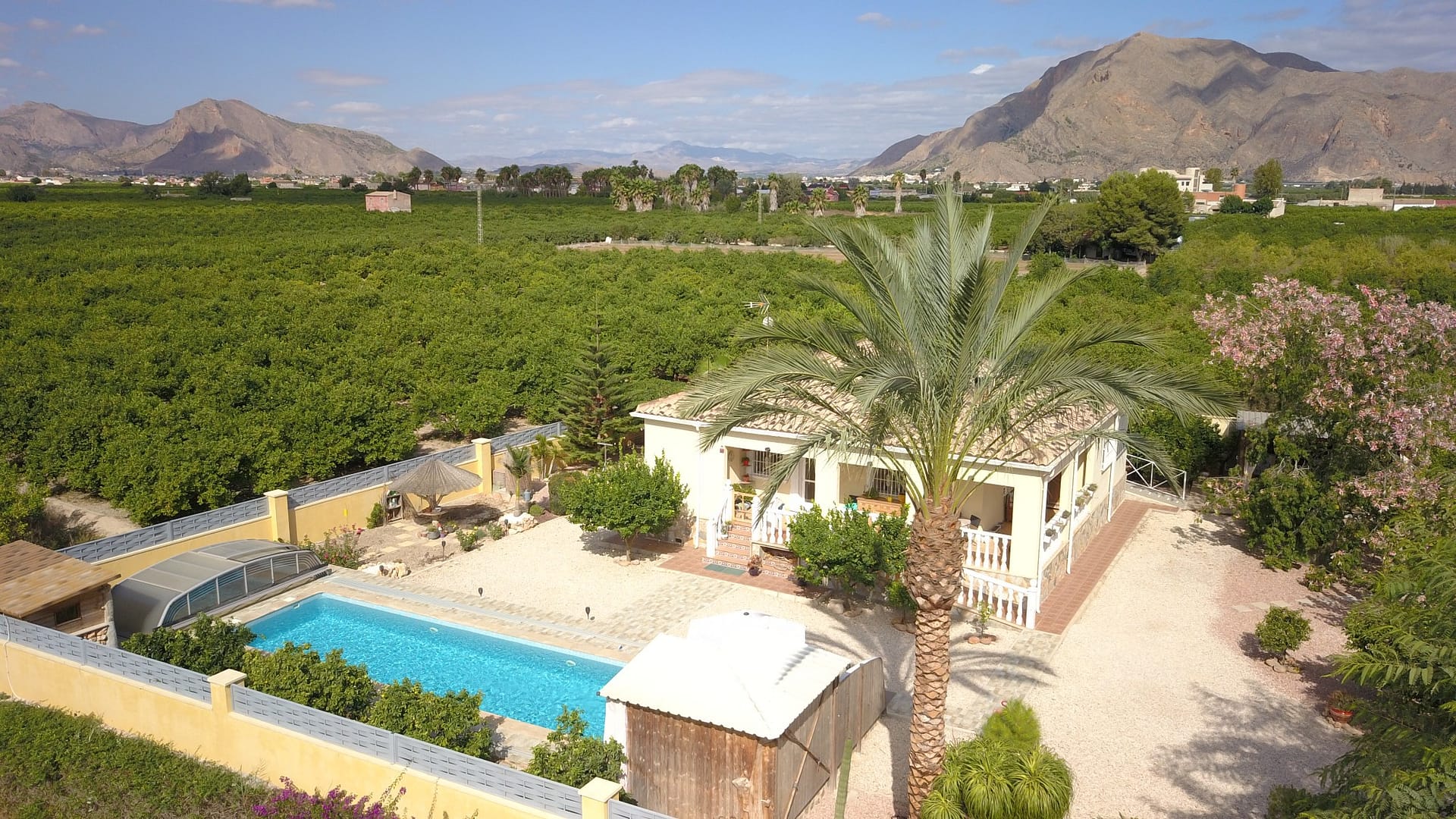 This South Facing, Three Bedroom, Detached Country Villa in La Campaneta is located amongst beautiful citrus groves with a stunning mountain backdrop. The charming village of La Campaneta and San Bartolomé, along with local amenities and the hospital, are just a 5 minute drive away. The historical city of Orihuela can be reached in 10 minutes, the 5* La Finca Golf & Spa Resort in 20 minutes, and the coast and beaches in only 30 minutes. The 109m2 villa is set on one level and boasts a lovely 29m2 L-shaped covered terrace overlooking the private pool. Inside, the living room features air conditioning and a cosy corner log burner fireplace; a separate fitted kitchen has a door leading to the utility. There are three double bedrooms with built-in wardrobes, the master benefiting from a ceiling fan and en suite shower/wet room. The second bedroom enjoys direct access through double sliding glazed doors to the terrace and garden, plus there is a family shower room. The generous 2322m2 plot is pebbled and landscaped with shrubbery and trees, offering ample off-road parking, a carport, and a two-door double garage currently used as a workshop. Outdoor living is at its best here, with a BBQ area, private heated salt pool with retractable cover and tiled surround, and a wooden covered kitchen, bar, dining and relaxation area. The property also benefits from an irrigation system and solar panels serving hot water. A fantastic opportunity for those seeking tranquil country living with modern comforts on the Costa Blanca South.