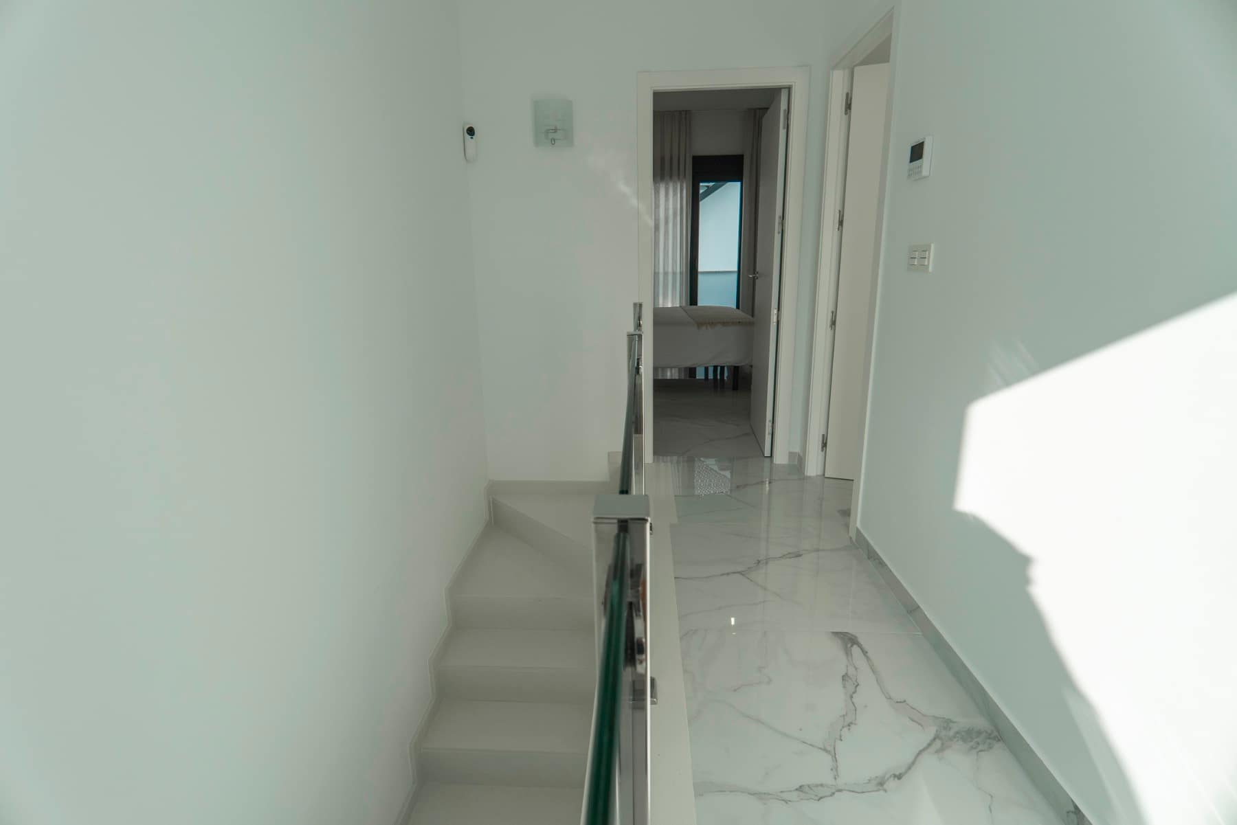 On the ground floor you will find a double bedroom and a stylish family bathroom with walk-in shower — perfect for guests or ground-floor sleeping. A striking staircase with glass balustrades leads to the upper level where two large double bedrooms await. The master bedroom (12.4 m²) features two built-in wardrobes, patio doors to a private terrace and a luxurious ensuite with a multi-jet shower. The second double bedroom (12.5 m²) also benefits from built-in wardrobes, a sleek ensuite and its own private terrace.