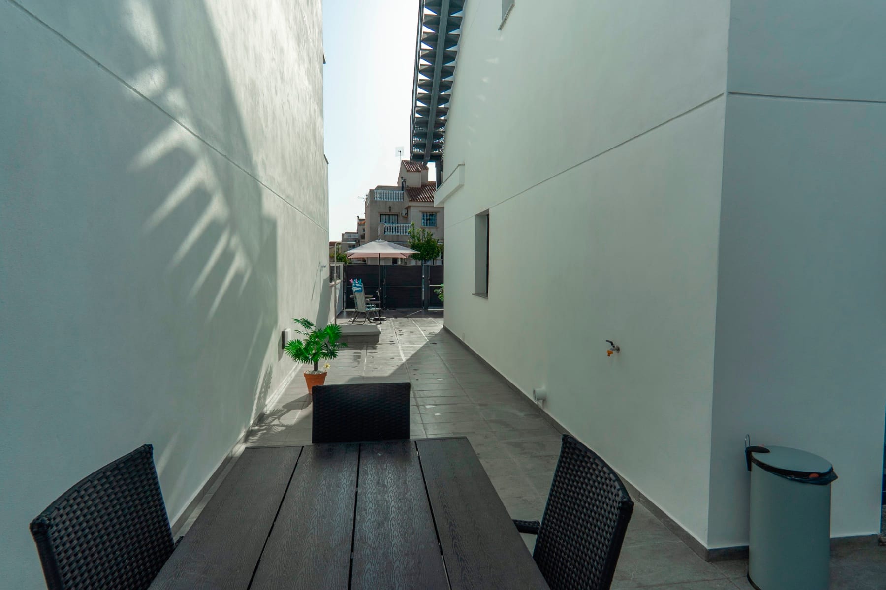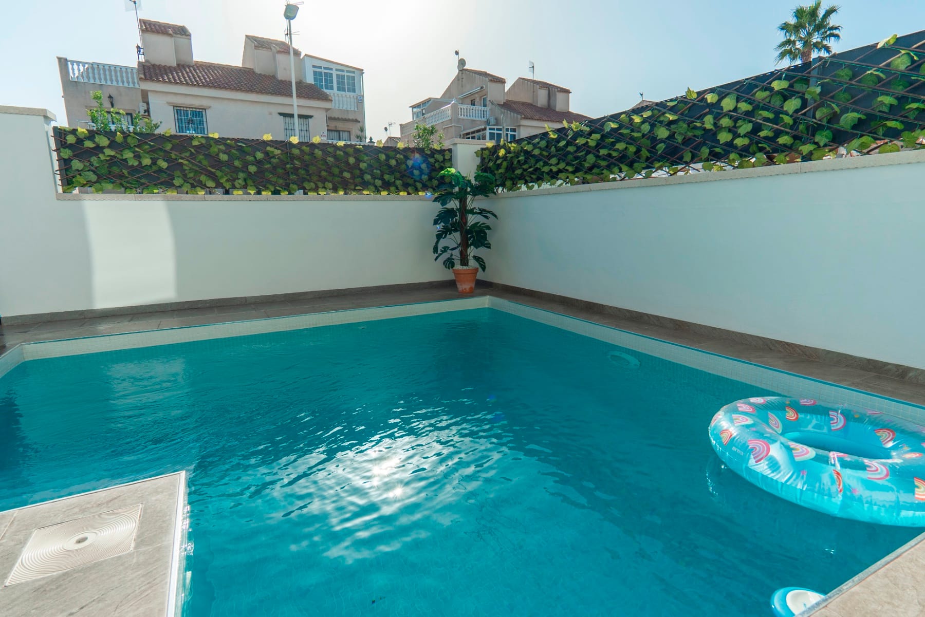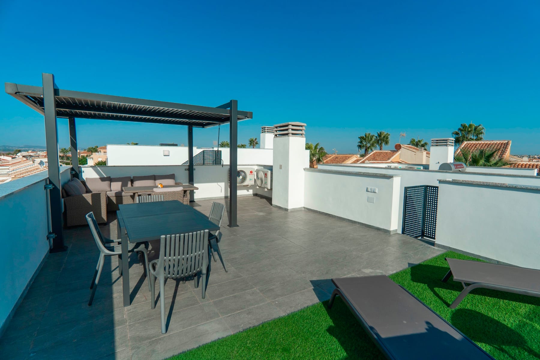 From the upstairs terrace a separate stairway takes you to the villa’s showpiece: a 45.7 m² solarium with a modern steel pergola and commanding views over the Torrevieja salt lakes and surrounding hills. Whether you want a peaceful spot for sunset drinks, an alfresco dining area, or a shaded rooftop lounge, the solarium offers exceptional flexibility and panoramic appeal.