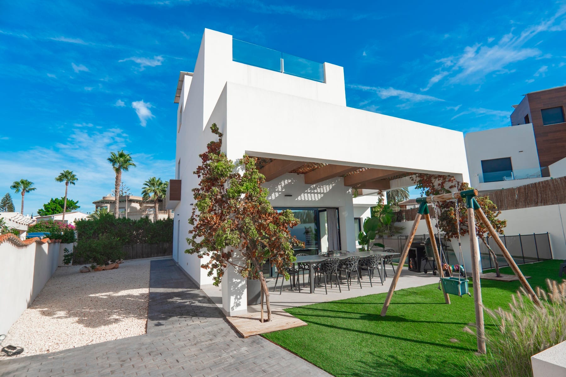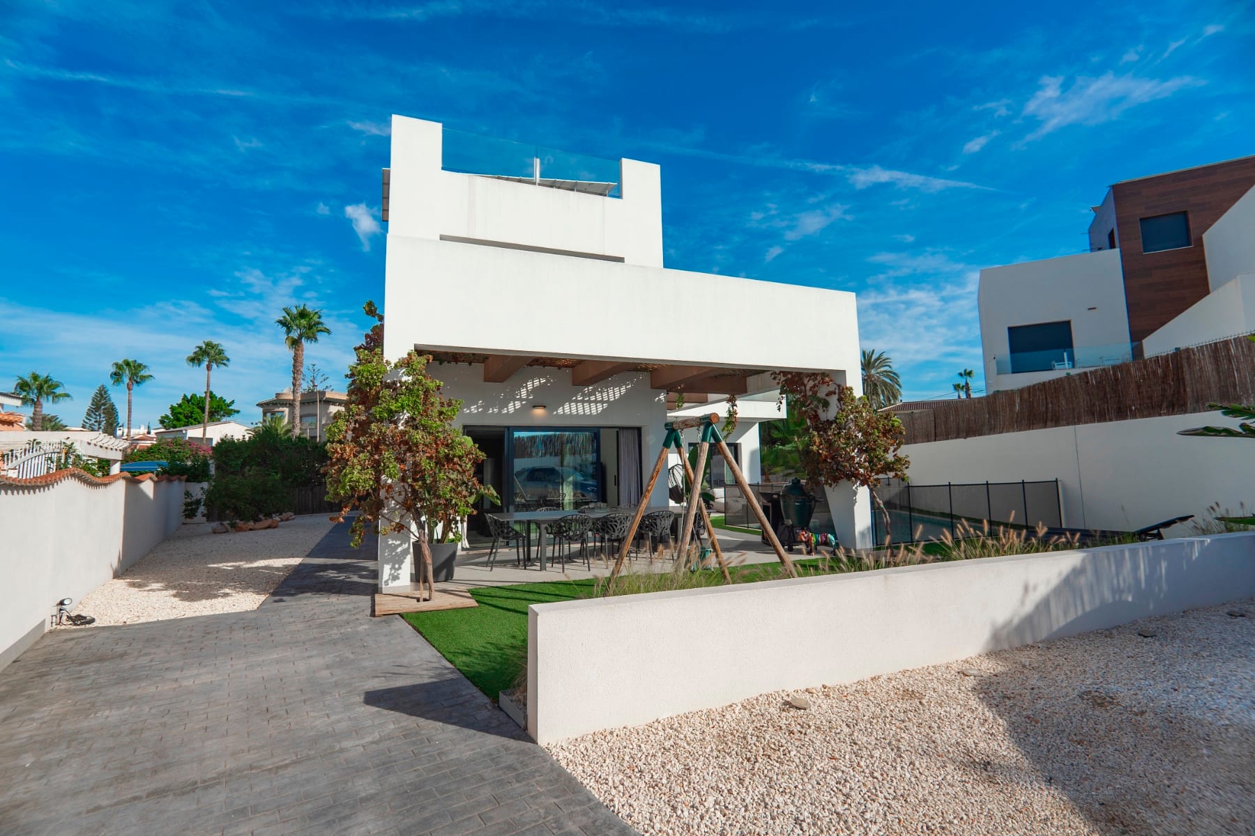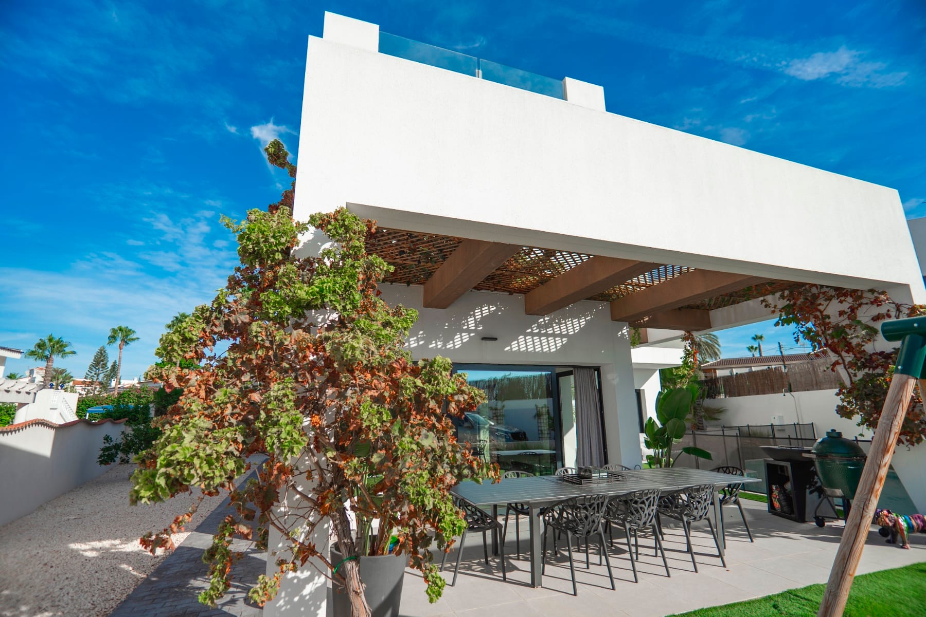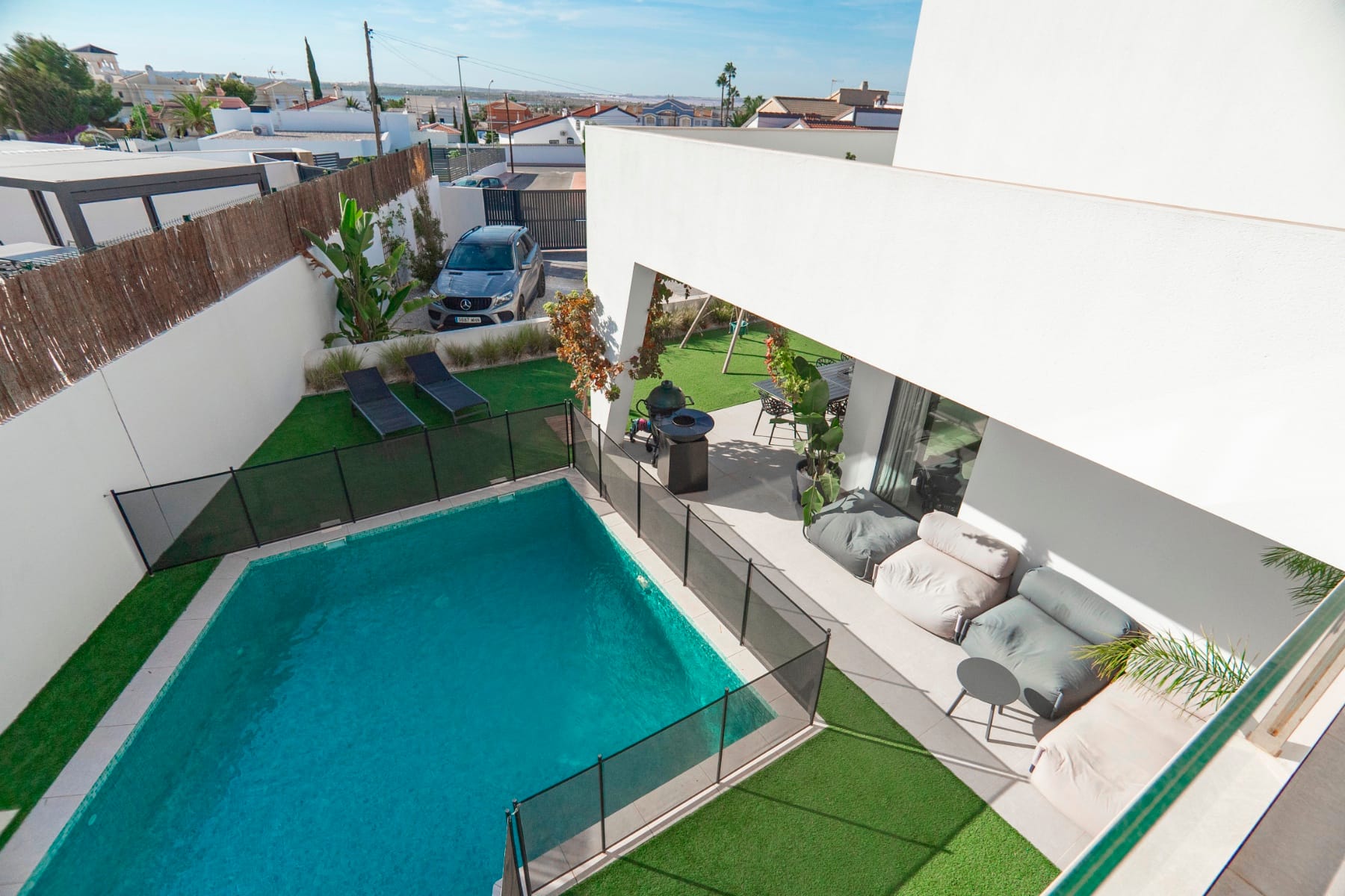 Petra Hönig Inmobiliaria in Ciudad Quesada is proud to present this elegant and contemporary detached villa, ideally situated in the heart of the highly sought-after Ciudad Quesada. Completed in 2020, this home features a bright and tasteful design with clean lines and quality finishes throughout. While more compact than some, its clever layout across two main floors plus a rooftop level ensures excellent functionality, light, and comfort in every space. Ground Floor: The entrance opens to a comfortable living area with an open-plan kitchen and an adjoining utility room. The large windows invite plenty of natural light, giving the interior a warm and airy feel. This floor also features a guest bedroomand a modern bathroom, making it ideal for visitors or convenient single-level living. First Floor: Upstairs, you’ll find two well-proportioned bedrooms, both with their own en-suite bathrooms. One bedroom includes a walk-in wardrobe, while the other provides access to a private balcony that overlooks the plot. Rooftop Level: At the top of the home is a versatile fourth room, currently used as an office, along with two generous terraces offering panoramic views over the surrounding area, the salt lakes, and even glimpses of the Mediterranean Sea. Exterior & Plot: The plot is well-sized yet manageable, featuring a private pool area, several charming patios and terraces perfect for relaxation or entertaining, and off-road parking for multiple vehicles. Prime Location: Nestled in Ciudad Quesada, a vibrant year-round community, this home is within easy reach of shops, restaurants, bars, and essential services. For recreation, the area offers golf, mini golf, a water park, bowling, hiking trails, and much more. There is also a Norwegian school, making it especially appealing for international families. The beaches of Guardamar and Torrevieja are just a 10-minute drive away, and La Marquesa Golf Course is within walking distance.