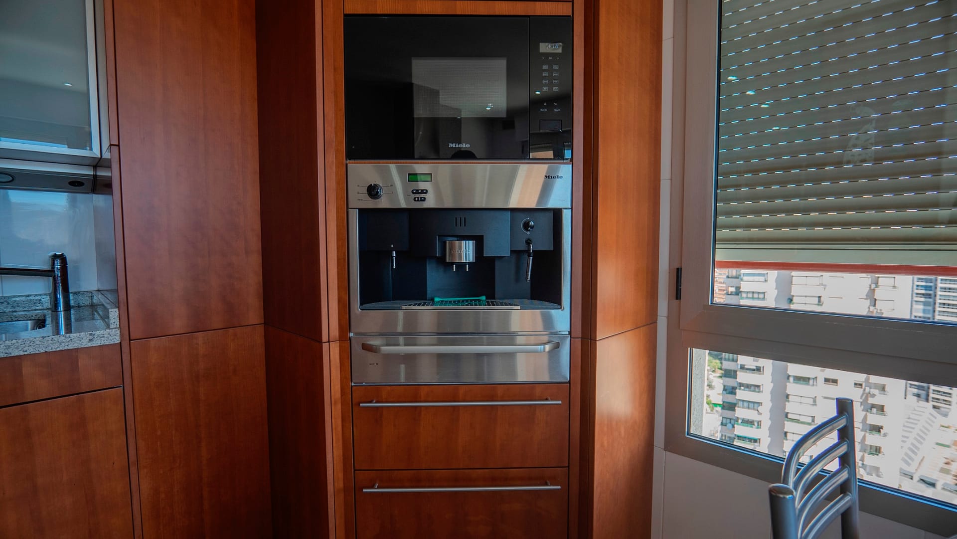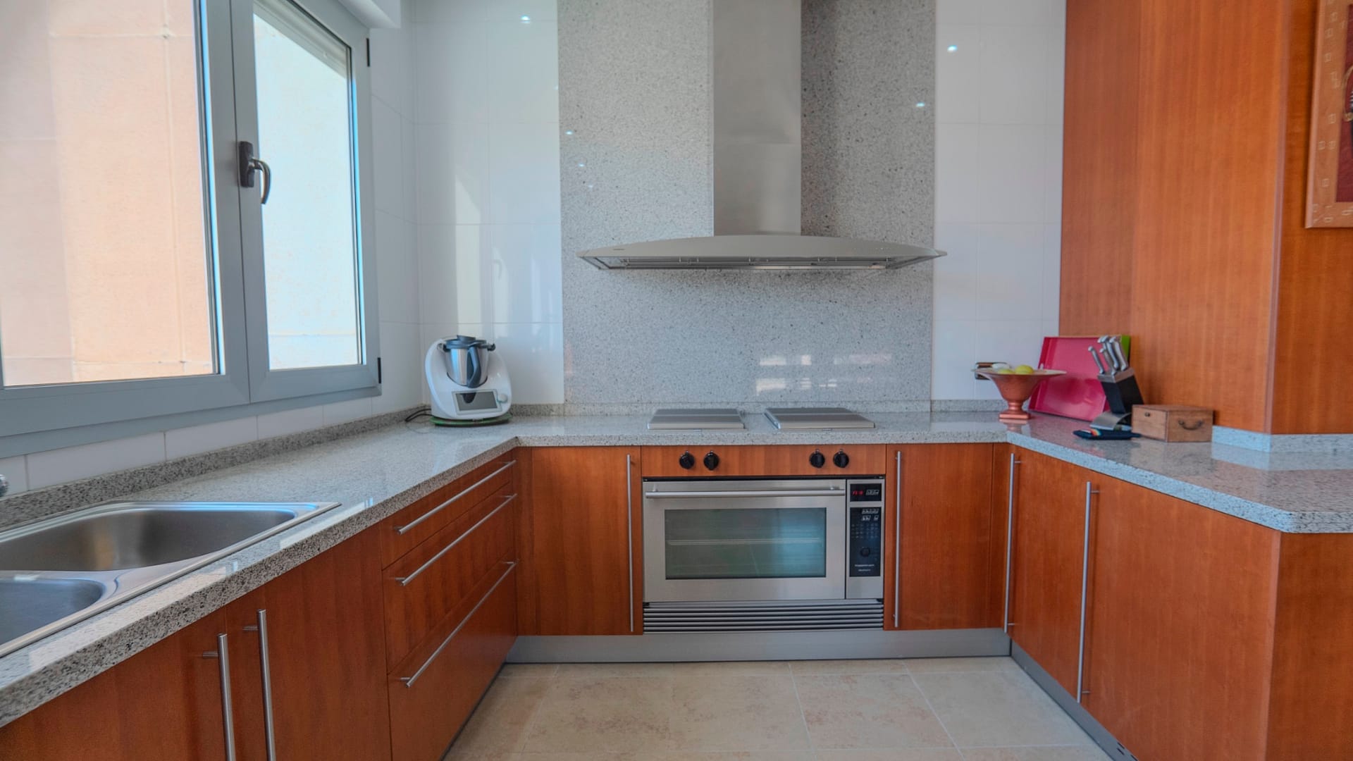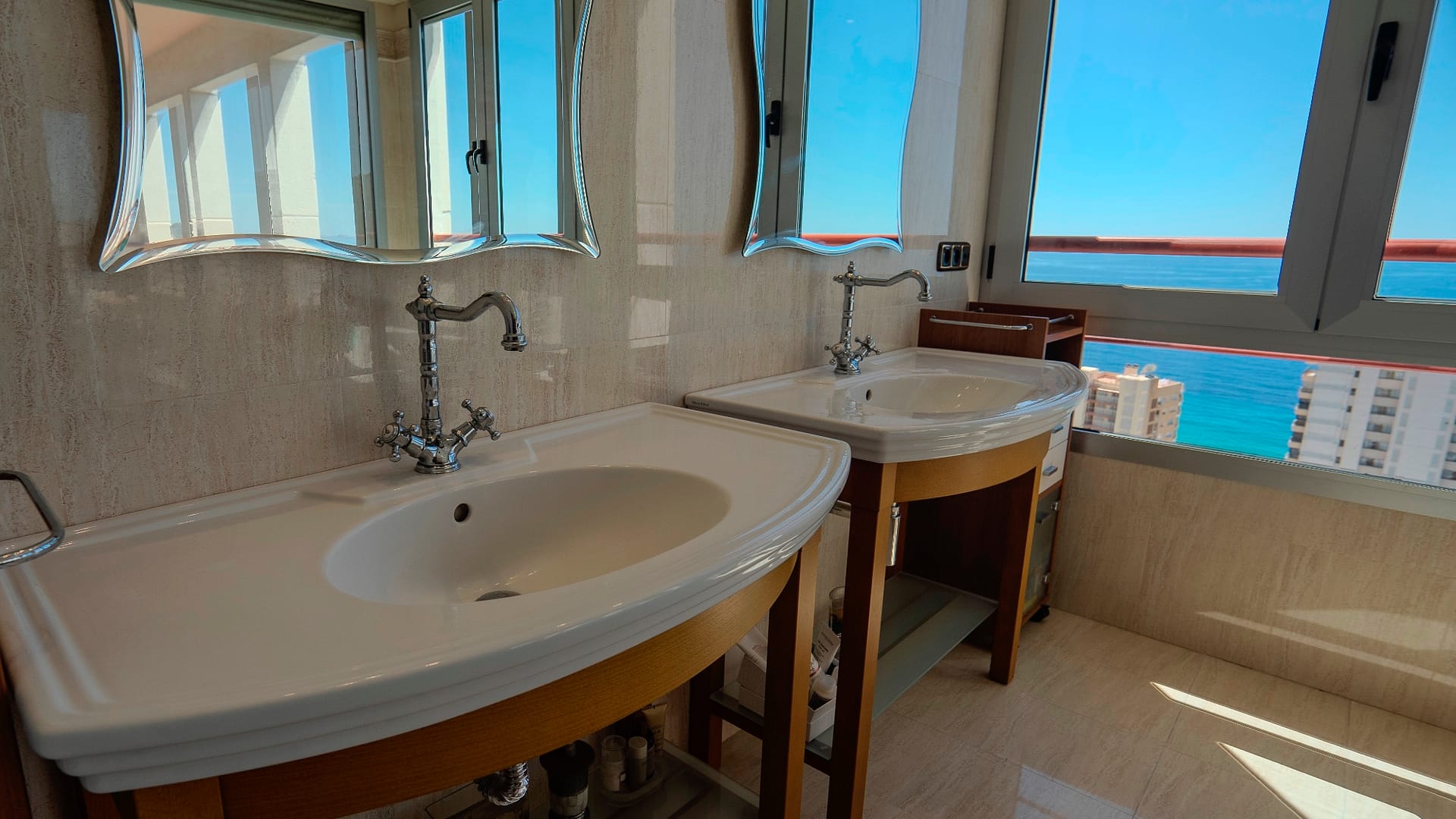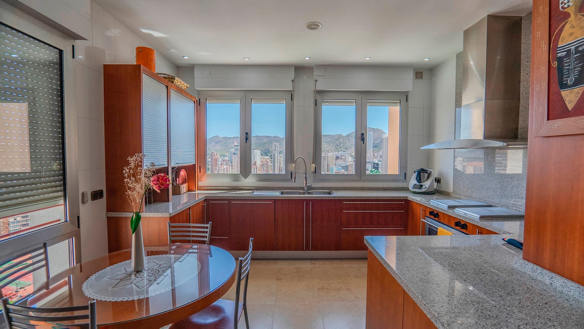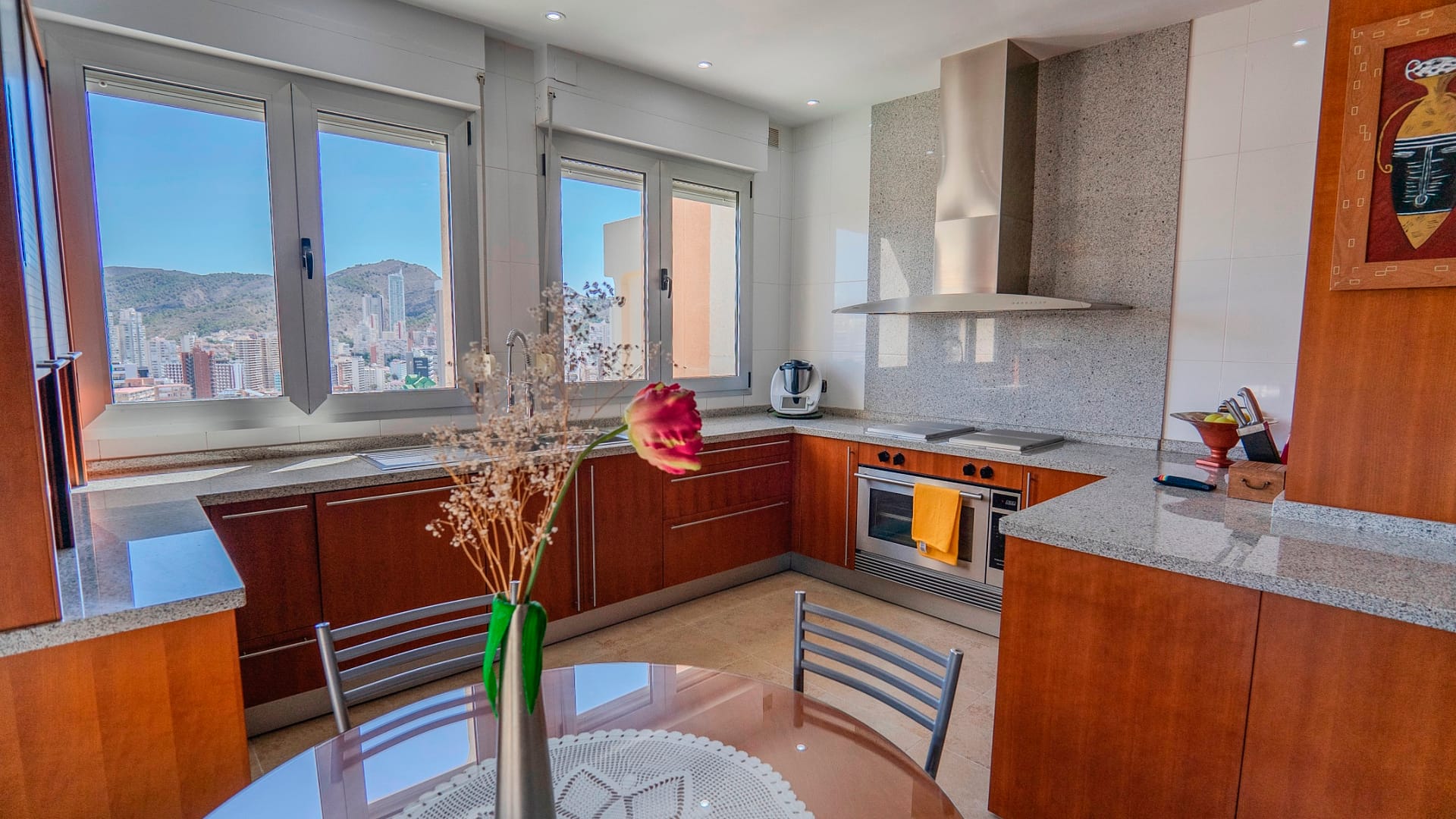 Next, enter the large, independent kitchen which is fitted with granite work surfaces and top-of-the range appliances. The space is well-thought out and perfect for cooking enthusiasts or your private chef. Beautiful views across the city of Benidorm to the mountains are enjoyed from the kitchen window.