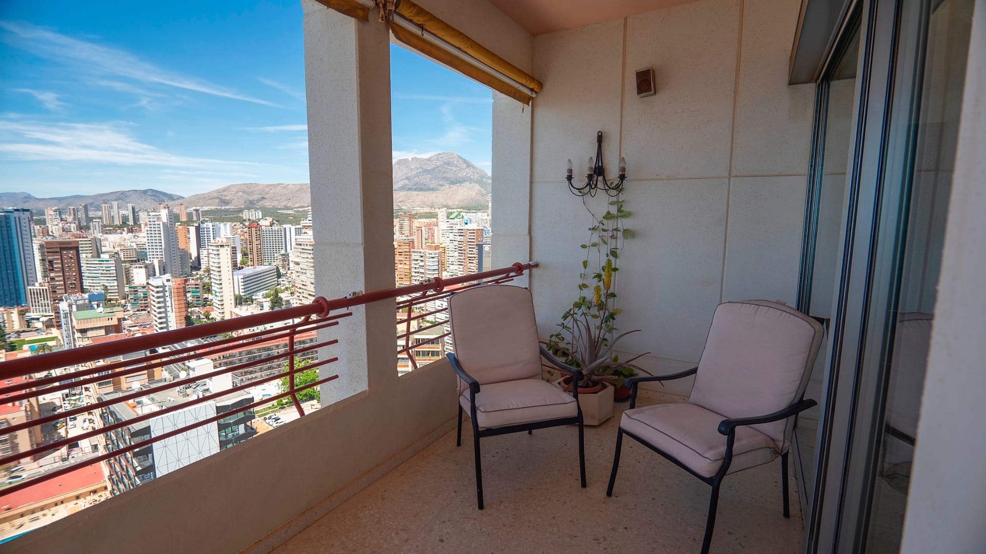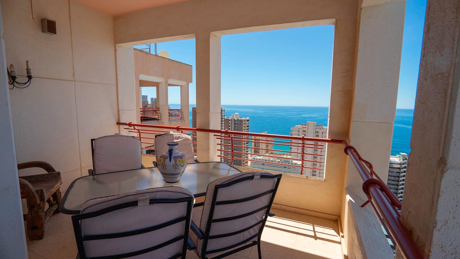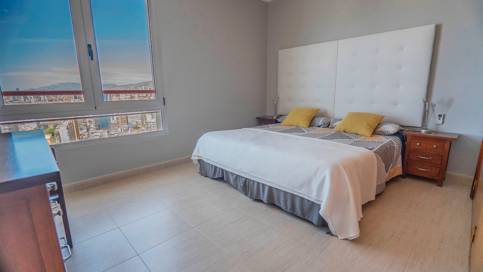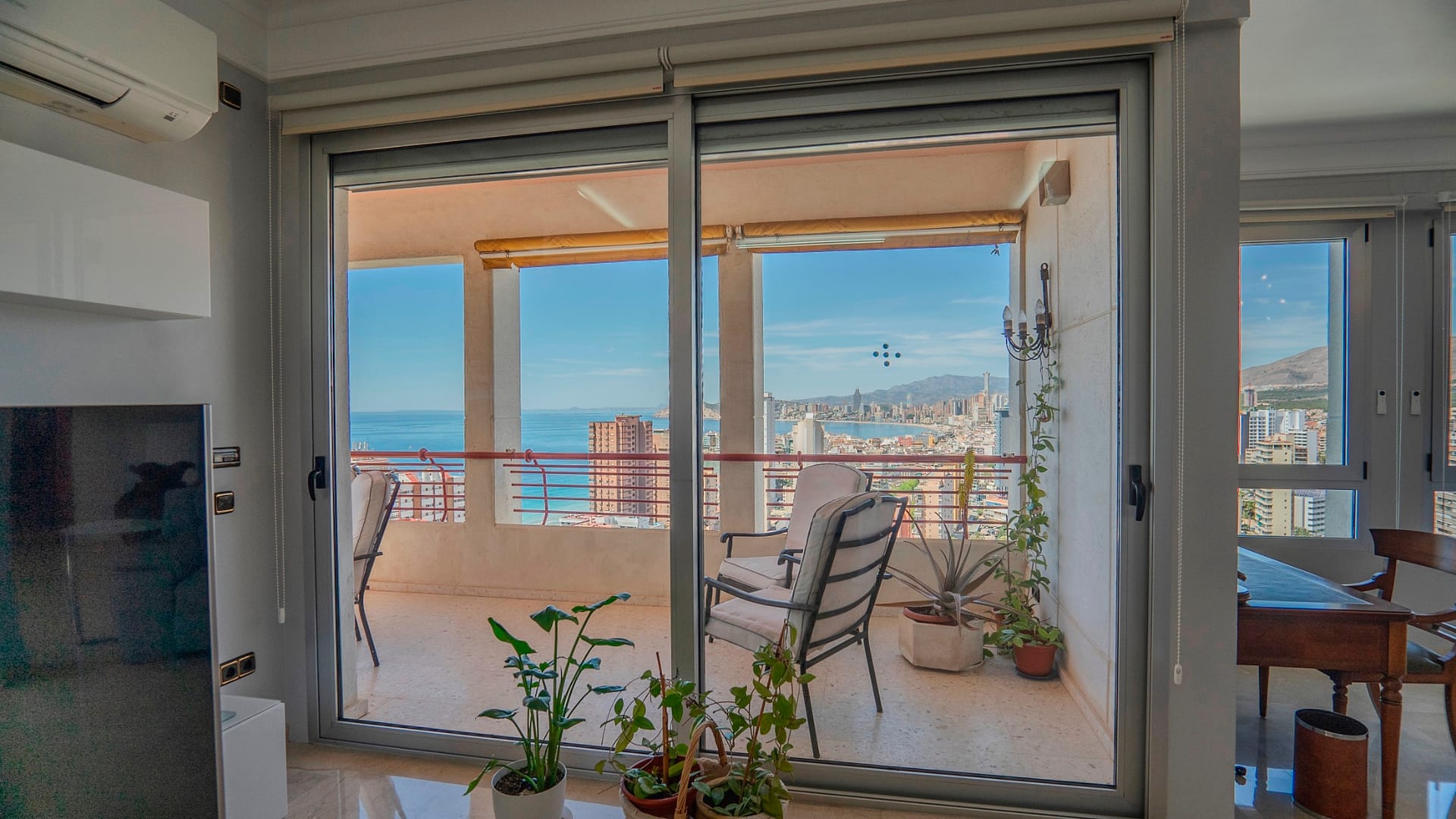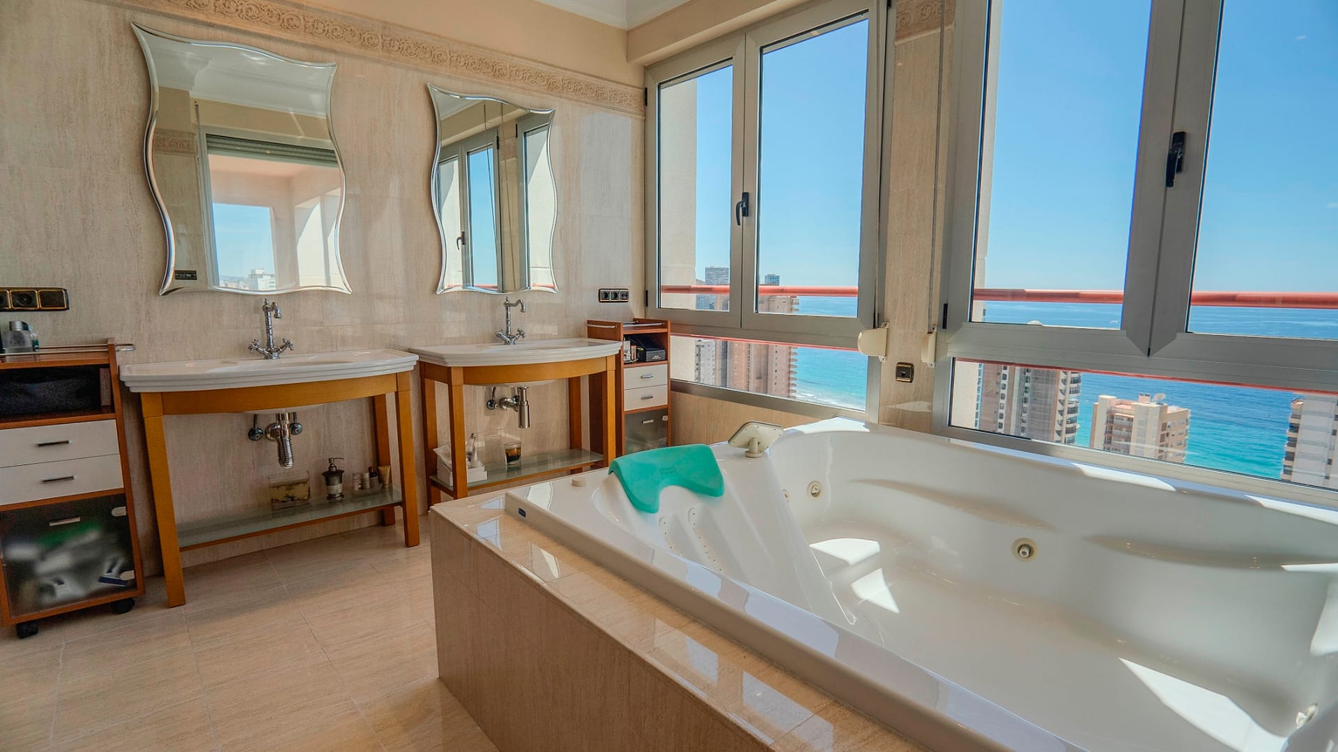 Next, enter the large, independent kitchen which is fitted with granite work surfaces and top-of-the range appliances. The space is well-thought out and perfect for cooking enthusiasts or your private chef. Beautiful views across the city of Benidorm to the mountains are enjoyed from the kitchen window.