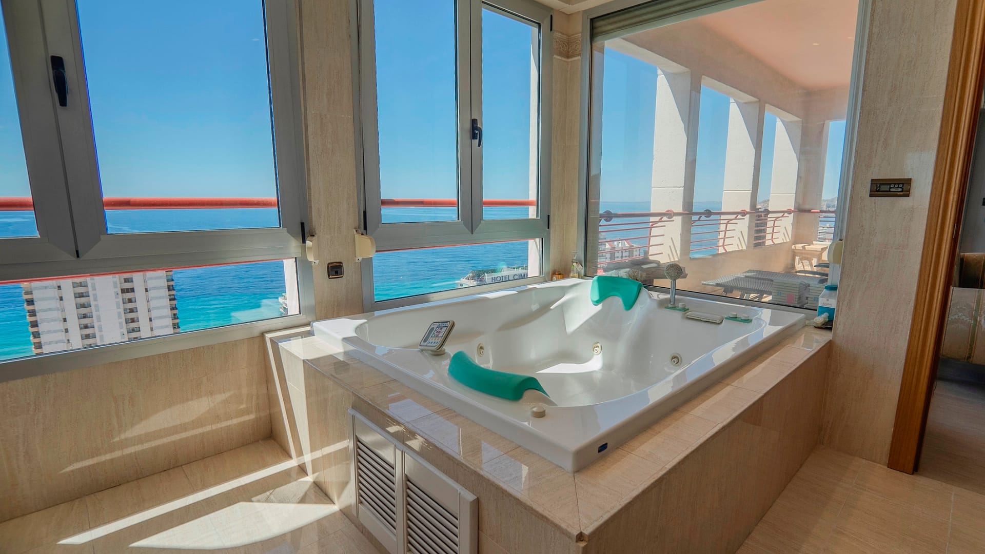The penthouse boasts five bedrooms, all with stunning views of the sea, city or mountains. The master bedroom is the height of luxury. Being double-aspect the room is flooded with light and enjoys stunning sea views. A private balcony allows you to sit and really soak in the amazing location. This bedroom also features fitted designer wardrobes and a dressing room. Plus, there is an ensuite bathroom where you can soak in the jacuzzi bath while gazing out to sea.