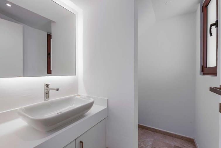 Inside is modern, with high-end furnishings, marble floors, and integrated air conditioning. There are three bedrooms on the first floor, a spacious master bedroom with an ensuite, and a further family bathroom shared bedroom bedrooms 2 & 3, accommodating up to six guests.
