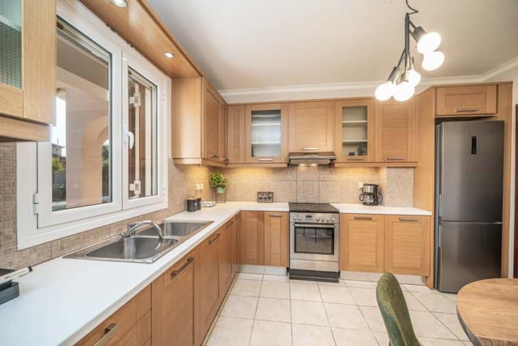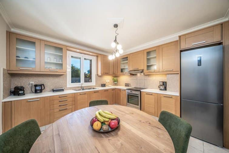 Inside this property showcases a minimalistic colour palette alongside contemporary designs and modern furnishings. The kitchen is fully equipped with everything from a microwave to an American-style fridge freezer and ample worktop space so you can prepare and cook meals with ease. In the living room and dining area, comfortable seating, a long dining table, and a flat-screen TV mean there is space for all the family to snuggle on the sofa and enjoy meals together.