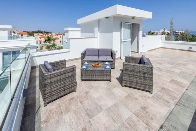 Head upstairs and unwind in one of the three spacious bedrooms- a master bedroom, lavish double and one twin room, great for younger guests. Step outside to your own private rooftop terrace- the unrivalled jewel in the crown. Sit back and relax with your favourite tipple as you watch the sunset caress the vibrant Mediterranean coastline and breathe in the fresh sea air of Protaras.