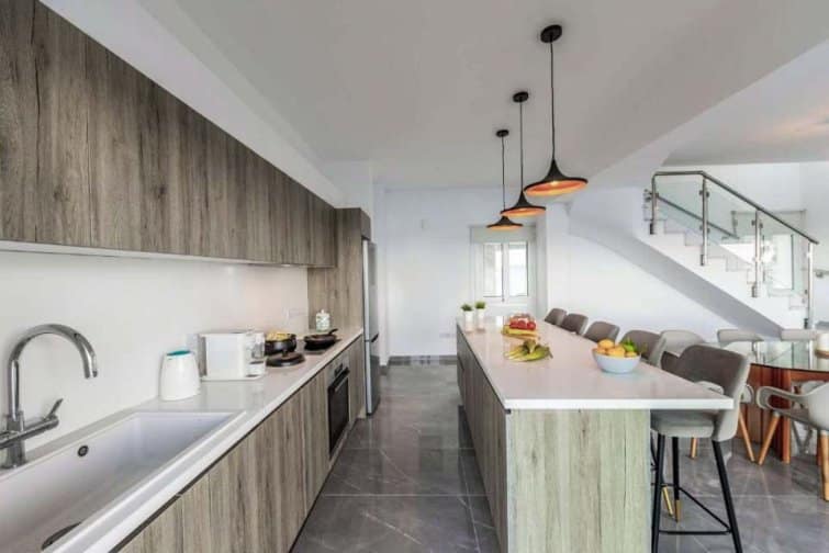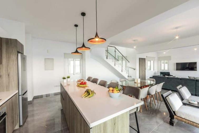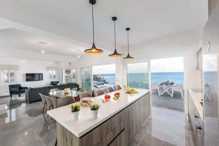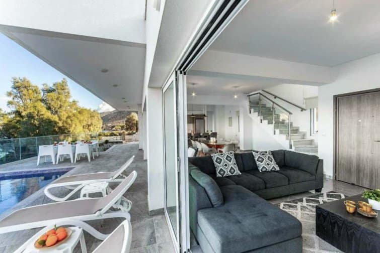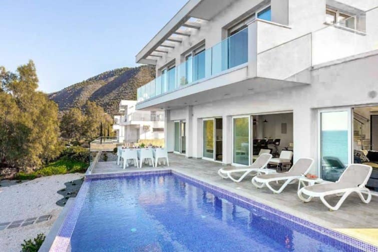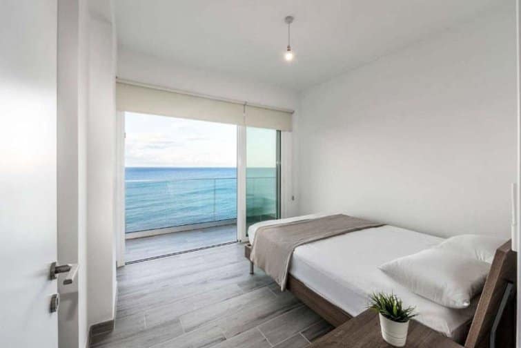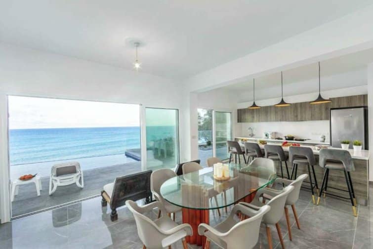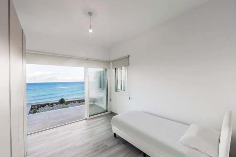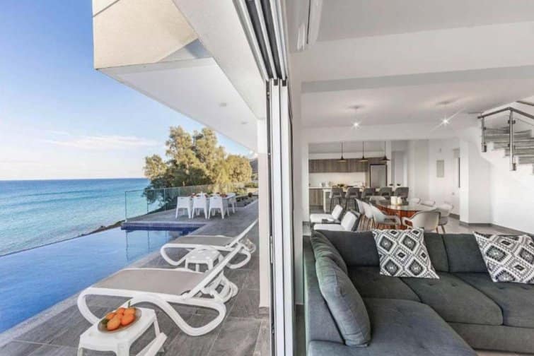 The interior is filled with natural light, creating a bright and airy atmosphere that perfectly complements the breathtaking views. The open-plan layout of the living room, kitchen, and dining area is enhanced by numerous patio doors that lead out to the pool terrace. With its Smart TV, breakfast bar, and stylish furnishings, this space is ideal for relaxation and enjoyment. Each bedroom offers its own access to a terrace or balcony, all of which face the sea. The master bedroom even features its own ensuite bathroom. Outside, the villa impresses with the soothing sound of the ocean as a backdrop, an infinity pool for refreshing dips, and a modern dining area for delightful barbecues.
