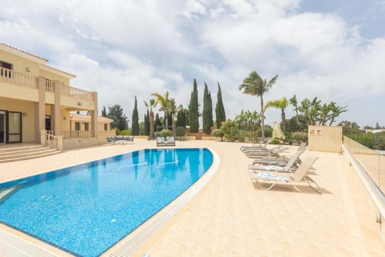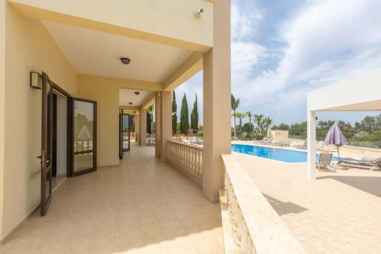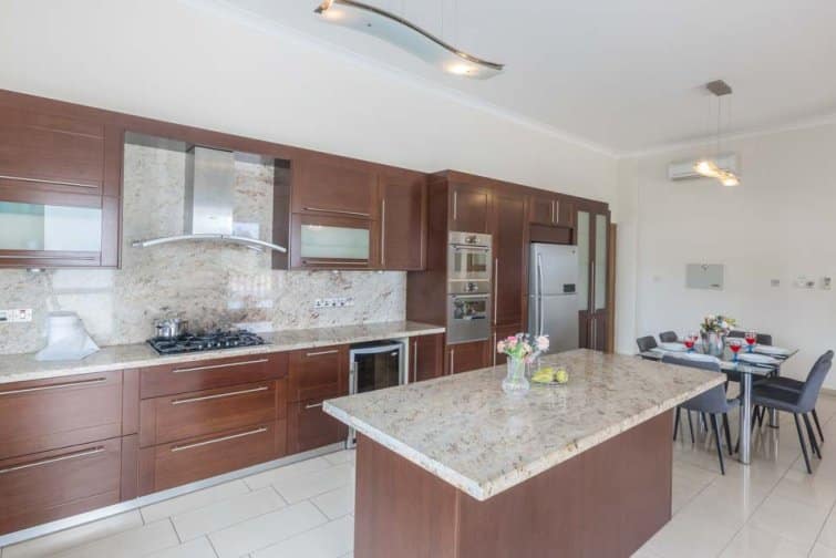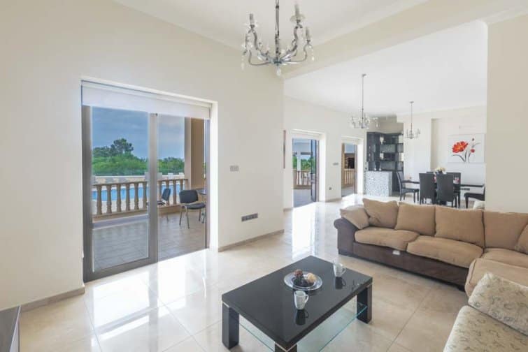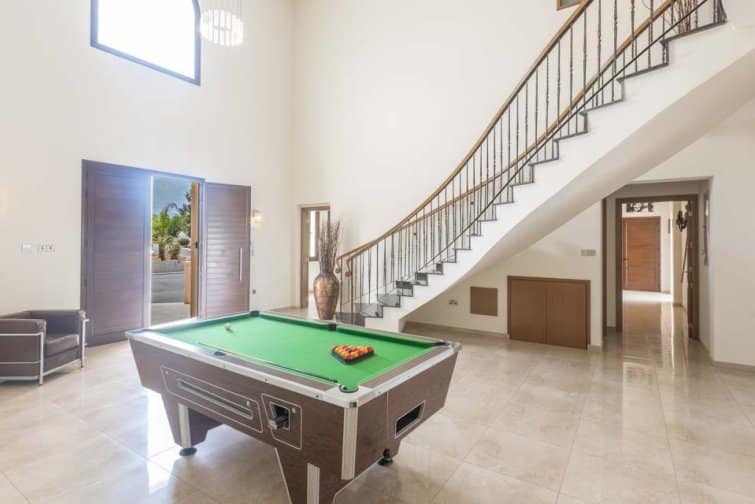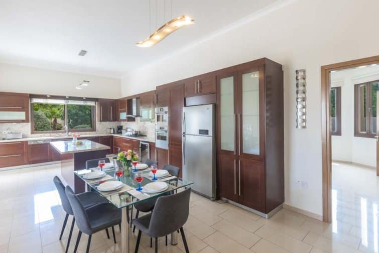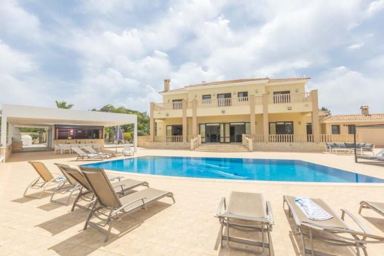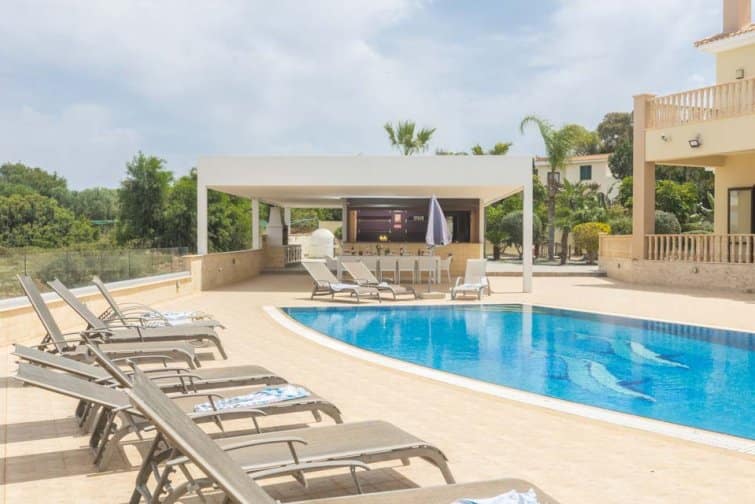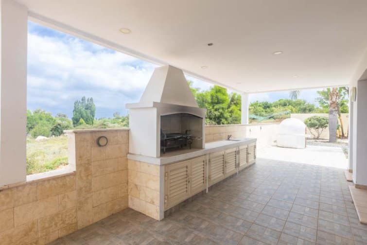 The villa’s rear boasts an enchanting and expansive patio, featuring an outdoor bar and kitchen, BBQ area, and a generously sized pool. A newly constructed pergola offers ample covered and uncovered seating, with space for unforgettable alfresco dining beneath the Cypriot sky.