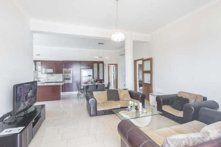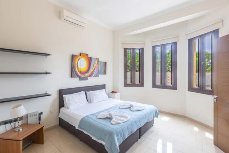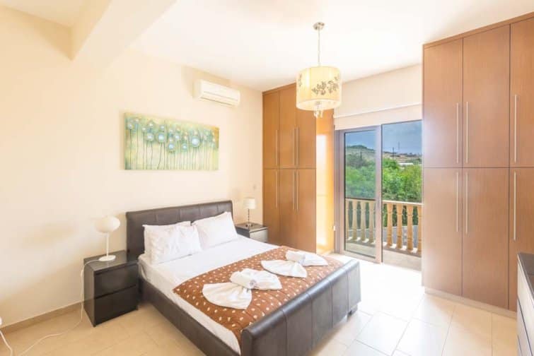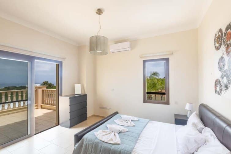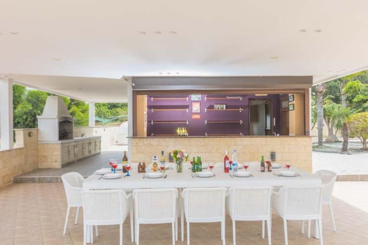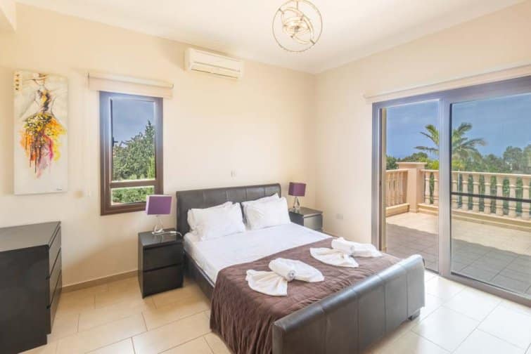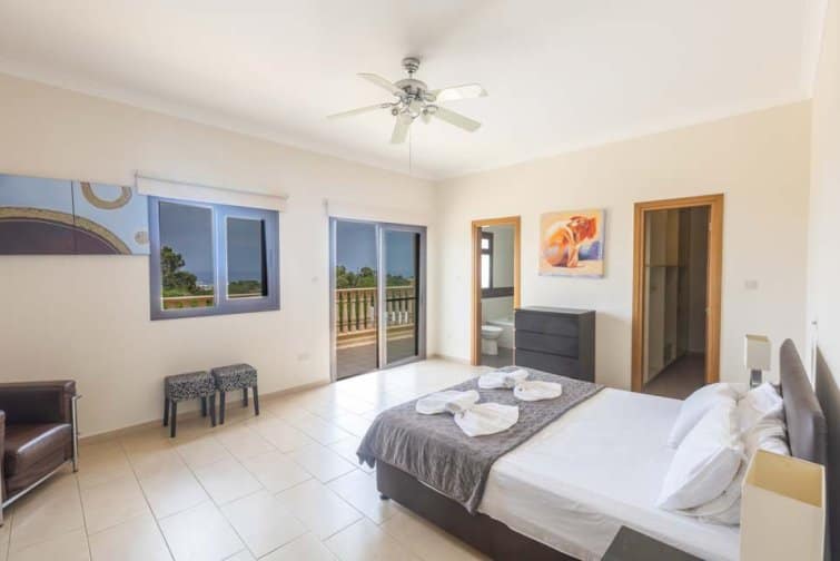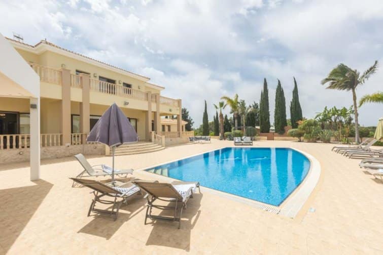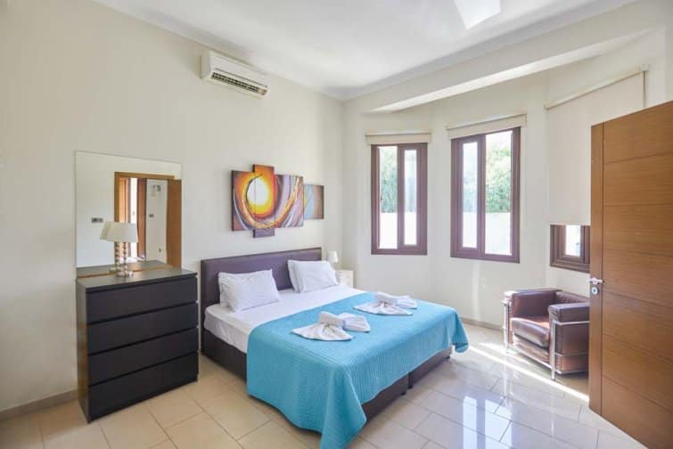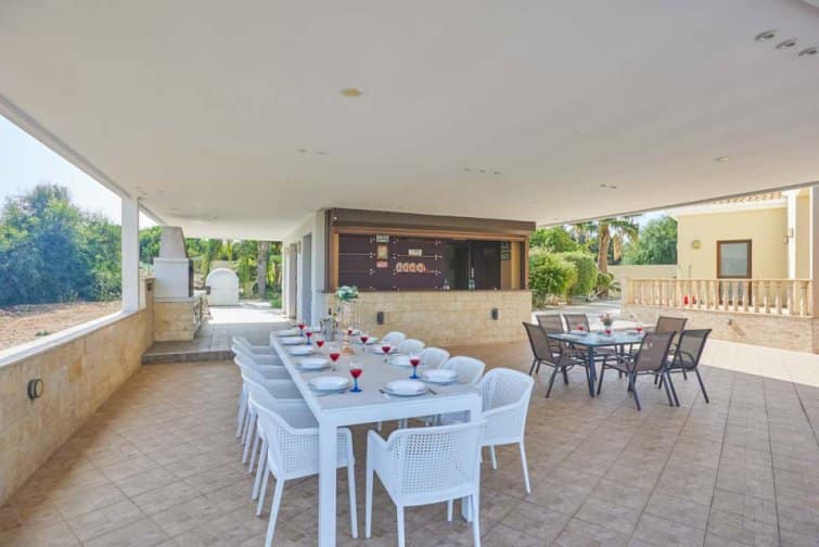 The villa’s rear boasts an enchanting and expansive patio, featuring an outdoor bar and kitchen, BBQ area, and a generously sized pool. A newly constructed pergola offers ample covered and uncovered seating, with space for unforgettable alfresco dining beneath the Cypriot sky.