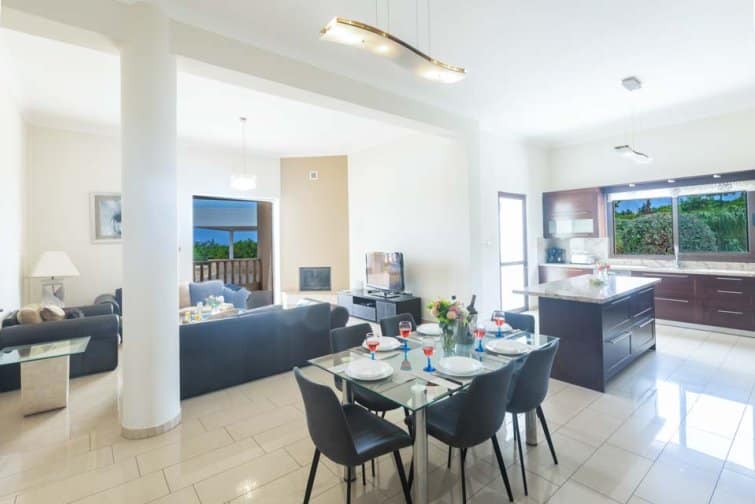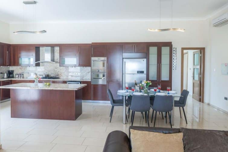 Upon entry, a grand reception hall welcomes you with a sweeping staircase leading to the first floor, accompanied by a full-sized pool table. The ground floor reveals two cosy living areas, complete with plush sofas, a TV space, and expansive patio doors that invite the stunning sea vistas inside. Next to the living space, you’ll find a spacious open plan kitchen and dining area, fully equipped with all the modern conveniences you’ll need including a large fridge freezer, oven, and stovetop.