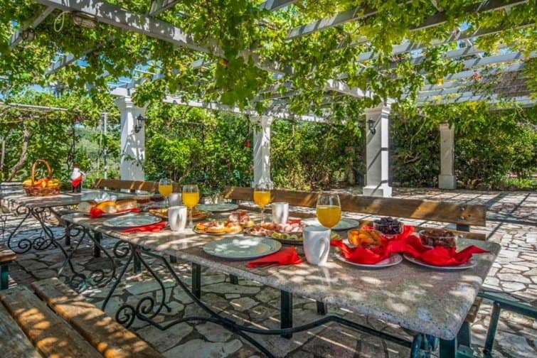 The outdoor dining area, shaded with grape vines, offers the perfect sanctuary to make use of the outdoor grill as you sip a cooling beverage and watch as the sun sinks beyond the horizon.