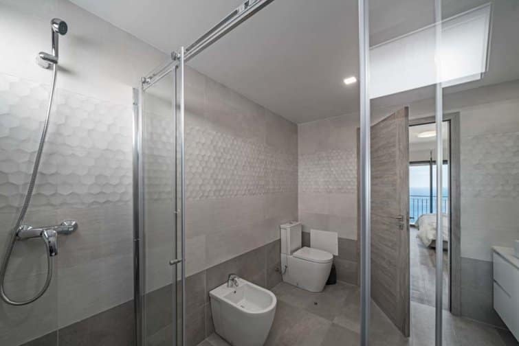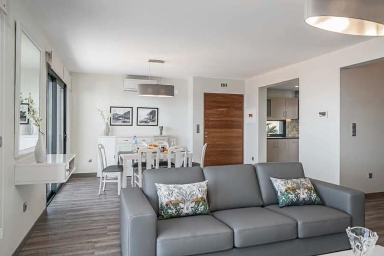 The open-plan living space leads out onto the south-facing balcony, allowing you to take in the most wonderful sunsets. In the kitchen, you’ll find all the appliances and amenities you’d expect, including an induction hob, oven and microwave.