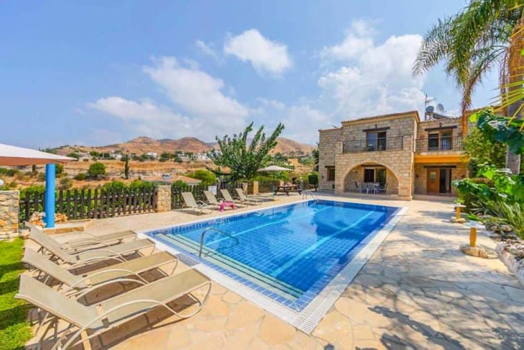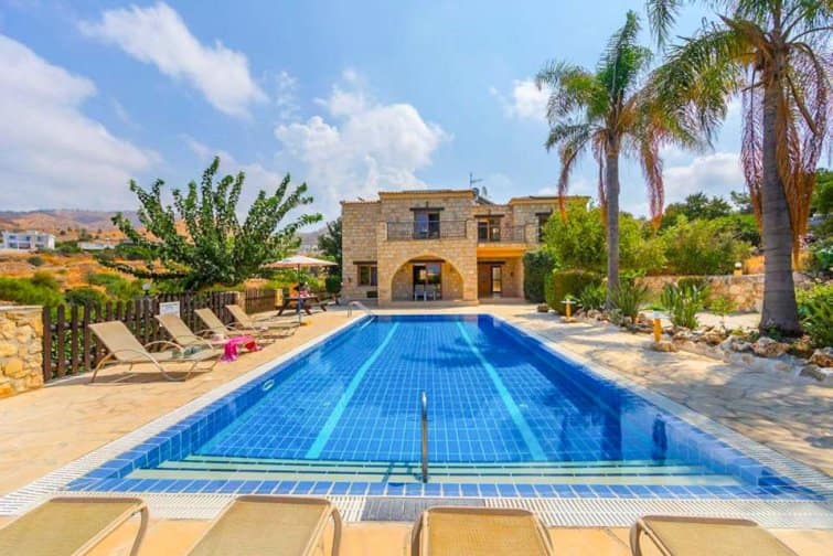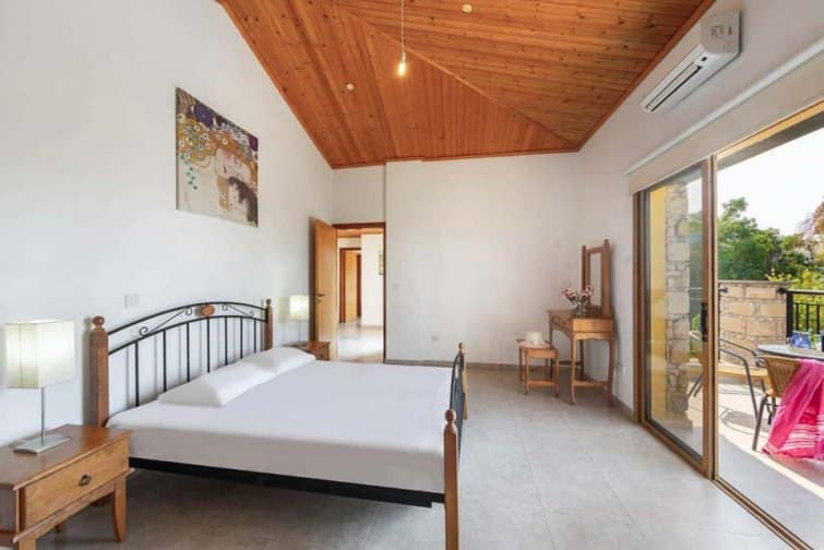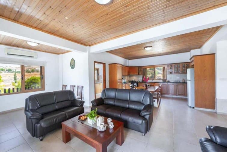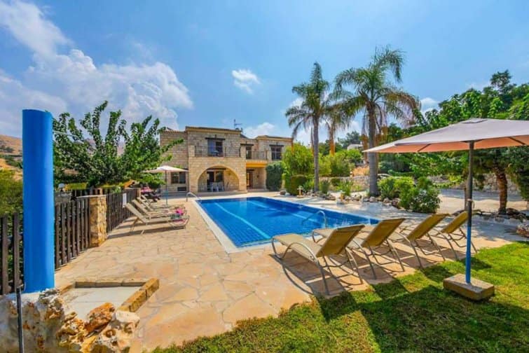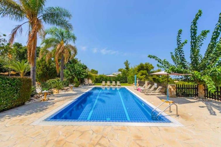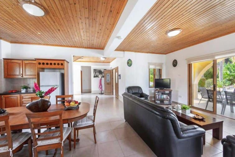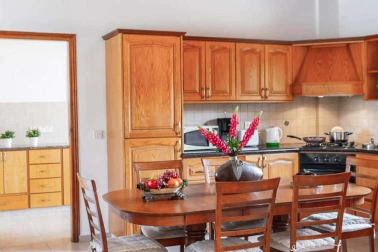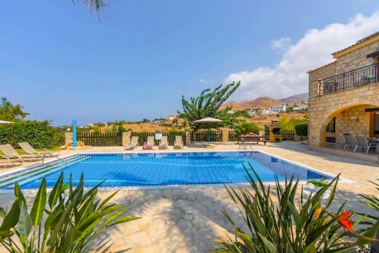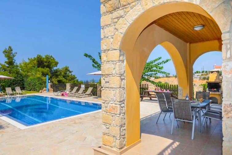 For sunny days poolside, look no further than Villa Androulla. The natural stone terrace boasts an impressive, large pool with shallow steps and bright blue tiles. Lined with reclining sun loungers and tall palm trees, the poolside gives off an exotic vibe. Inside, the villa is homely, featuring homely touches such as a flat-screen TV, a comfortable living area, and a fully equipped kitchen designed with wooden cabinets.