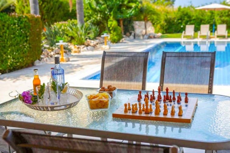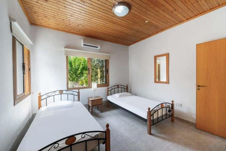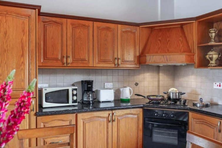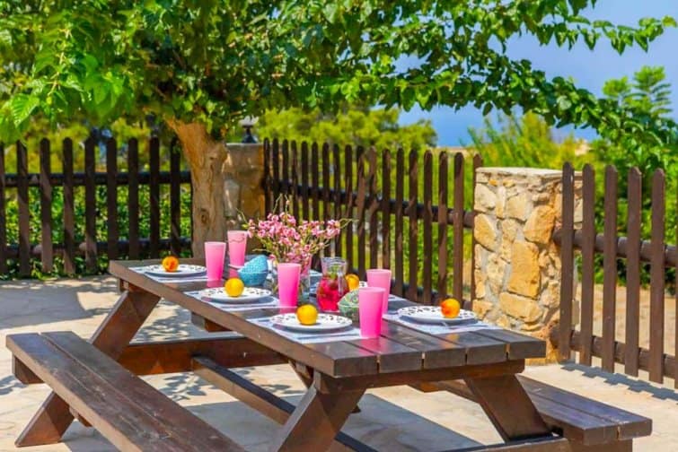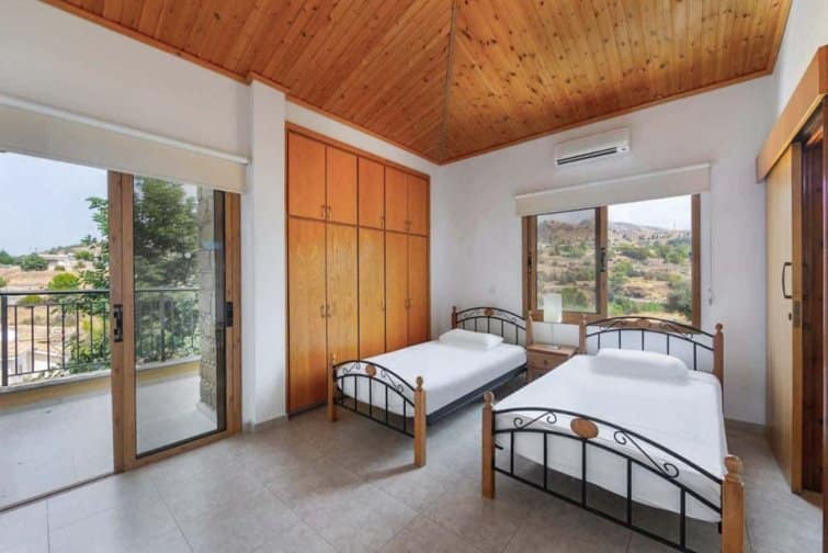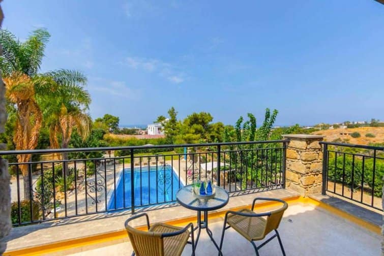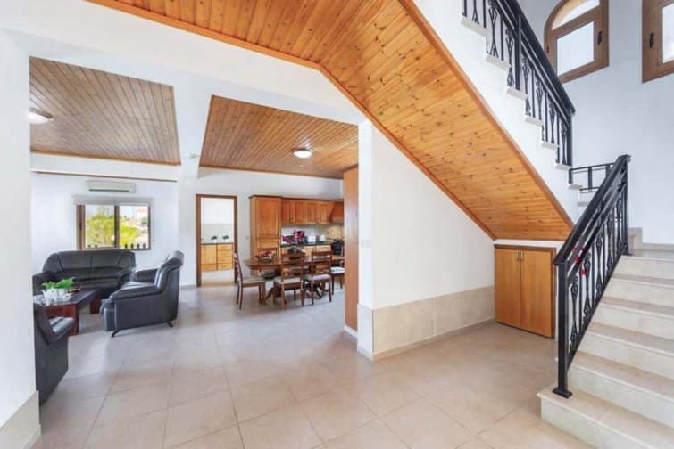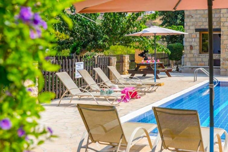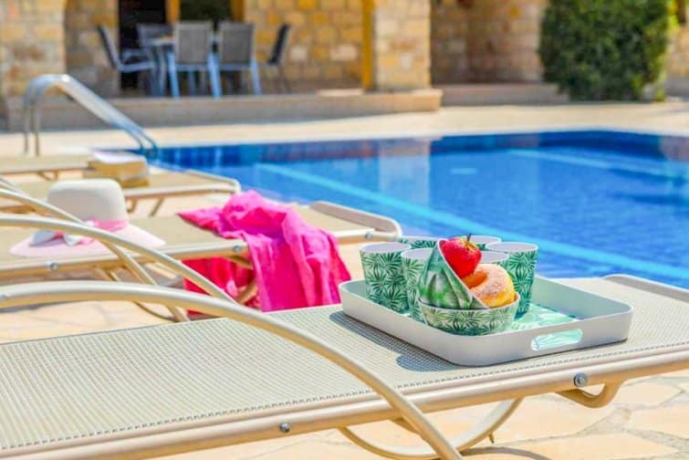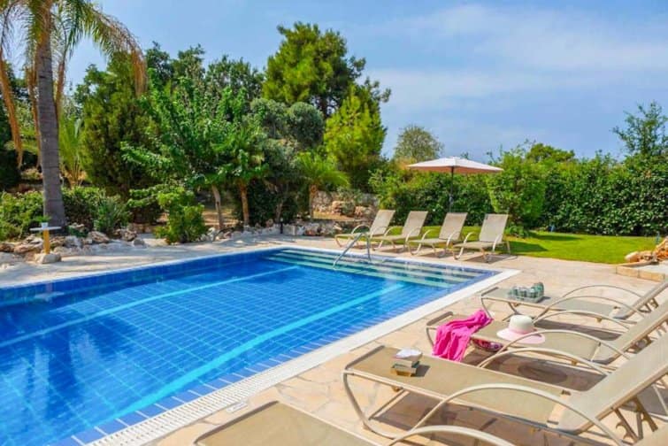 For sunny days poolside, look no further than Villa Androulla. The natural stone terrace boasts an impressive, large pool with shallow steps and bright blue tiles. Lined with reclining sun loungers and tall palm trees, the poolside gives off an exotic vibe. Inside, the villa is homely, featuring homely touches such as a flat-screen TV, a comfortable living area, and a fully equipped kitchen designed with wooden cabinets.