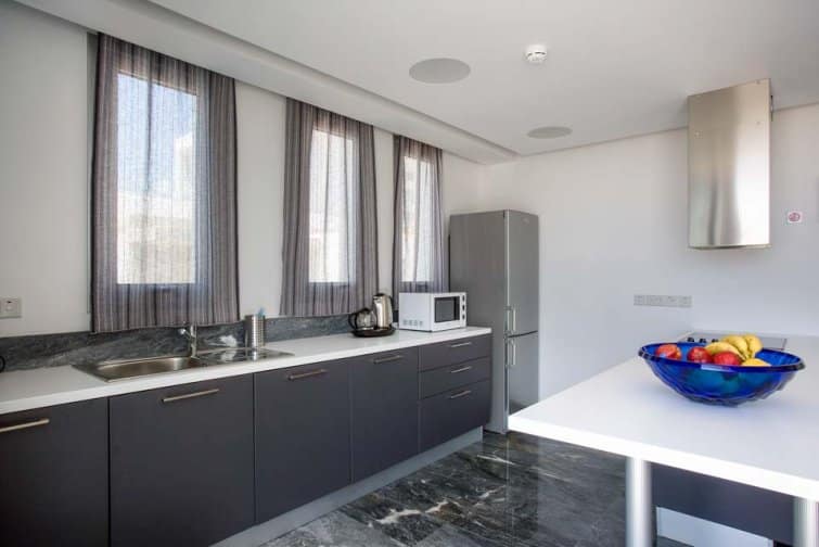 The open plan living area boasts comfortable seating a TV and views of the pool and further out to the sea, a fully equipped kitchen will ensure you have all means to prepare your own food at your own convenience along with a choice of indoor or outdoor dining options.