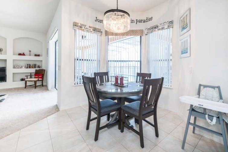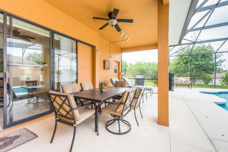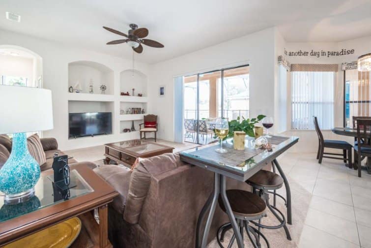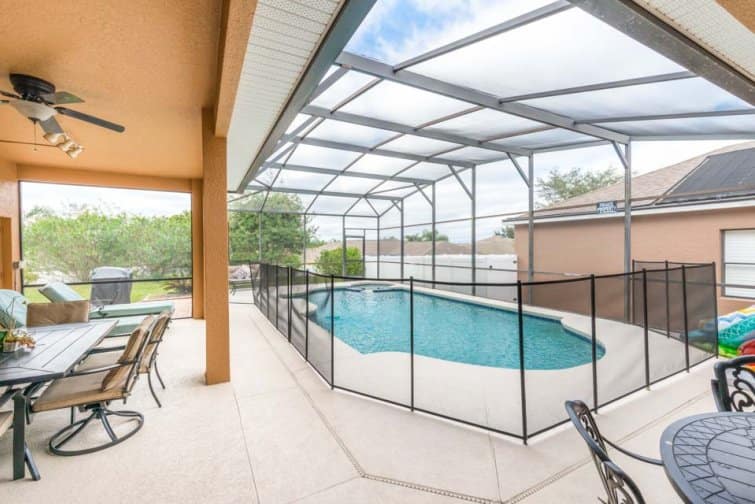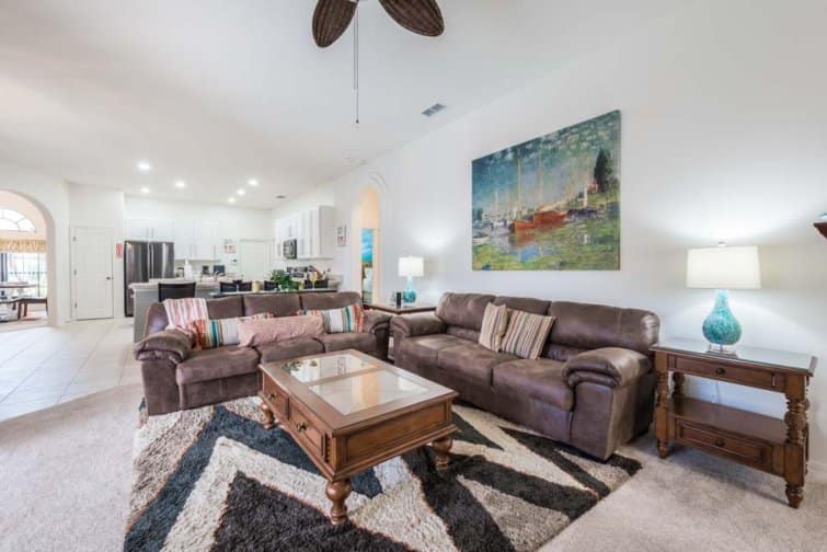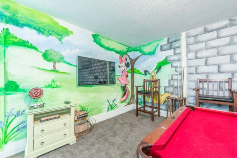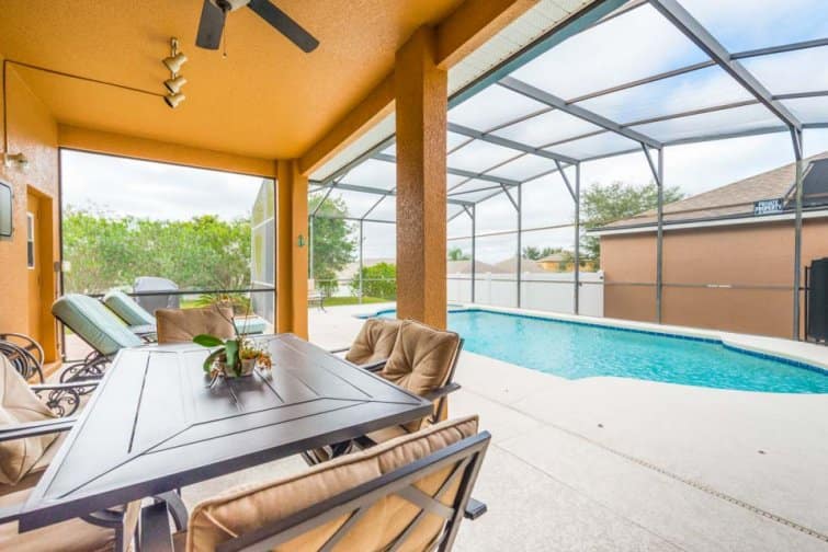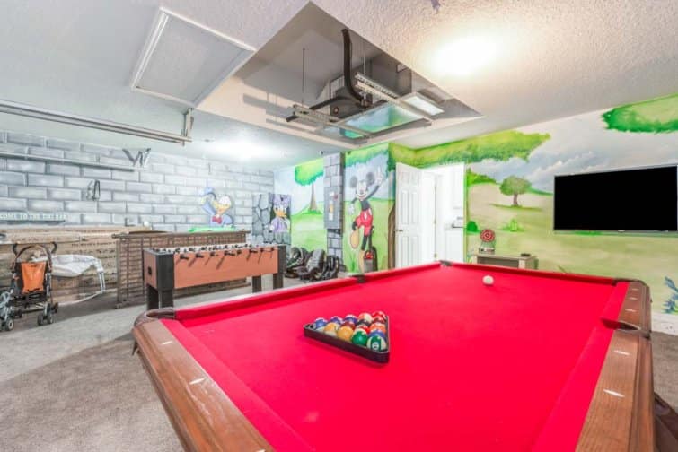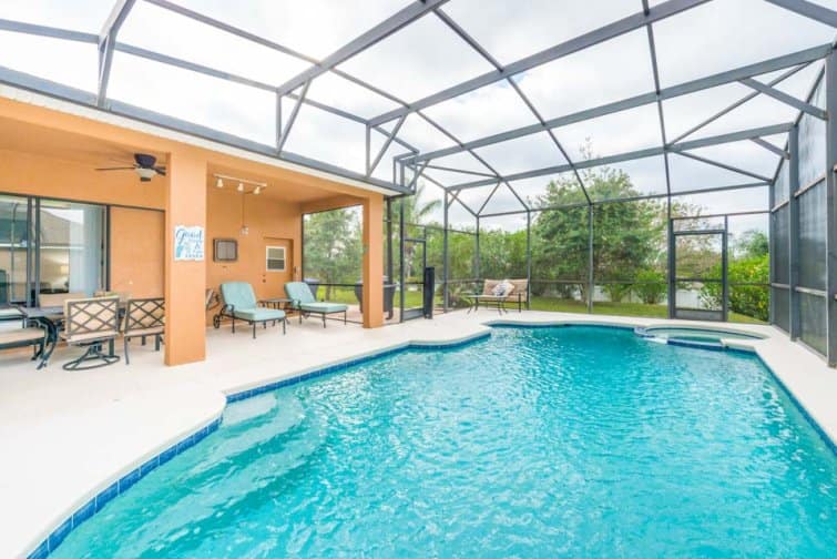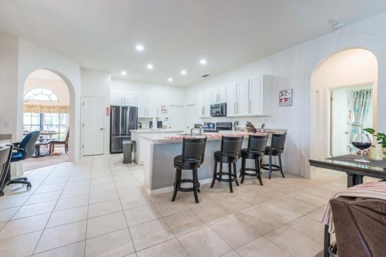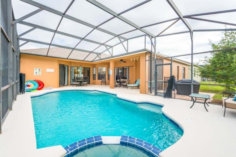 This 5-bedroom 3 bath home is located in Legacy park, just 15 minutes from Disney World and 30 minutes from Universal Studios and SeaWorld. This spacious single-story villa sleeps 8 comfortably. There are 2 separate living and dining spaces as well as an air-conditioned games room with pool table, foosball and TV. The west-facing pool area with a private pool with spa has a wide range of seating options as well as a shaded lanai and 2 outdoor dining areas. This villa also benefits from complimentary pool towels and a food and drinks welcome pack upon arrival.