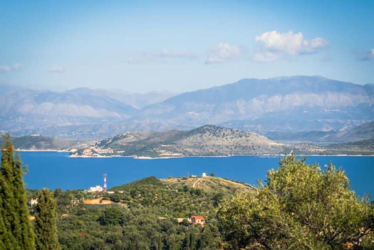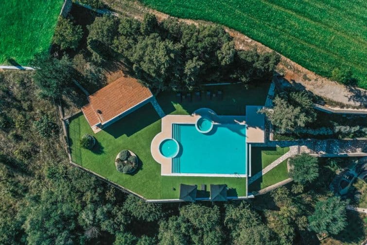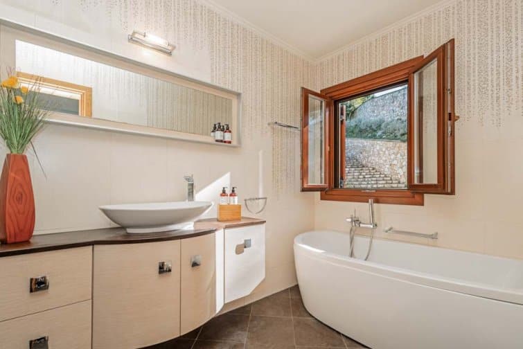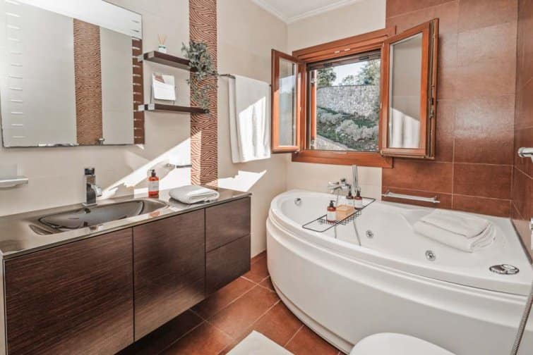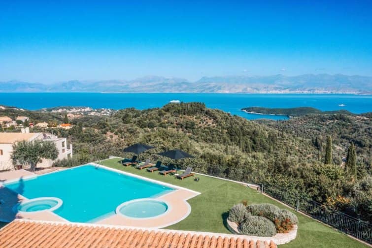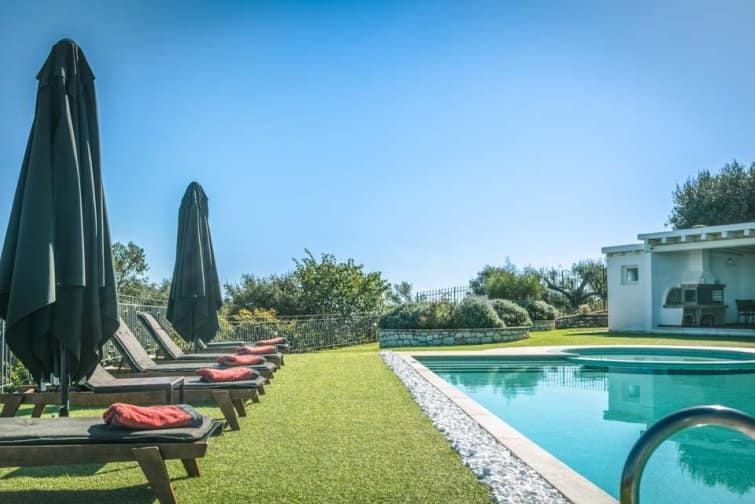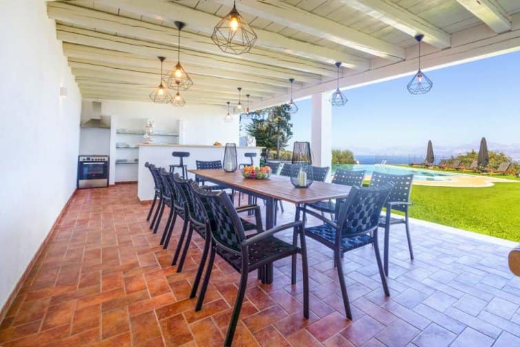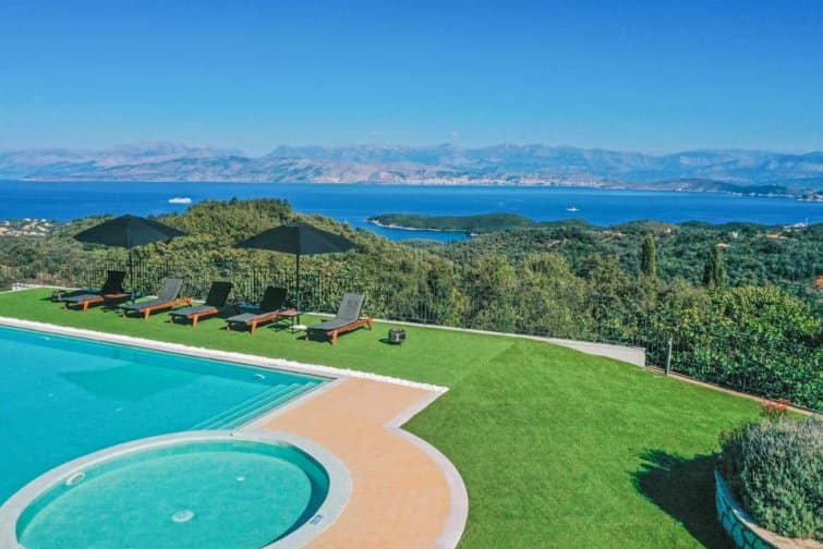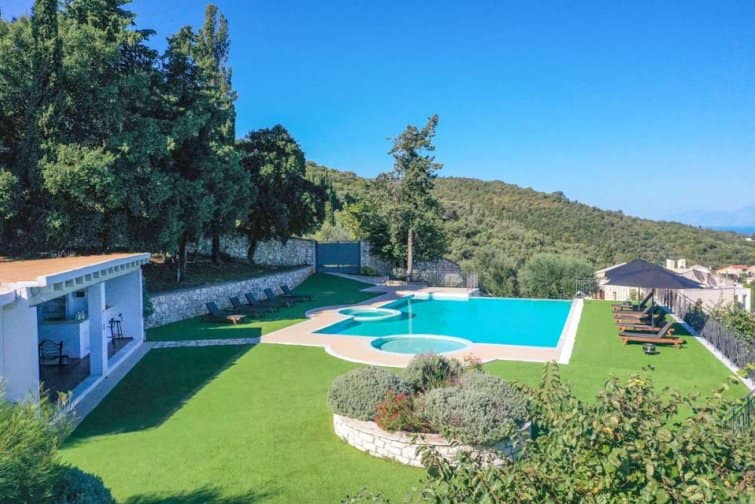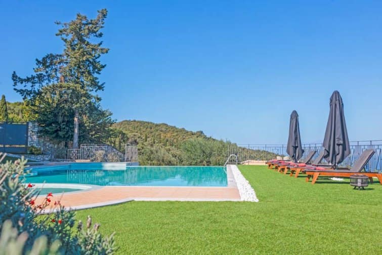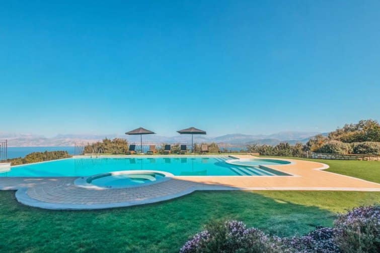 The lower ground floor of Villa Claire Kassiopi is home to a fully equipped kitchen, another open plan living space with access to the beautiful gardens, a games room, a well-equipped gym, the hammam sauna and steam room, a shower room with a massage shower and a double bedroom with an ensuite shower room. Guests staying in this room enjoy gorgeous garden views. The swimming pool is on a higher level with it’s whirlpool. It is surrounded by loungers, grassy banks, gorgeous colourful planting and the most amazing views. Just beyond the pool is an excellent shaded alfresco dining and cooking area, with a fabulous kitchen and bar area.