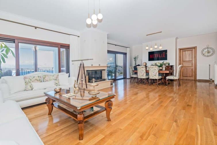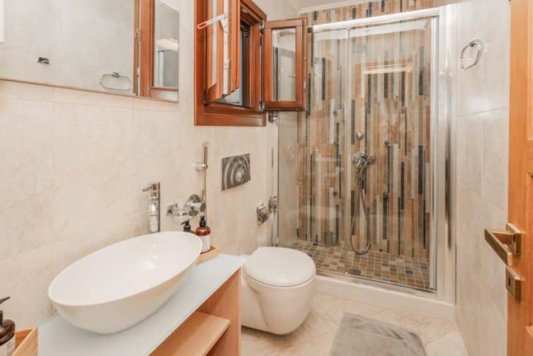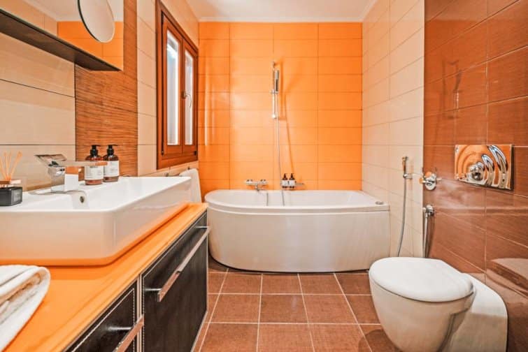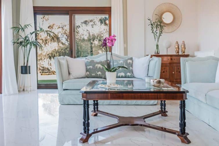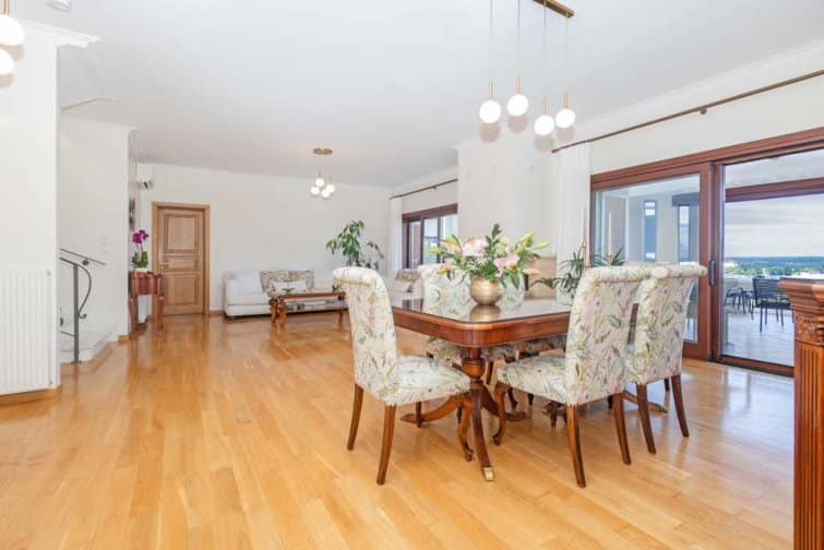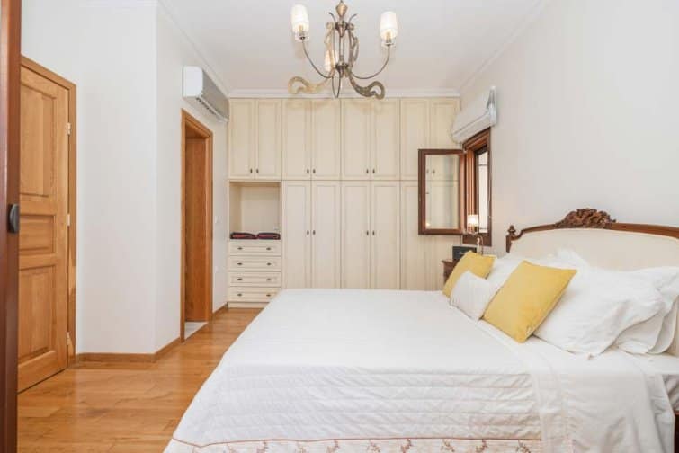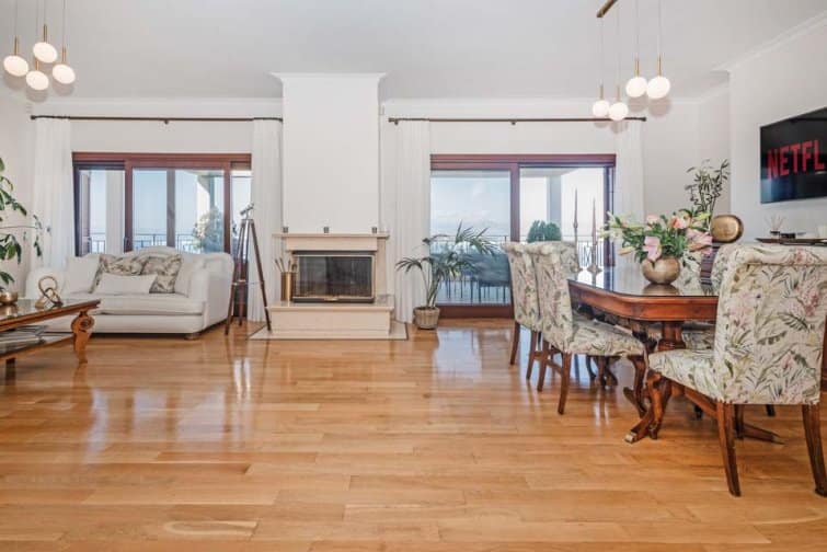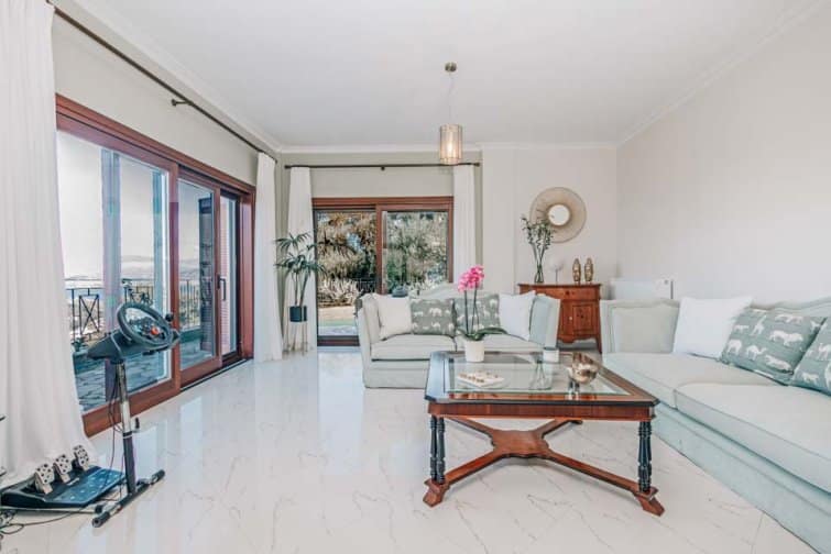 The ground floor of the villa is home to its spacious hallway, an open plan living space with a dining area and access to a huge terrace, a kitchen and two bedrooms, both with ensuite bathrooms. In beige and brown tones, the living room is traditional in feel with a modern feature fireplace, chandeliers and a warm, welcoming ambience. One of the double bedrooms enjoys an ensuite with a whirlpool bath as well as a terrace and spectacular sea views. The second enjoys an ensuite shower room with a hydro massage shower and a terrace, again with glorious sea views.