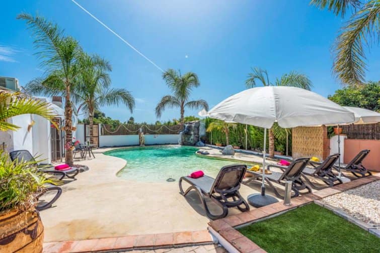 Outside, the enclosed pool terrace has been transformed into a beach lovers paradise with tropical palm trees, impressive water features and authentic ‘Caribbean’ vibes. Sun loungers, umbrellas, and an al fresco dining area provide a relaxing and peaceful holiday all year round.