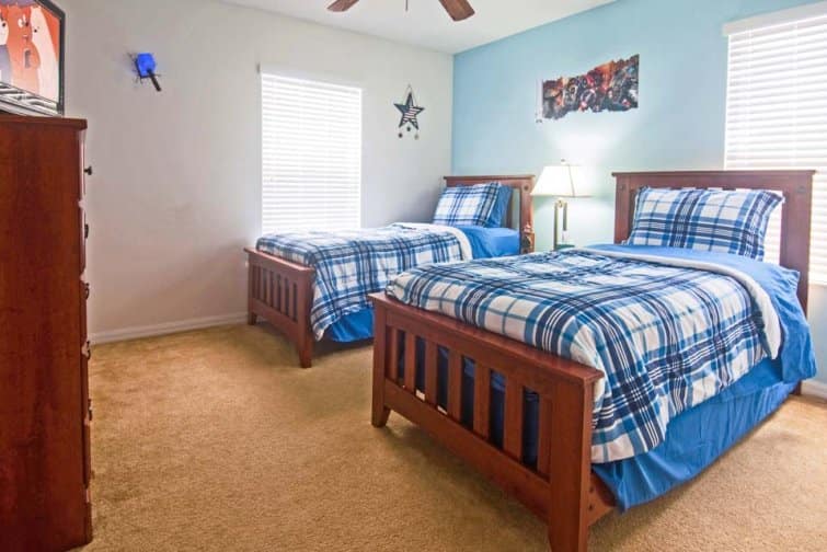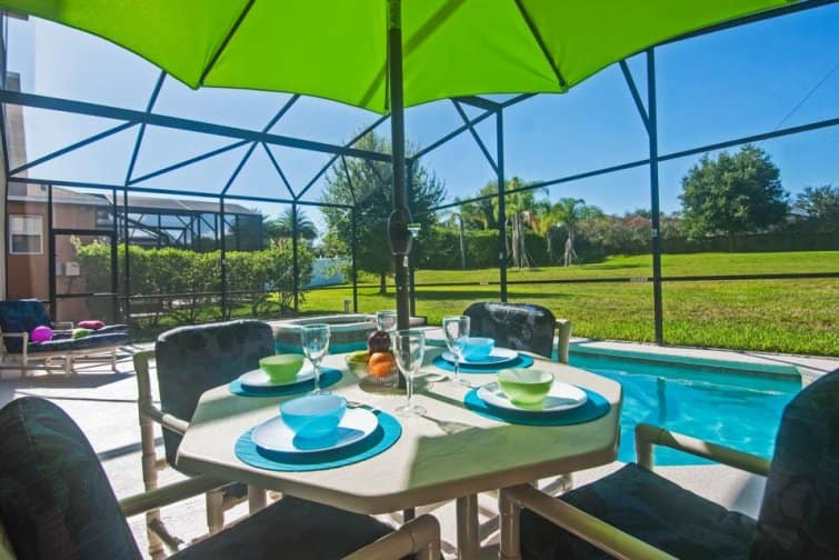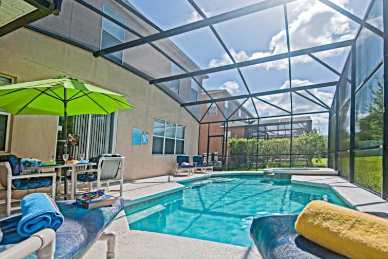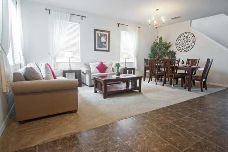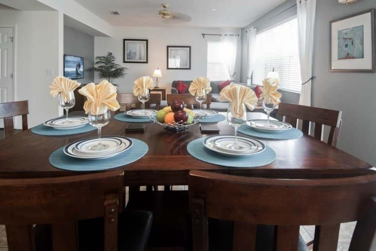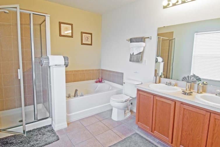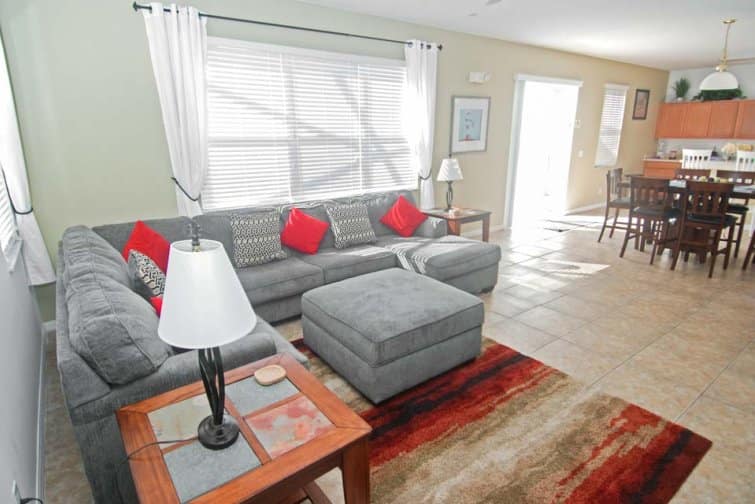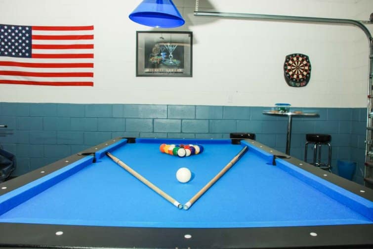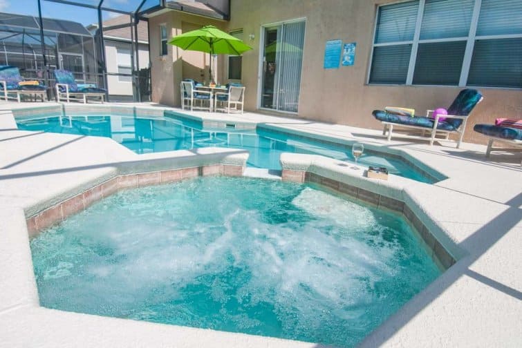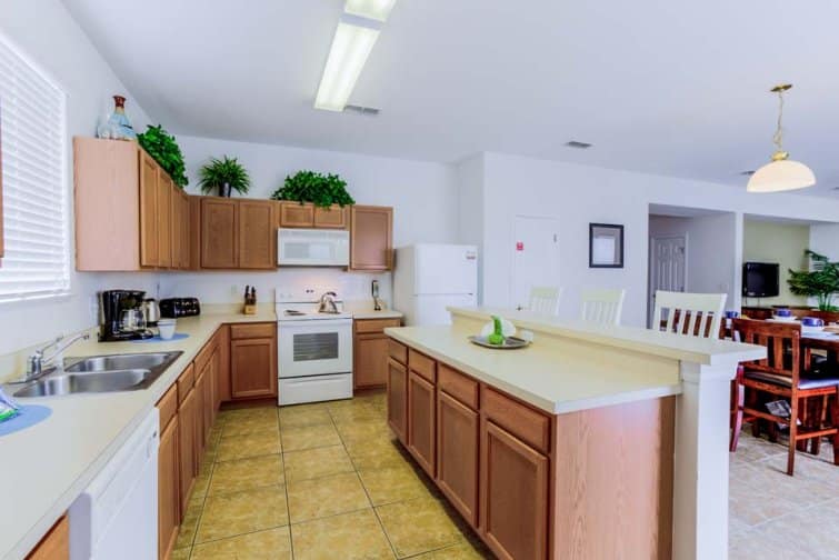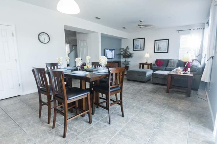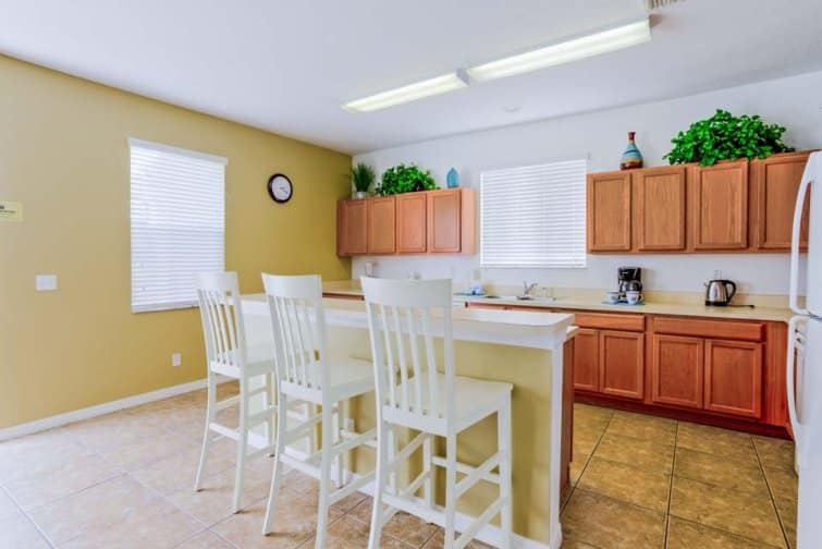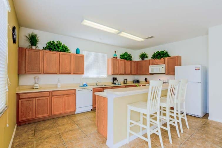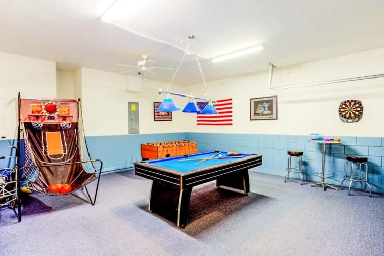 Disney Retreat lives up to its name, offering an idyllic escape just a hop away from the busy Disney theme parks and is located in the Legacy Park Resort. As you step into the villa, you’re greeted with an inviting living area designed with a minimalist touch, with plush sofas and contemporary decor. With not one but three family lounges, including a loft area upstairs with a games console, there’s enough space for the whole family to stretch out. If you’re in the mood for a little friendly competition, make a dart to the action-packed games room, featuring a pool table, foosball, dartboard, and an arcade game for endless family fun. With 5 bedrooms, it’s the perfect size for larger groups or multiple families traveling together. The kitchen is a modern masterpiece, full of high-end appliances and a breakfast bar if you need to stop for a quick bite.