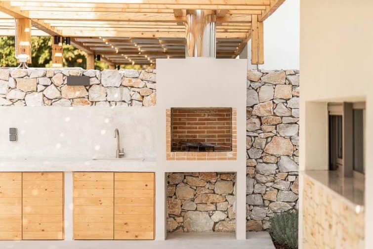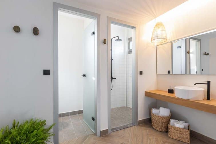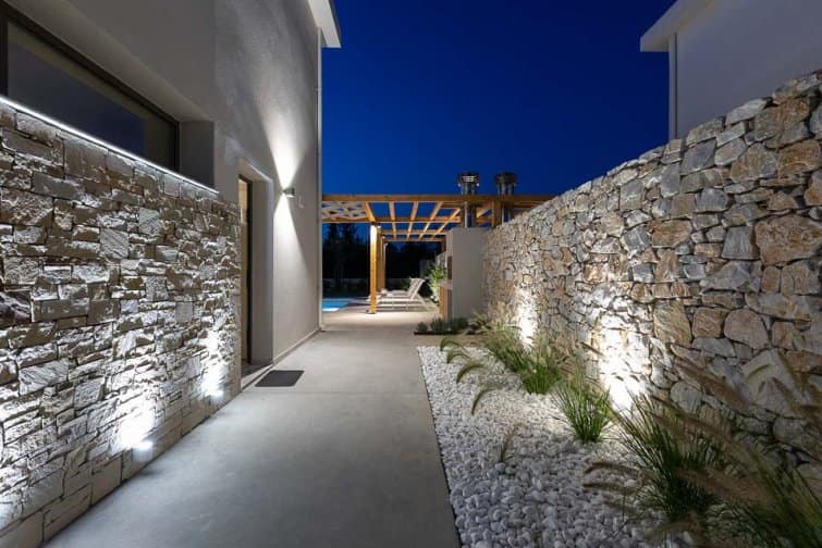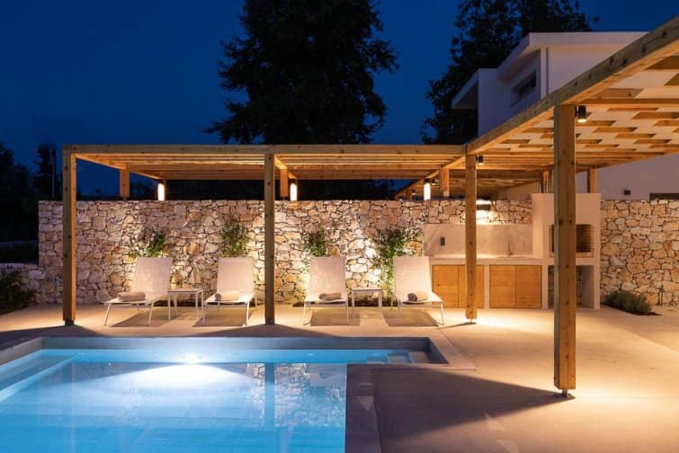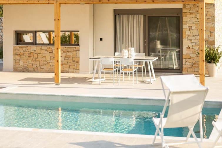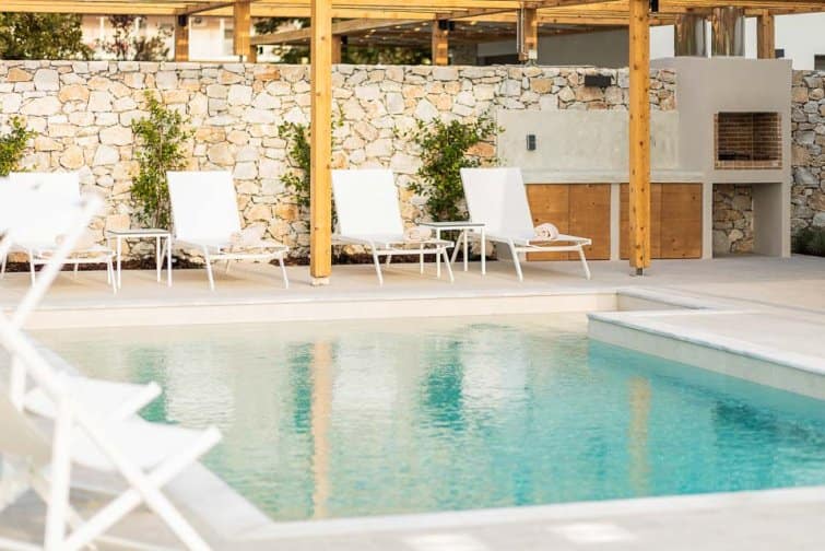 The exquisite architecture and modern embellishments provide an opulent encounter amidst the charming backdrop of a traditional Greek surroundings. Suitable for four guests, occupying two bedrooms and three bathrooms, it is a great villa for a family or friends. The ground floor features a light, open plan lounge, dining facilities and kitchen, which lead out through sliding doors onto the shaded terrace area, where you will find alfresco dining facilities. Further out bask by the turquoise pool on one of the sun loungers, as the night draws in, why not cook up some local produce on the brick built BBQ and enjoy a glass on wine as the sun sets.