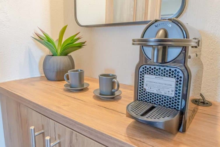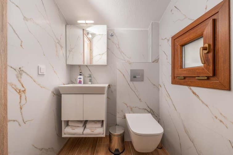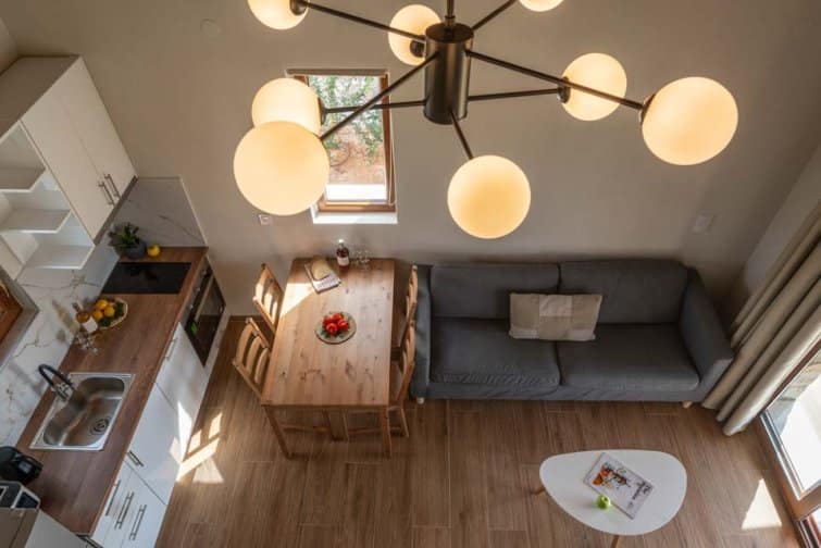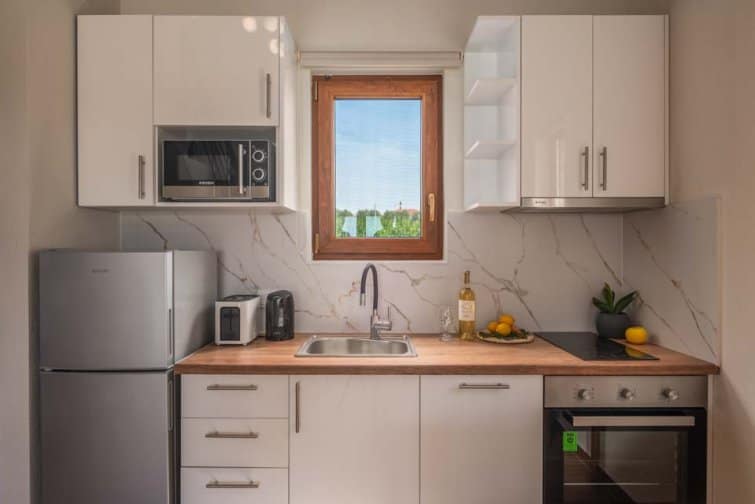 Each villa is thoughtfully designed and features a ground-level bedroom with a double bed and a bathroom. The upper level of the villa houses another bedroom with a double bed and an en-suite bathroom. The living room, located on the ground level, includes a comfortable sitting area, a dining space, and a fully equipped kitchen. The kitchen is furnished with modern amenities, such as an electric oven and stove, microwave, toaster, water boiler, dishwasher, and a fridge with a freezer. Additional conveniences provided for guests include a safe deposit box (suitable for laptops), a washing machine, free Wi-Fi, and satellite TV.