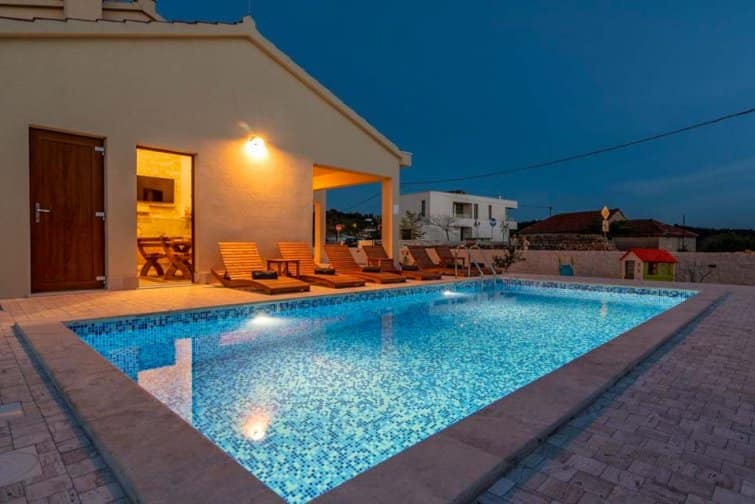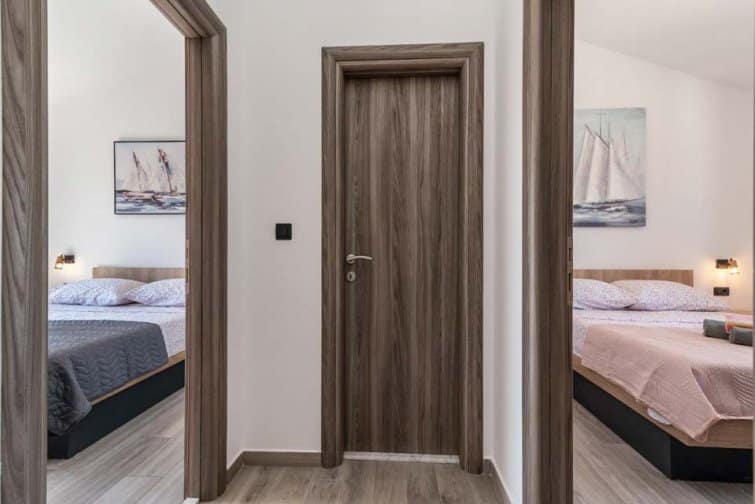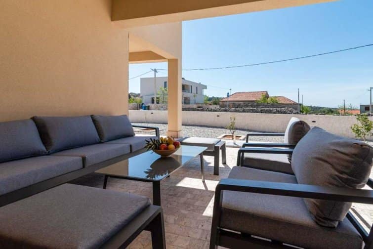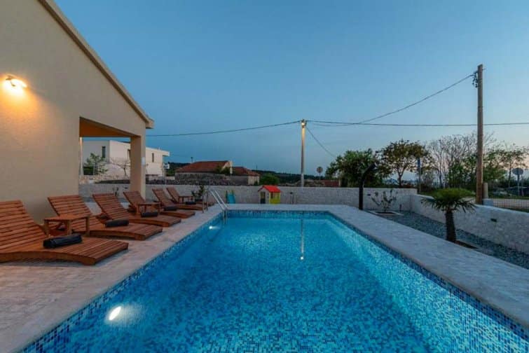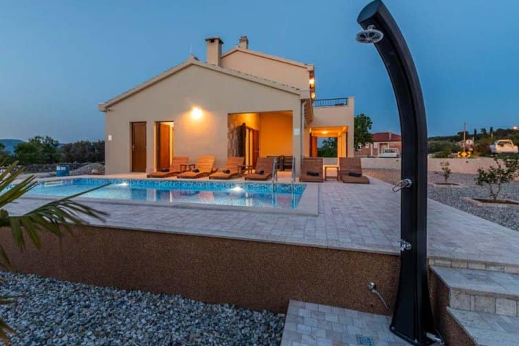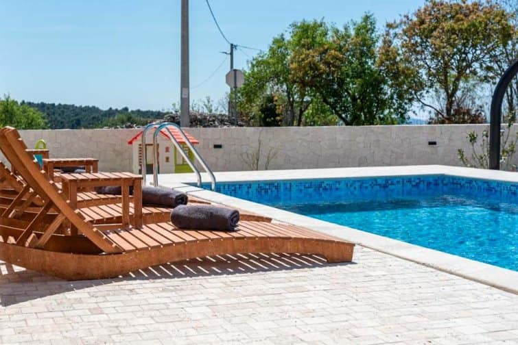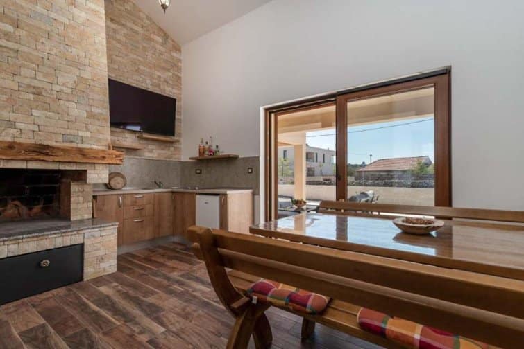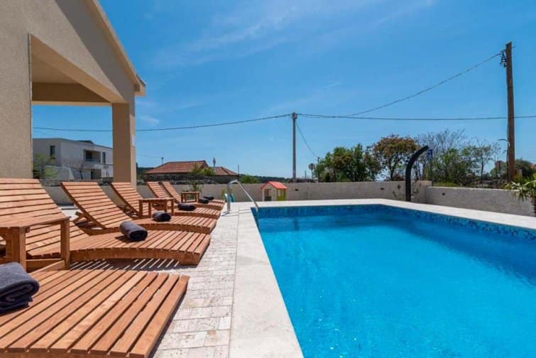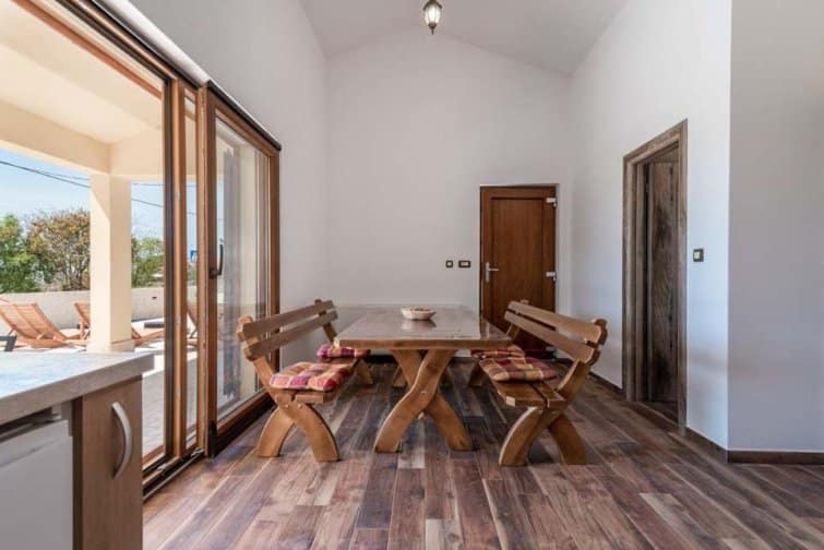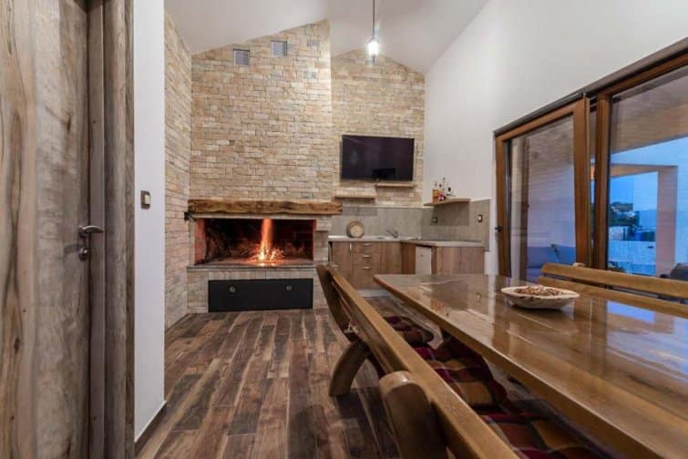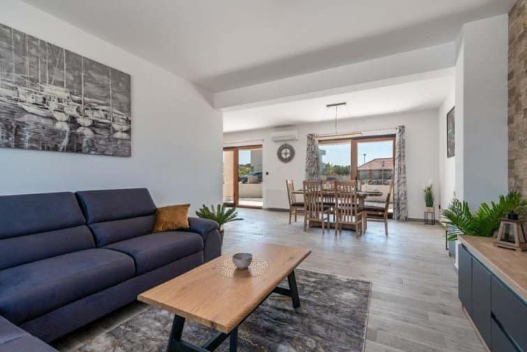 The ground floor enjoys an open-plan living space, ideal for sociable living. Natural sunlight streams through the plentiful windows with two sets of doors opening onto the terrace. The cosy veranda features plush sofas where you can spend afternoons reading a book whilst the sparkling swimming pool is the star attraction, inviting you to take a refreshing dip and soak up the gorgeous Croatian sunshine. Lined with smart sun loungers, bask in the sun and unwind.