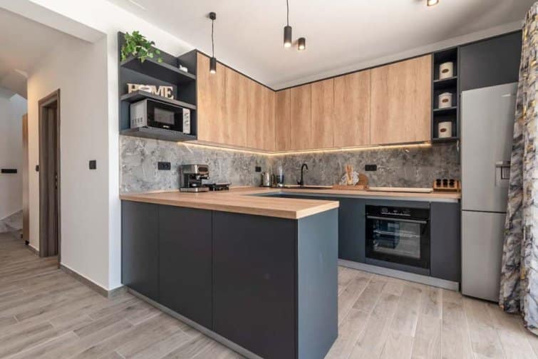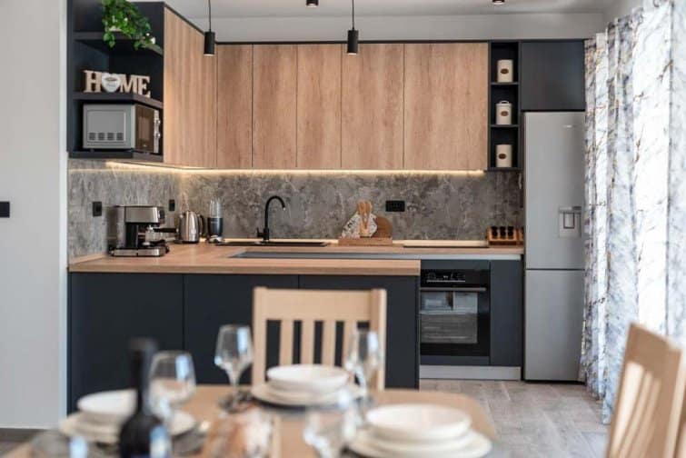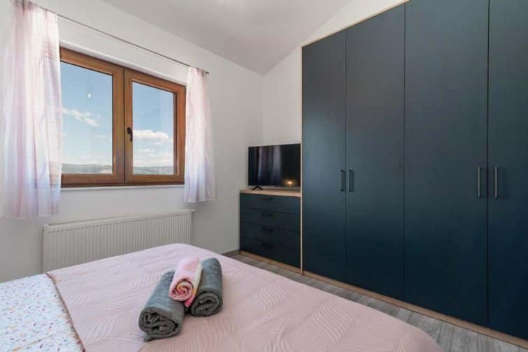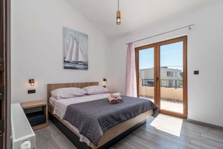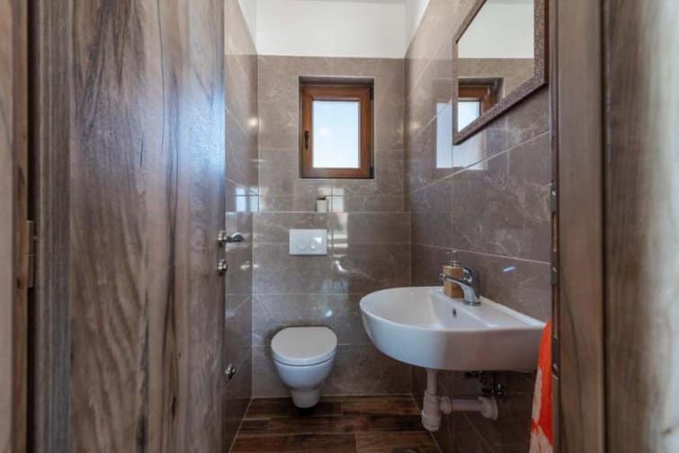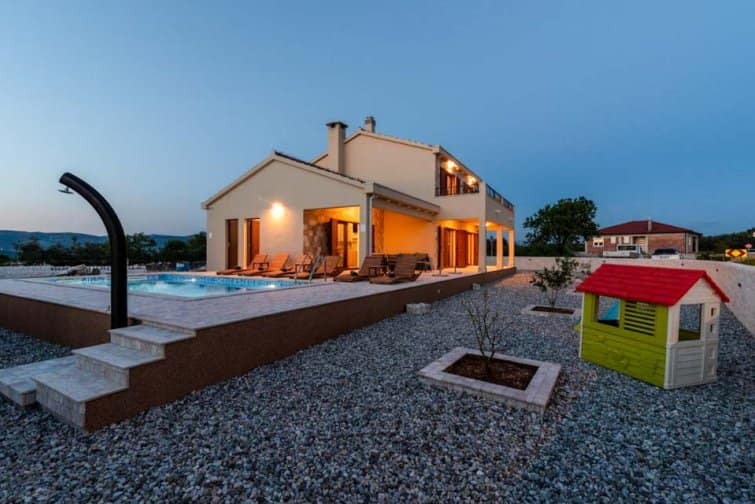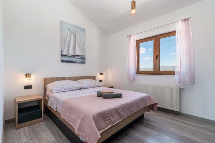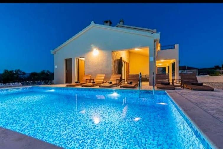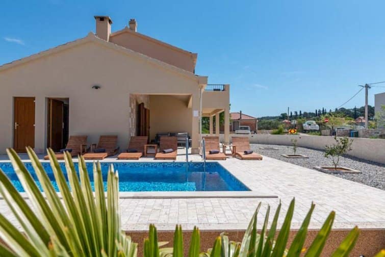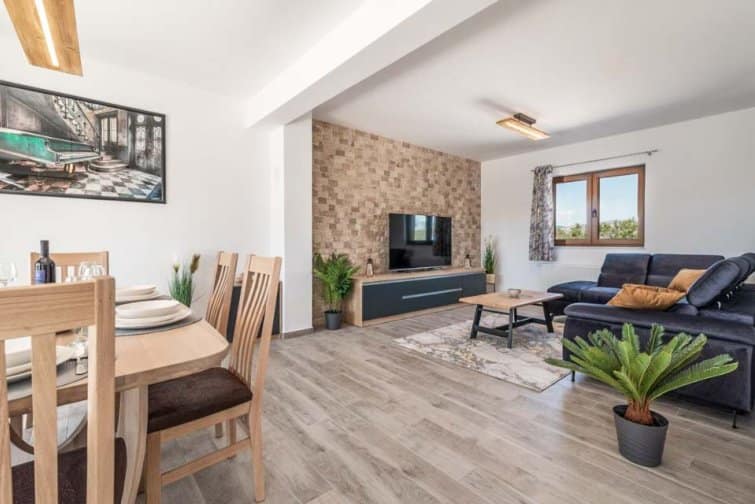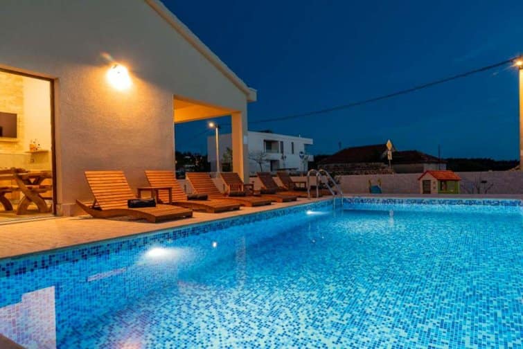 The ground floor enjoys an open-plan living space, ideal for sociable living. Natural sunlight streams through the plentiful windows with two sets of doors opening onto the terrace. The cosy veranda features plush sofas where you can spend afternoons reading a book whilst the sparkling swimming pool is the star attraction, inviting you to take a refreshing dip and soak up the gorgeous Croatian sunshine. Lined with smart sun loungers, bask in the sun and unwind.