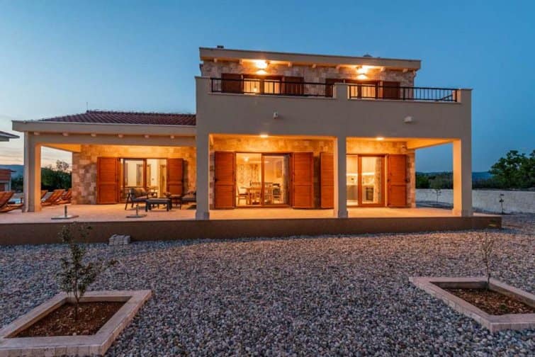 With the picturesque countryside, numerous beaches, and the historic city of UNESCO Trogir all within walking distance, Villa Half Moon has something for everyone. Situated on the island of Čiovo connected to the mainland by bridges, the panoramas here are truly phenomenal. Lush green hills stretch into silhouettes on the horizon, which provide a backdrop to the turquoise shimmer of the Adriatic Sea below. Villa Half Moon is an enchanting mix of old and new, fusing a traditional rustic feel with a chic and colourful interior. Crafted from light-coloured stone and finished with pine wood shutters and a terracotta-tiled red roof, this incredible villa blends seamlessly into its authentic surroundings.