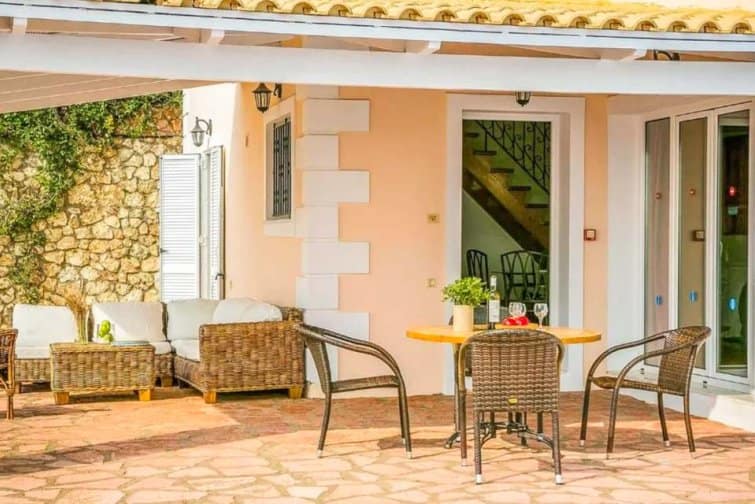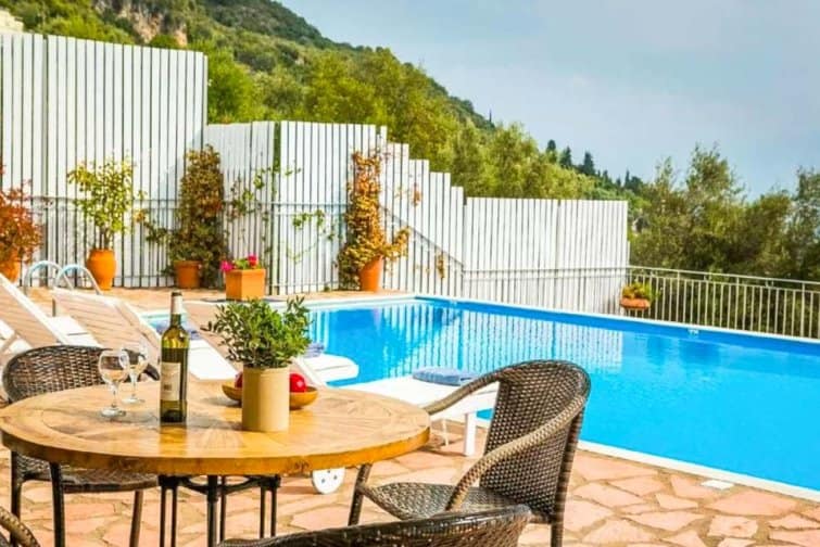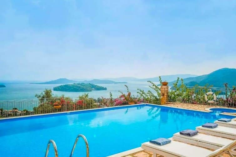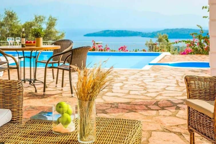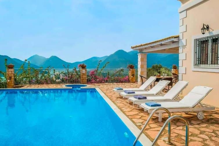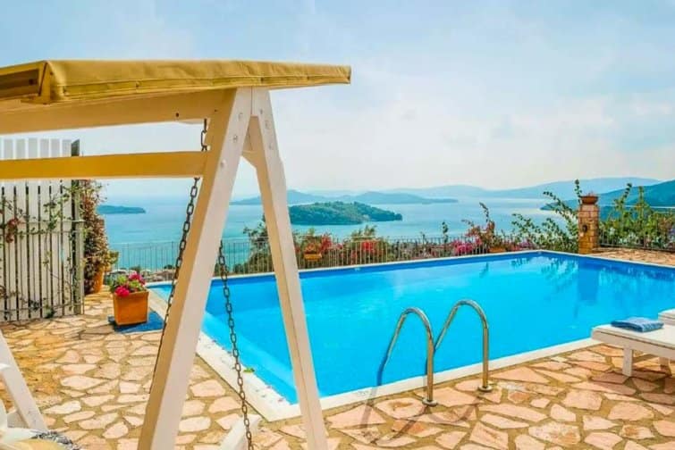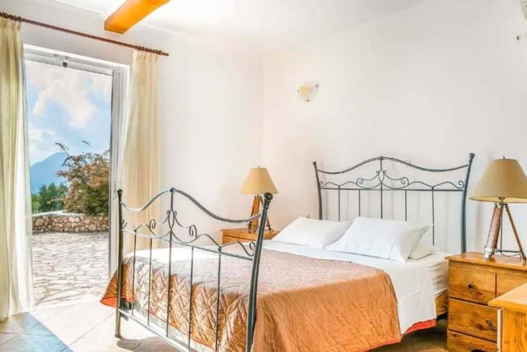 Outside, panoramic views surround the villa. Nestled among the lush green rugged landscape, Villa Irida offers incredible views of mountain peaks and the clear turquoise sea below. With a private swimming pool, sun loungers, and an impressive outdoor dining area with a built-in barbeque, you’ll cherish every moment spent in this paradise.