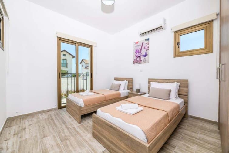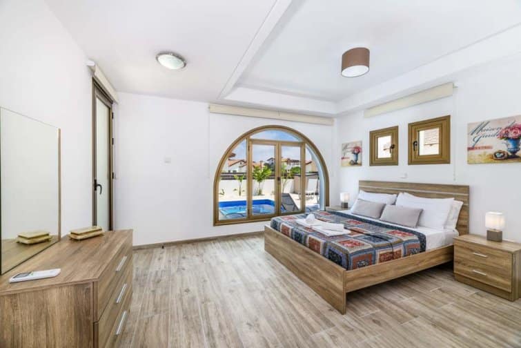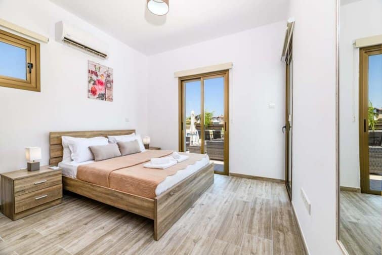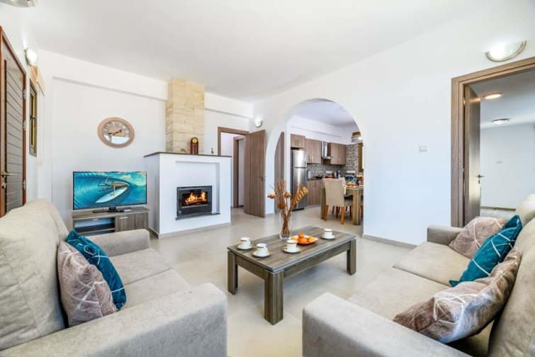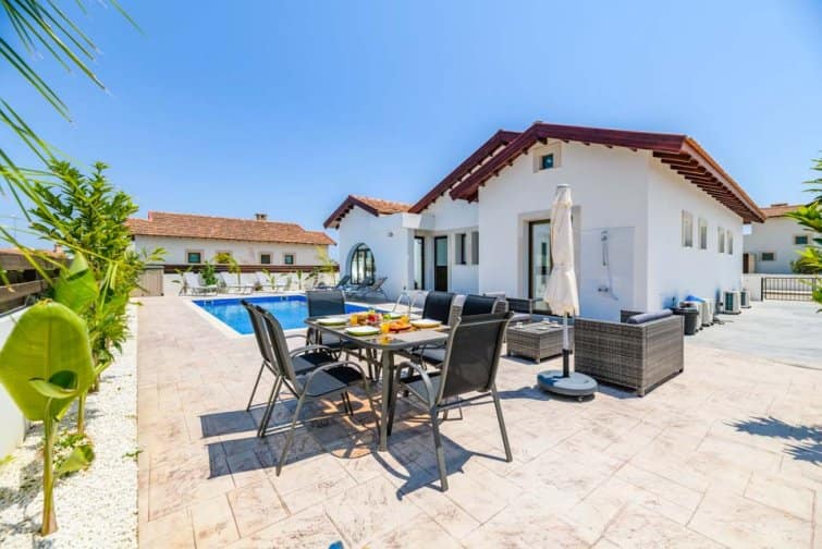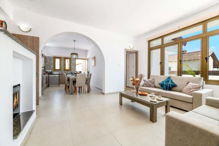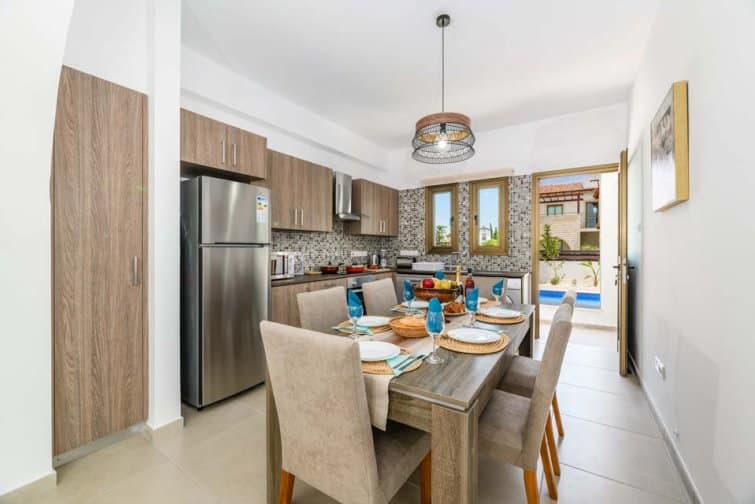 Discover the refined furnishings of Kymma Villa across three spacious bedrooms- two opulent doubles and one twin room- with access to free Wi-Fi throughout. Under the arches of your outdoor sanctuary, discover a newfound haven of alfresco indulgence. Whether you’re sipping a sunset cocktail in one of the plush sofas or enjoying an evening meal under the stars, Kymma Villa sets the scene for creating unforgettable memories together. During the days, take a dip in the shimmering swimming pool or recline on one of the modern sun loungers adorning the terrace.