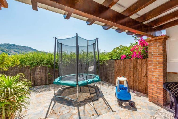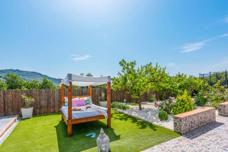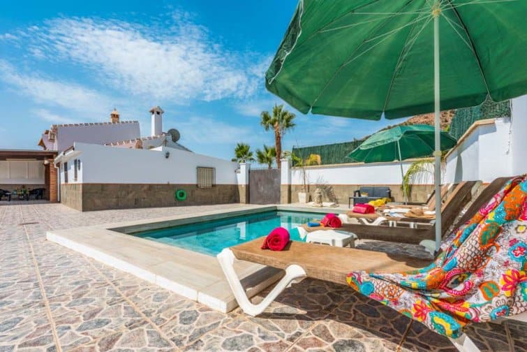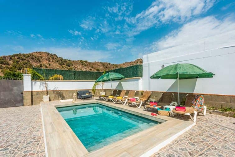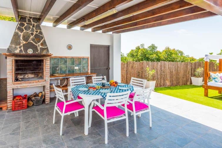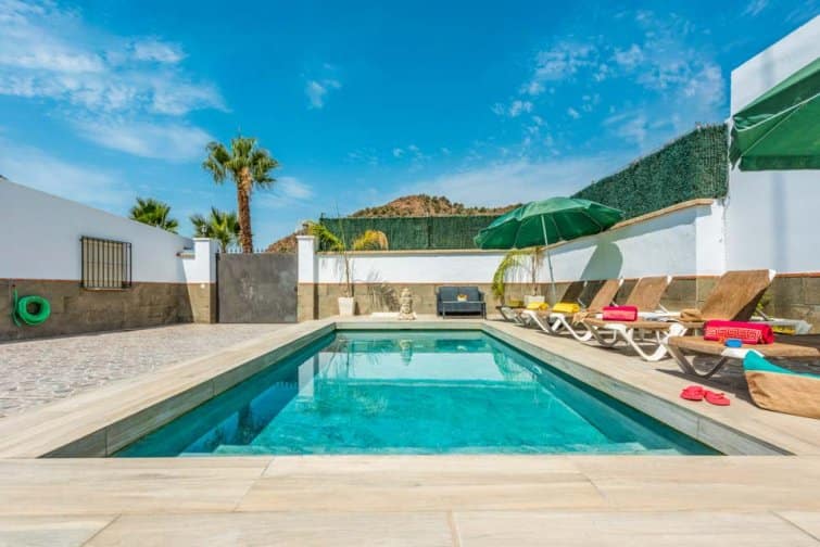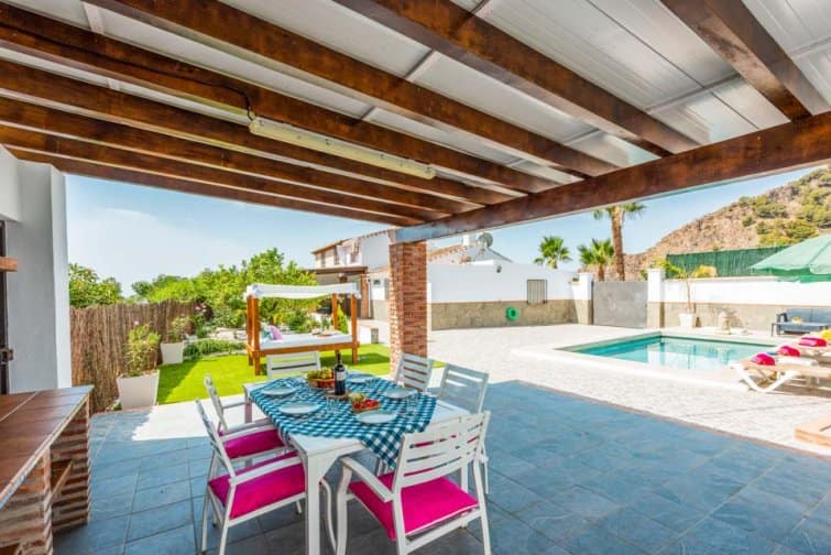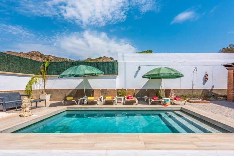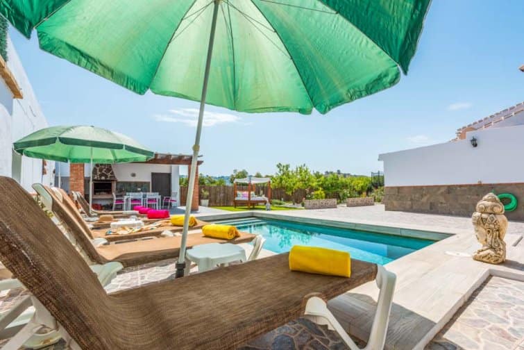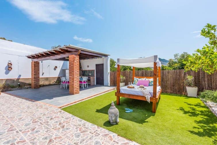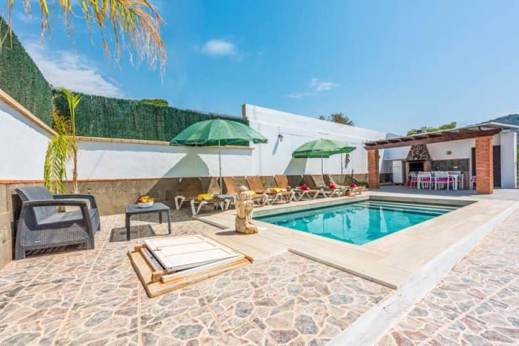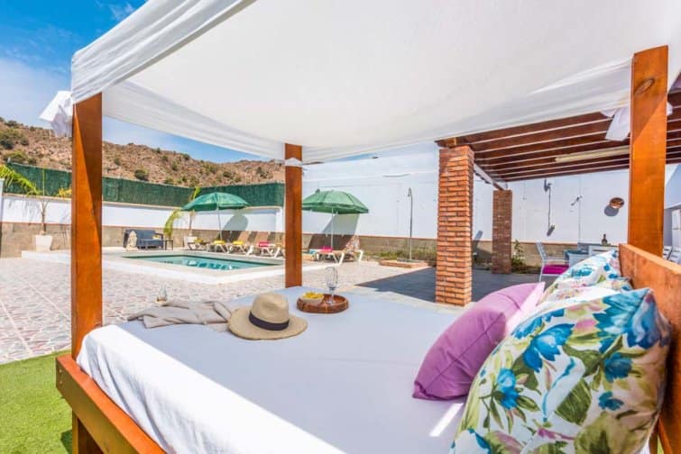Outside, the private swimming pool is framed by sun loungers and umbrellas alongside a four-poster bed ideal for getting cosy with book while soaking up the sun. Under the shaded pergola, you will find an alfresco dining area where you can prepare and cook meals on the barbeque.