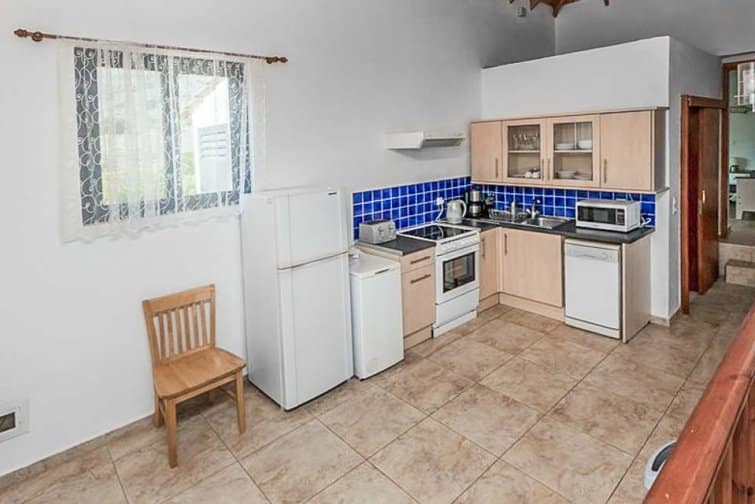Sleeping up to 4 guests, the air-conditioned villa is spacious yet cosy, offering plenty of home comforts designed to make your stay unforgettable. The lounge area is equipped with plush sofas and large windows, bathing the room in golden light and offering views across the glittering coastline. The kitchen area is modern and fully equipped with a range of amenities including a washing machine and dishwasher.