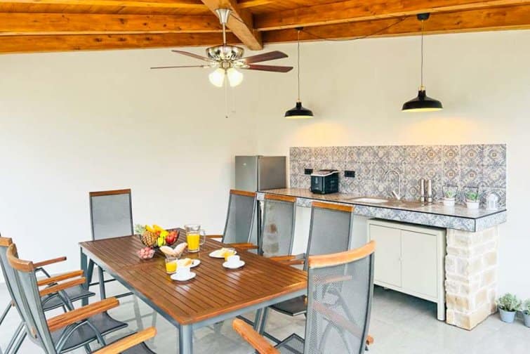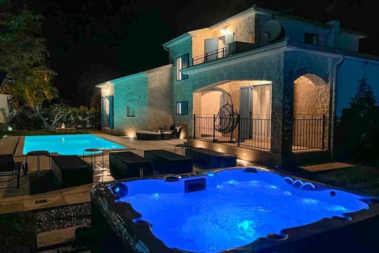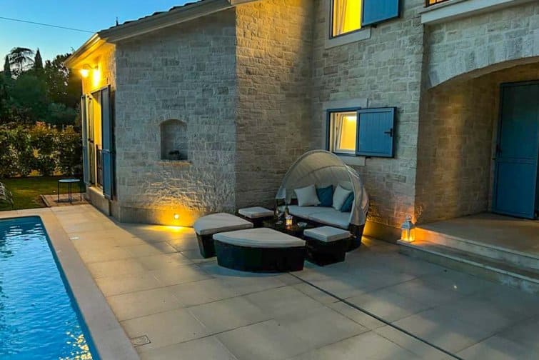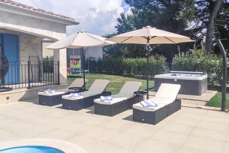 Outside, an enclosed garden adorned with an ancient olive tree sets the stage for alfresco living. Indulge in the bubbling hot tub after a day exploring nearby Novigrad, or bask in the sun on lavish loungers and top up that summer glow. The sumptuous day bed and nearby egg chair both allow visitors to finally delve into that captivating novel they’ve been meaning to read for so long. A terracotta-tiled summer kitchen, complete with a gas BBQ and modern dining table, offers a cool respite from the Croatian sun, while entertainment awaits with table tennis and a trampoline for the young and young at heart.