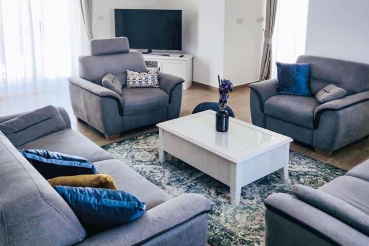 On the ground floor, two spacious king-size bedrooms beckon, each opening via patio doors onto the inviting terrace and pool area. With divan bases and box-spring mattresses, restful nights are guaranteed. Ascend to the first floor to discover two more king-size bedrooms, each with ensuite showers and decorated with soothing soft hues of a pastel palette, creating serene vibes for ultimate relaxation.