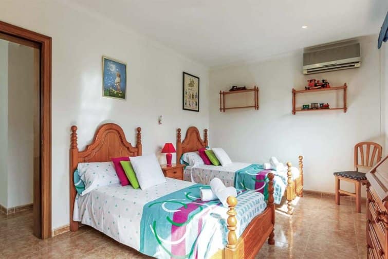 The villa itself features a newly constructed pool on the side of the house, providing a convenient alternative for those who prefer not to walk the 500 meters to the beach. Furthermore, a shaded terrace offers a pleasant spot to relax and enjoy a cooler view of the pool. Inside, the villa offers a comfortable, bright, and spacious living space, comprising four air-conditioned bedrooms, a living room with access to the front terrace, and a well-equipped kitchen. The downstairs bedroom is furnished with a pull-out single bed, making it ideal for children or as a single bedroom. Upstairs, there are two double bedrooms and a twin bedroom, providing ample accommodation options for guests.