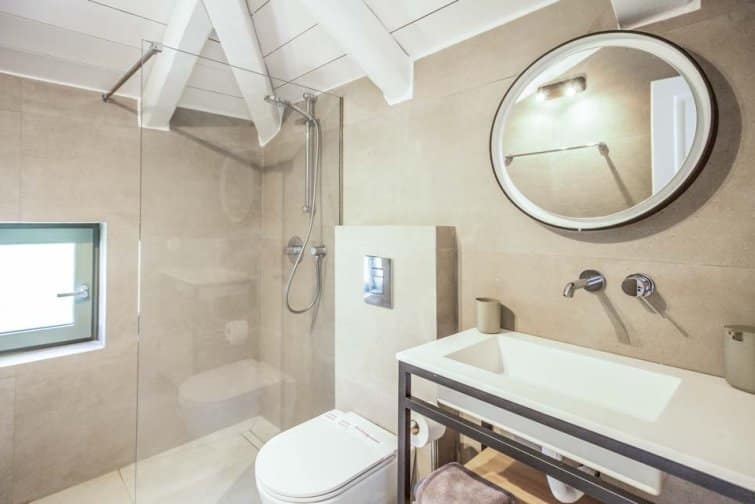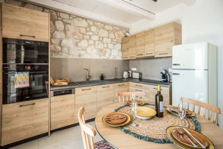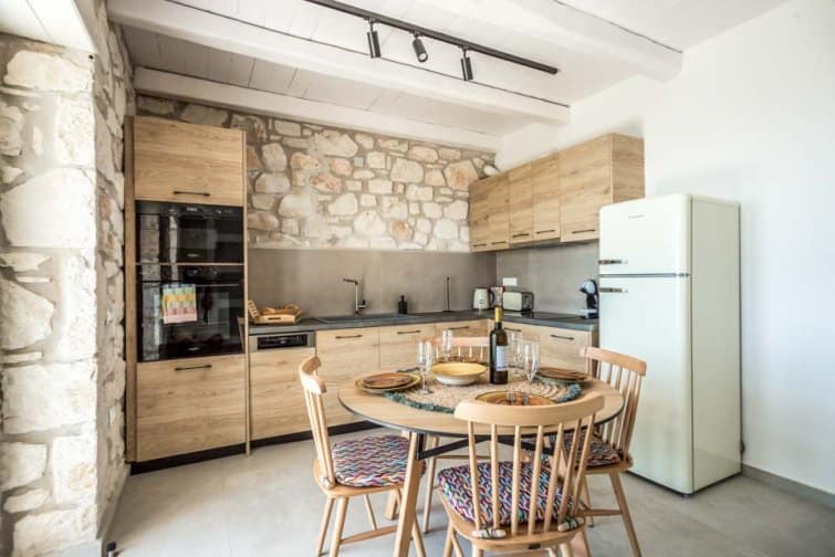 The heart of the villa unfolds in an open-plan arrangement, where the kitchen, lounge, and dining area seamlessly meld into a warm and inviting space. Weathered wooden beams cradle the ceilings, and the aged stone walls breathe history into every corner. The kitchen, adorned with vintage touches, becomes a sanctuary for culinary exploration, inviting the creation of hearty meals and shared stories.