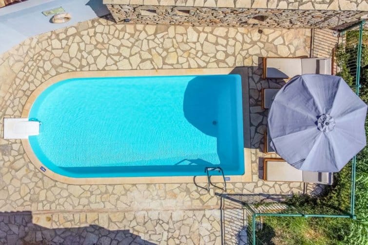 Step outside, and the enchantment continues. A private pool, reflecting the azure skies, beckons you to immerse yourself in its cool embrace, surrounded by weathered stone terraces that tell tales of countless sun-soaked afternoons. Here, time slows down, and the rhythmic lapping of water becomes a soothing melody.
