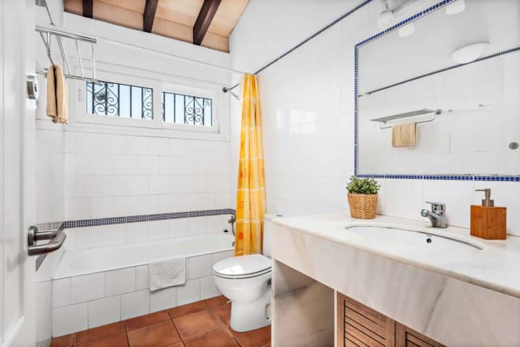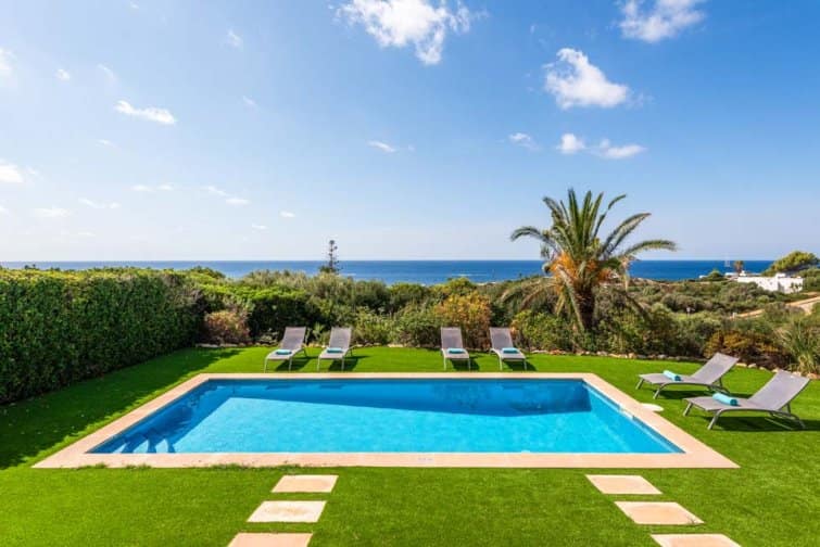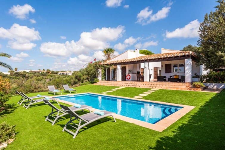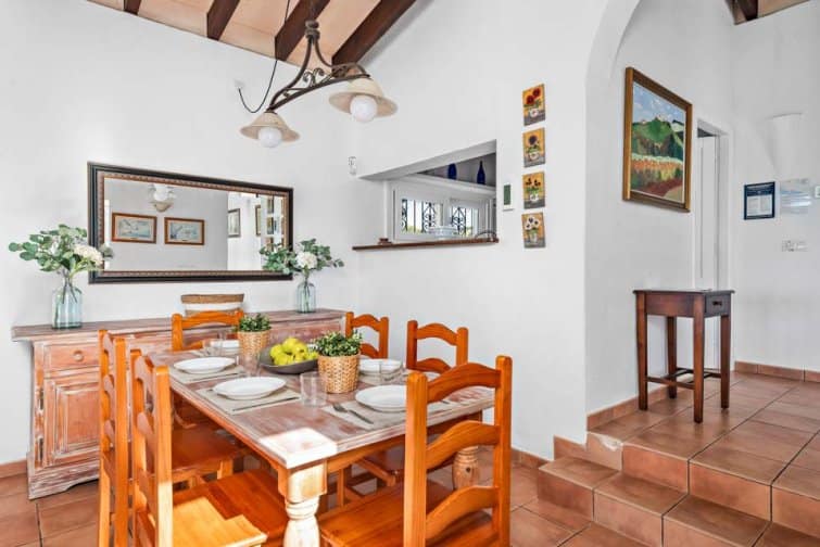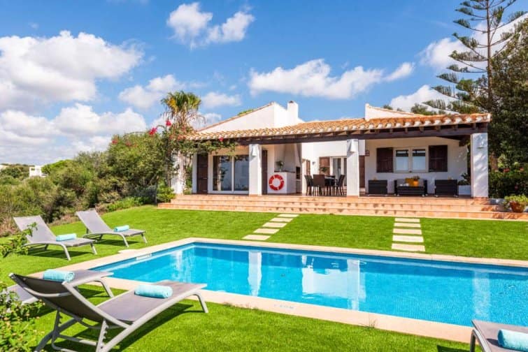 Surrounded by lush green gardens and with a view to take your breath away, Villa Matisse is a beautiful Menorcan villa within walking distance to the sought-after resort of Binibeca. On entering this typical Spanish style villa with wooden beamed ceilings and terracotta floors, your eyes are immediately drawn to the large living room windows which overlook both the beautiful gardens and the alluring Mediterranean Sea in the distance. Step out onto the covered terrace which runs the length of the villa and is furnished with comfortable seating and exterior dining facilities. The brick-built barbecue makes dining al fresco a dream, just imagine gathering the family together to enjoy some freshly grilled meats and local vegetables as the sun goes down. A private pool sits at the heart of the lawned garden where hours of fun can be had with the children and ample loungers are provided to soak up the hot Mediterranean sun.