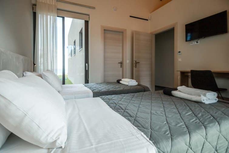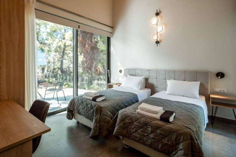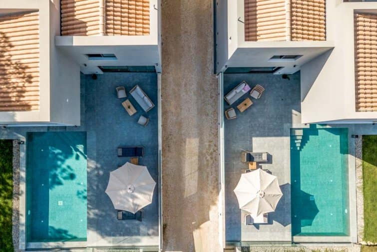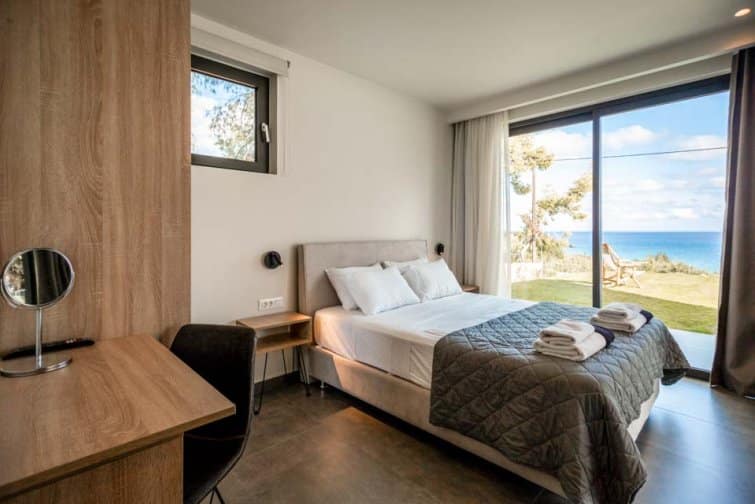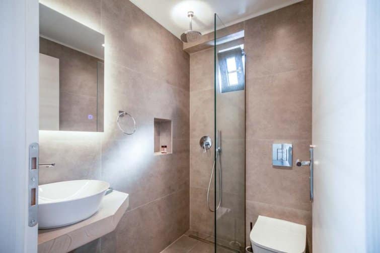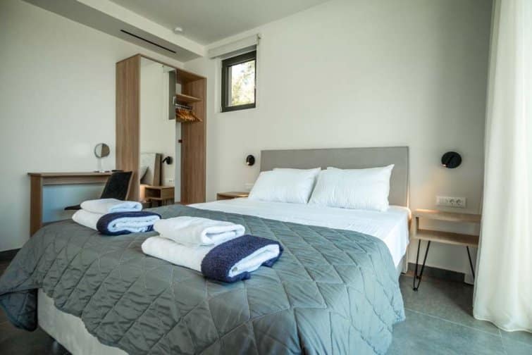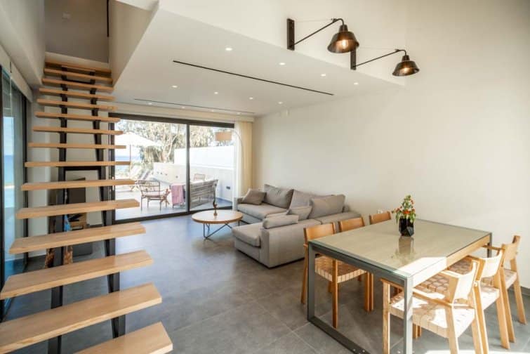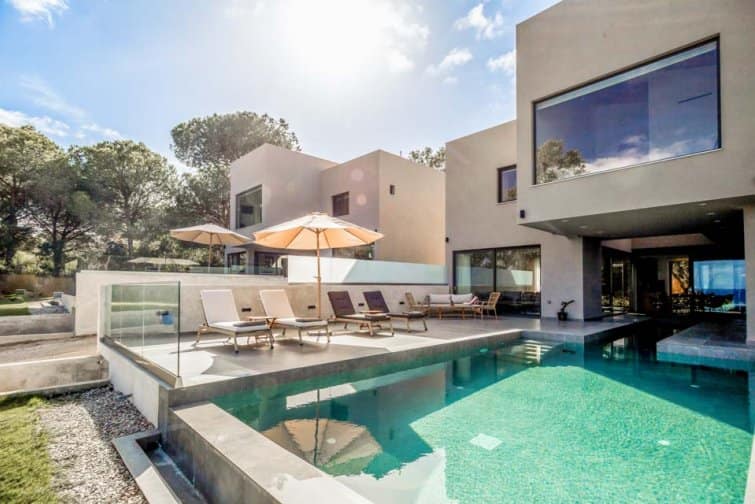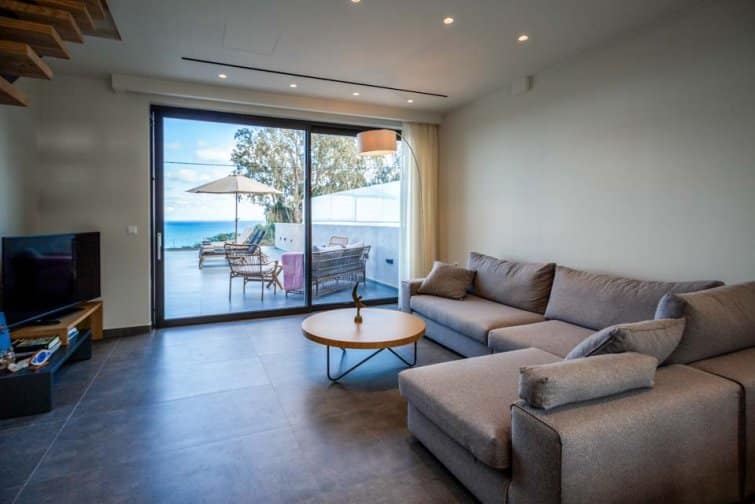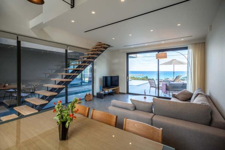 Each bedroom offers a floor to ceiling window to take the most of the beautiful backdrop, bedroom one, offers not only a sea view but a pool view also. allowing optimum sunlight to filter through the glass. Bedroom two, has sea views a direct access to the pool via the terrace, gardens. Bedroom three, is situated on the first floor and offers unlimited sea views from it’s own private balcony, why not grab a glass of your favourite tipple and sit back watching the sunset. There is a sofa bed located on the upper floor.