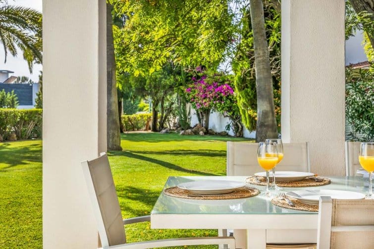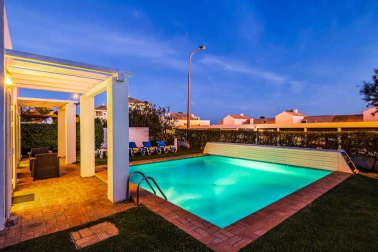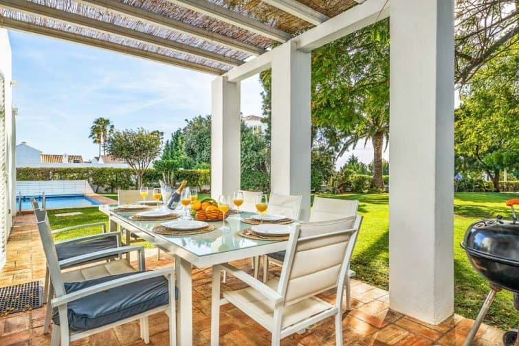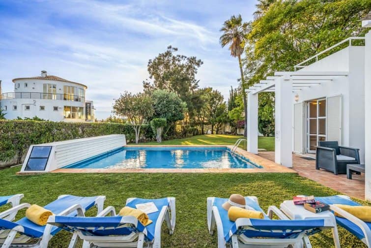 Inside, the property is light and bright with wide patio doors and a minimalistic yet comfortable interior. In the living room and dining area, you will find cosy sofas, a dining table, and a flat-screen TV where guests can come together after a day spent in paradise. The kitchen is well equipped with everything you may need including a microwave, toaster, and coffee machine. Come nightfall, guests can retreat to one of four bedrooms.