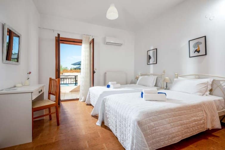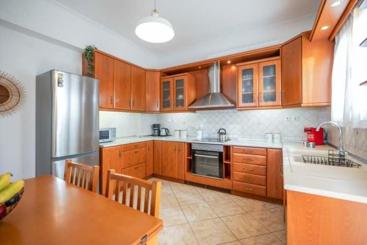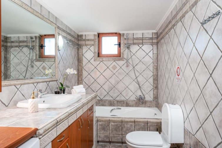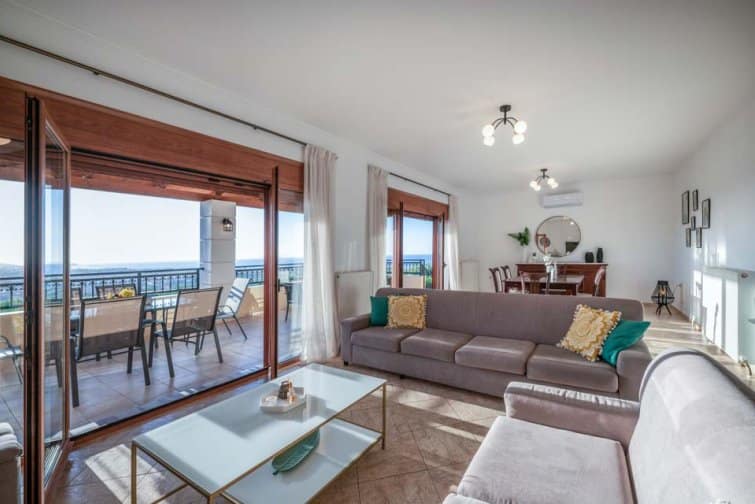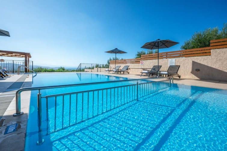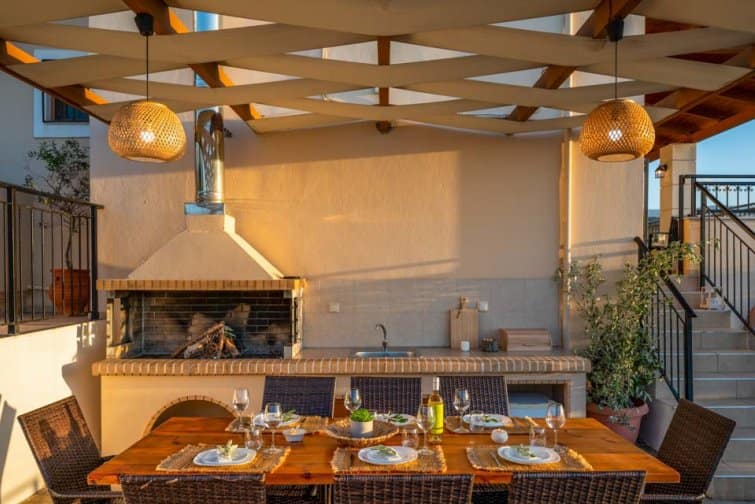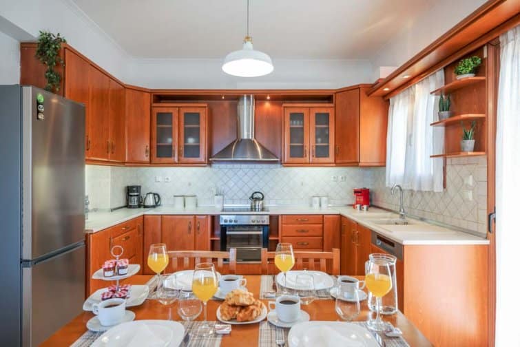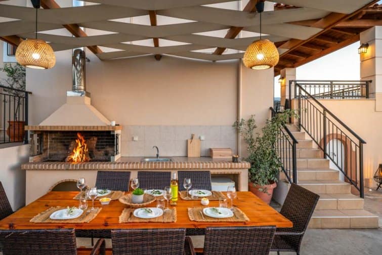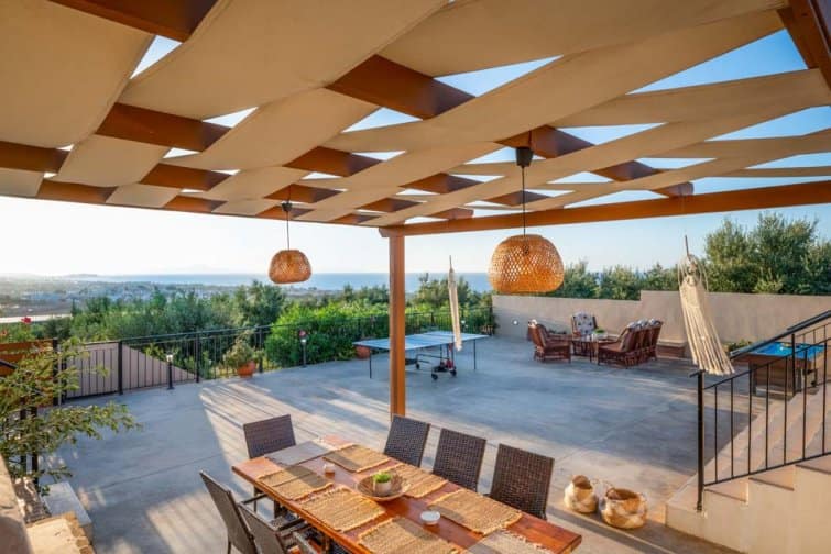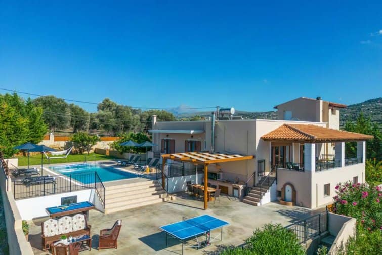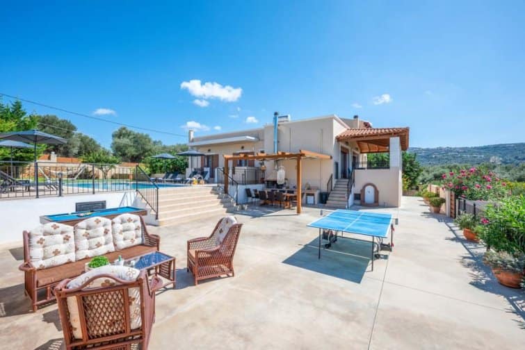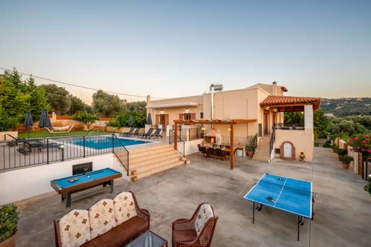 Outside, a private swimming pool framed by sun loungers and umbrellas overlooks Greece’s mountain landscape. For those who seek fun in the sun, table tennis and a pool table are sure to keep both children and adults entertained. With a built-in barbeque and outdoor dining facilities, make the most of the warm evenings by firing up a family feast.