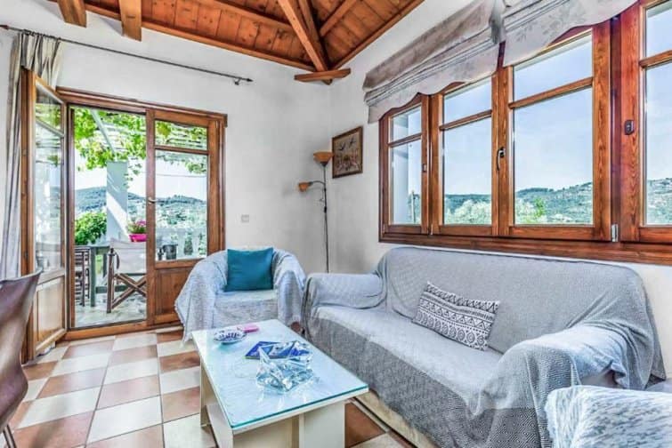 Traditionally furnished, the interior of this villa is a great spot to stay out of the sun and refresh on the soft sofas and comfortable beds. Once you’re feeling revitalised, take to the balcony for some more incredible views of the surrounding area. Look out over Skopelos Town with a cool drink in hand for a memorable evening, or venture into the centre for a more up close and personal experience.