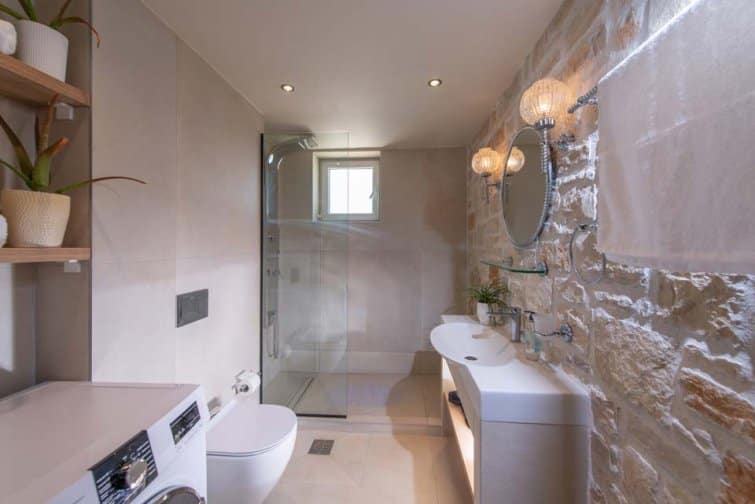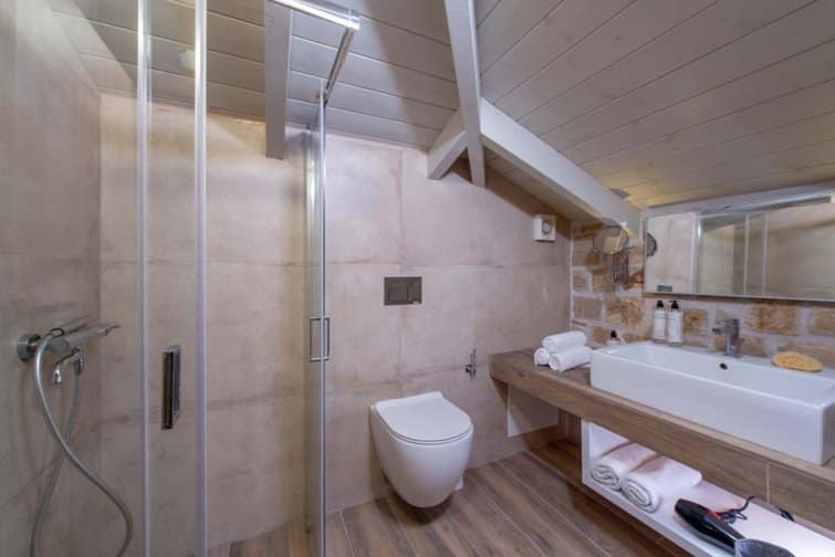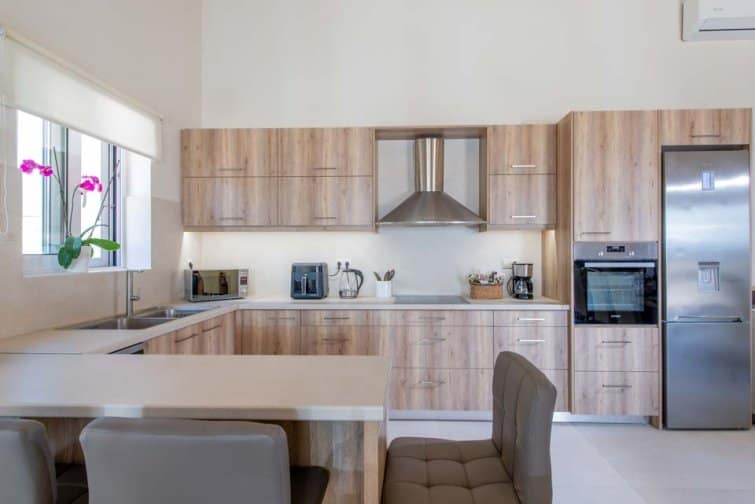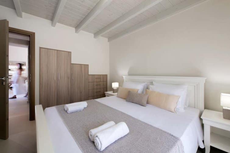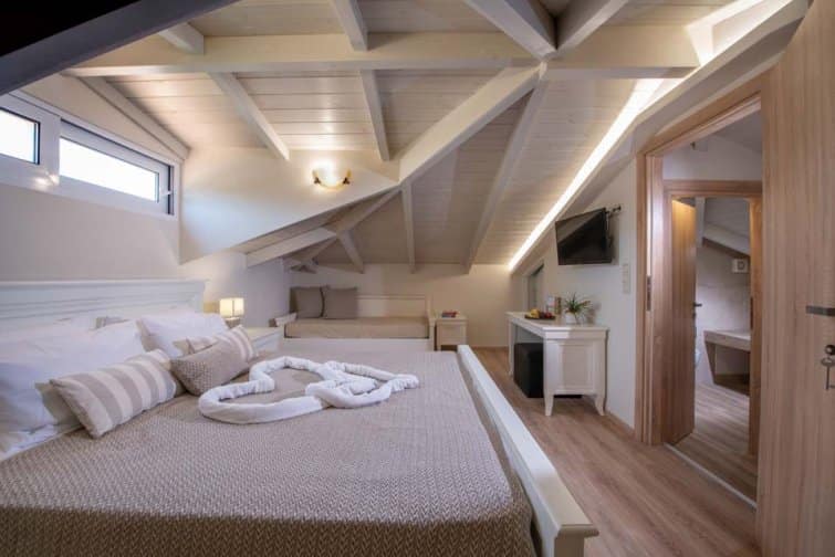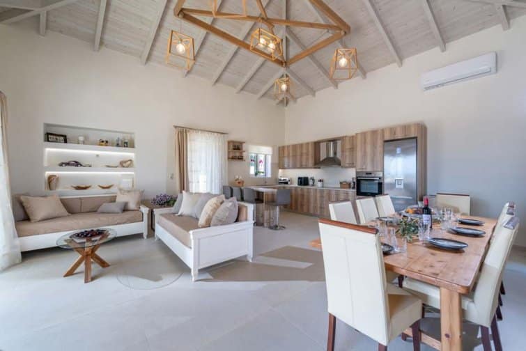 With three bedrooms, this spacious property comfortably accommodates up to six guests on a holiday to Greece. Impressive in both space and style, downstairs the living room, dining area, and the kitchen is open plan and equipped with modern appliances and home comforts such as a dishwasher and flat-screen TV.
