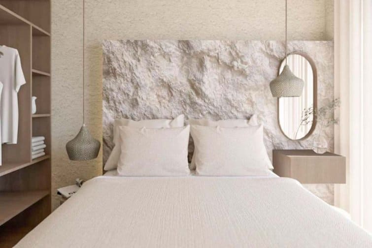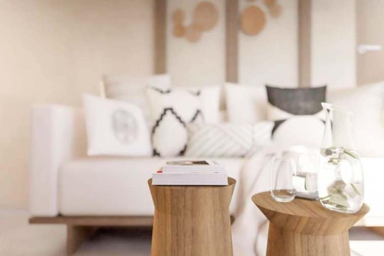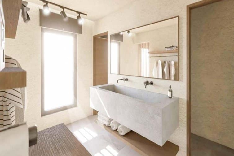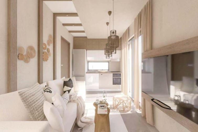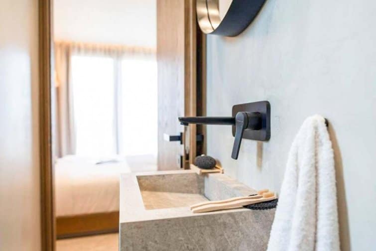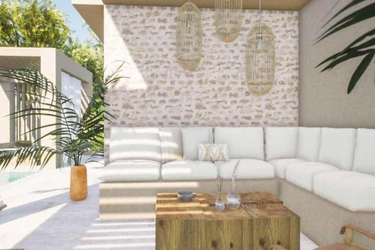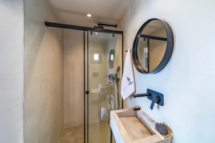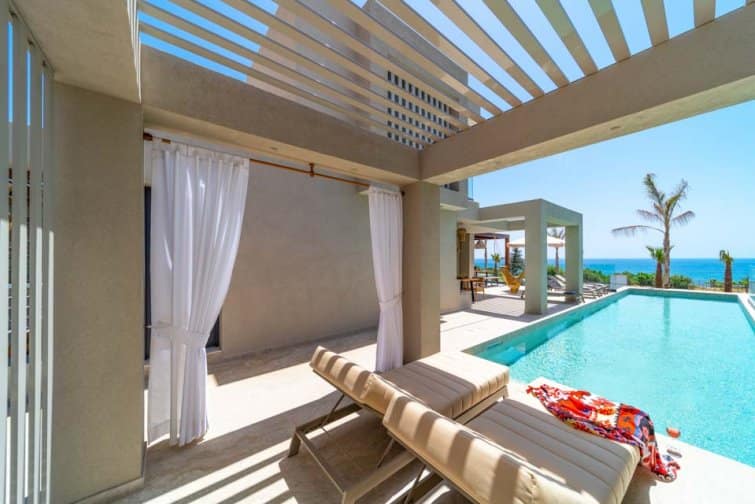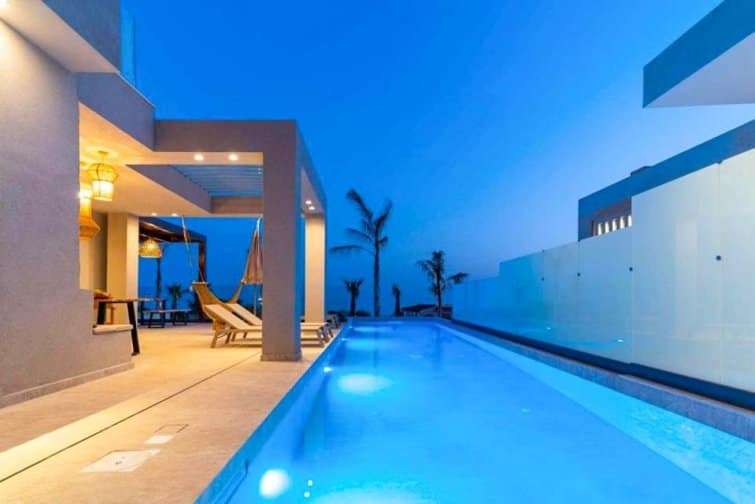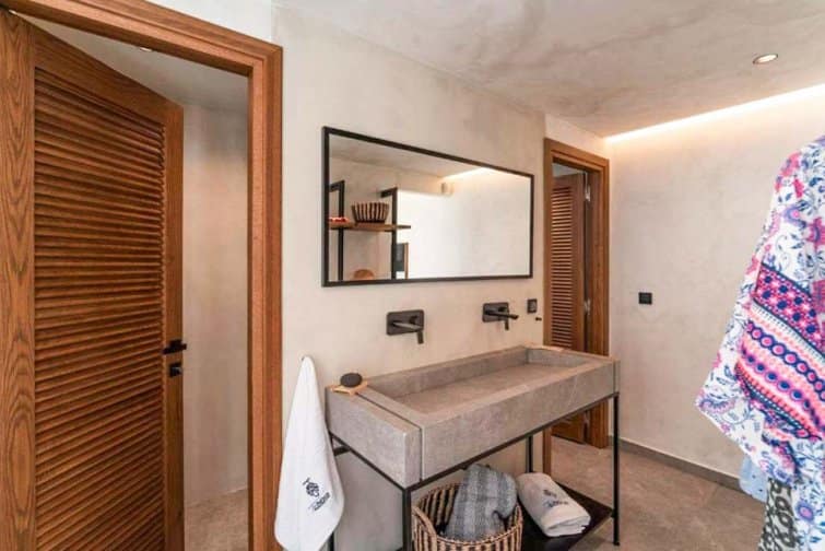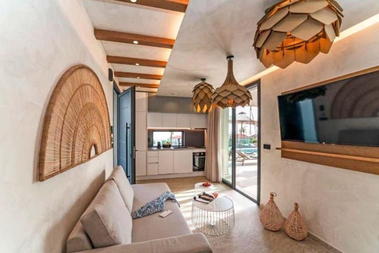 As you head inside, you’re greeted by modern décor, creating a comfortable ambiance with a spacious, open plan living, dining and kitchen space, flooded with natural light. The chic décor extends throughout two air-conditioned floors. On the ground floor, both bedrooms offer direct access to the terrace and pool beyond, with the second bedroom boasting access to a whirlpool.