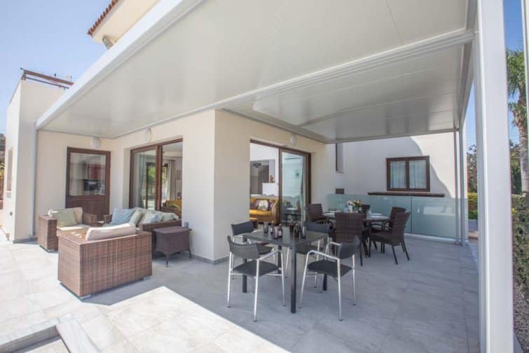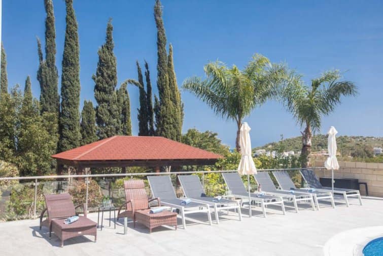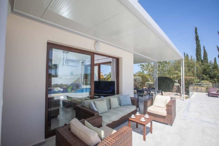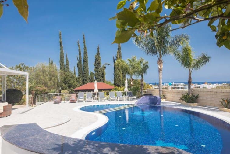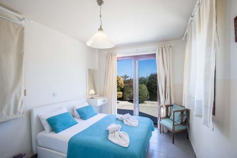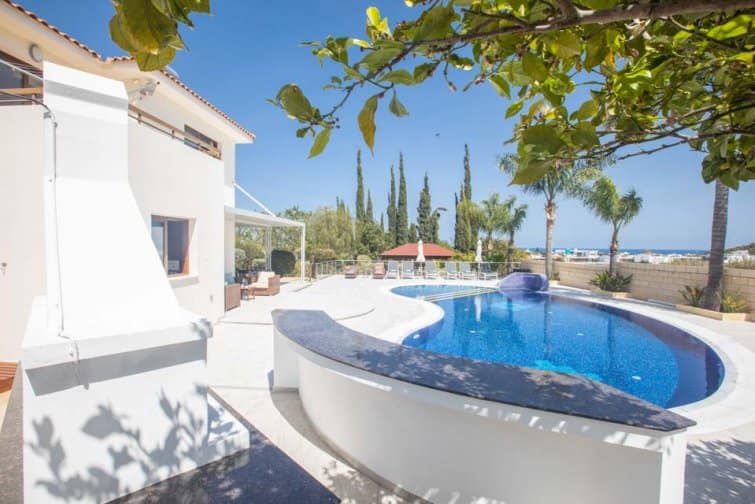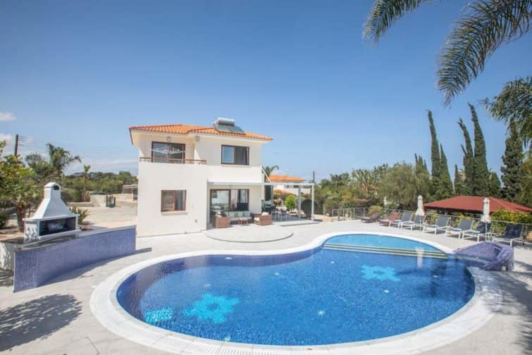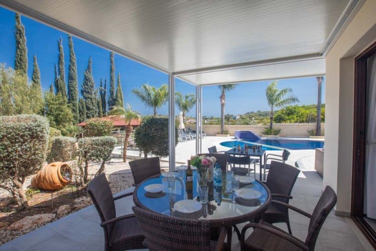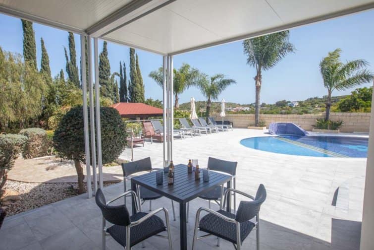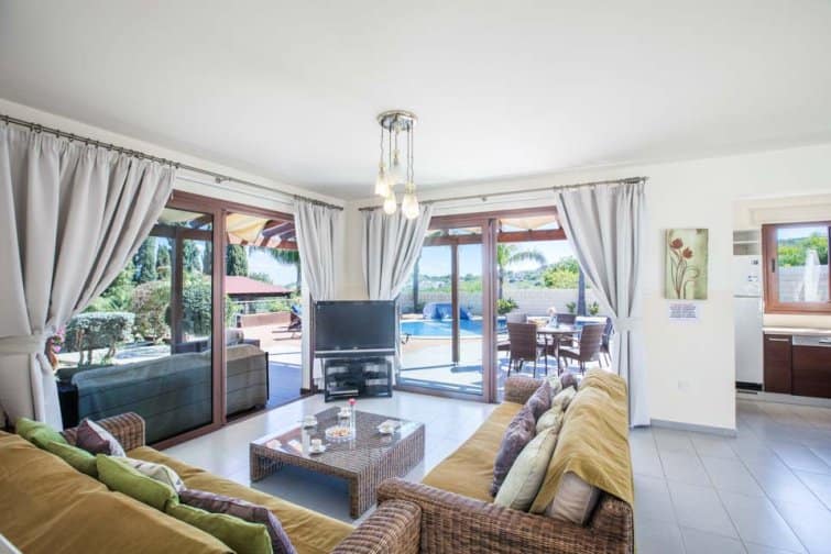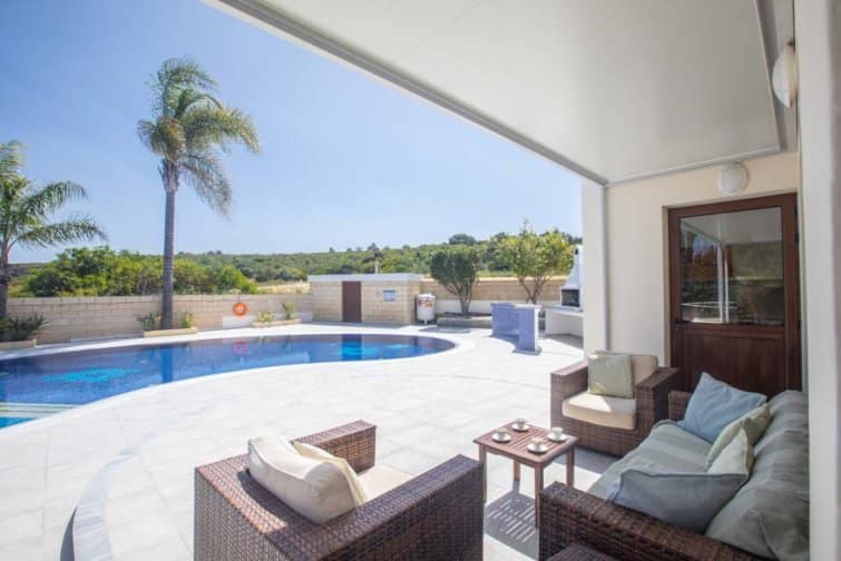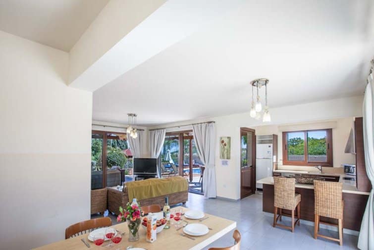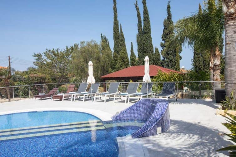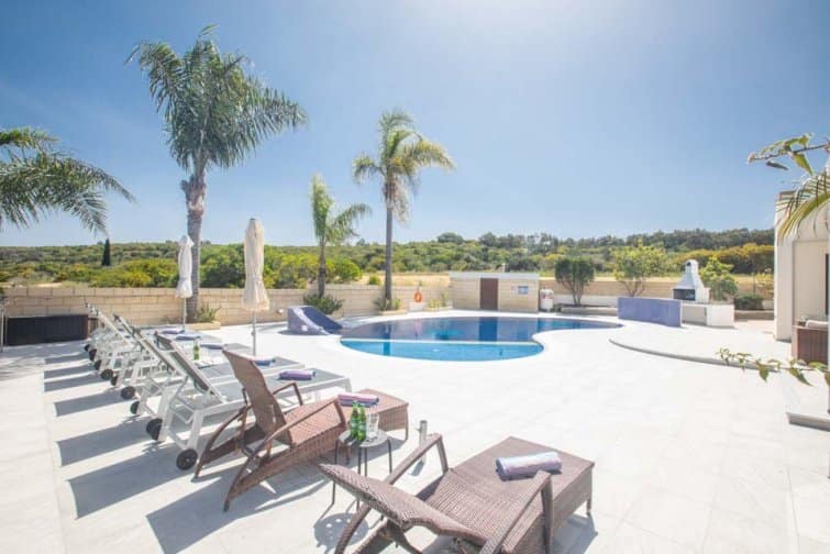 With four bedrooms, four bathrooms, and a large poolside terrace, this villa is ideal for up to eight guests. The kidney-shaped pool provides much-needed rest bite from the midday sun and is the ideal size for swimming a few lengths or splashing around with the kids.