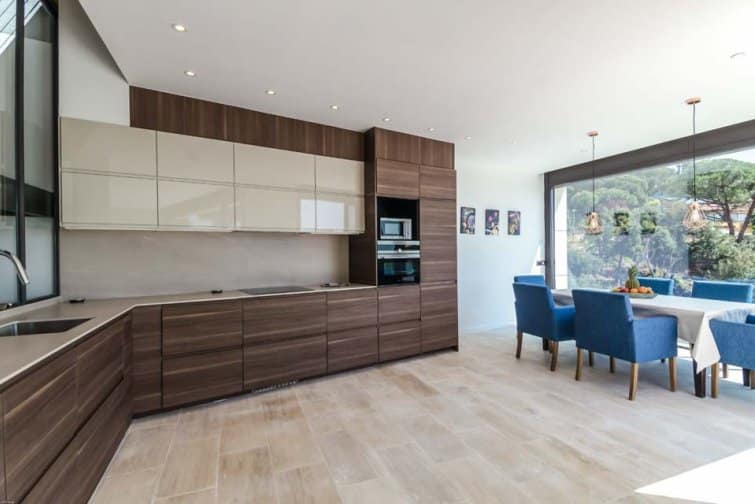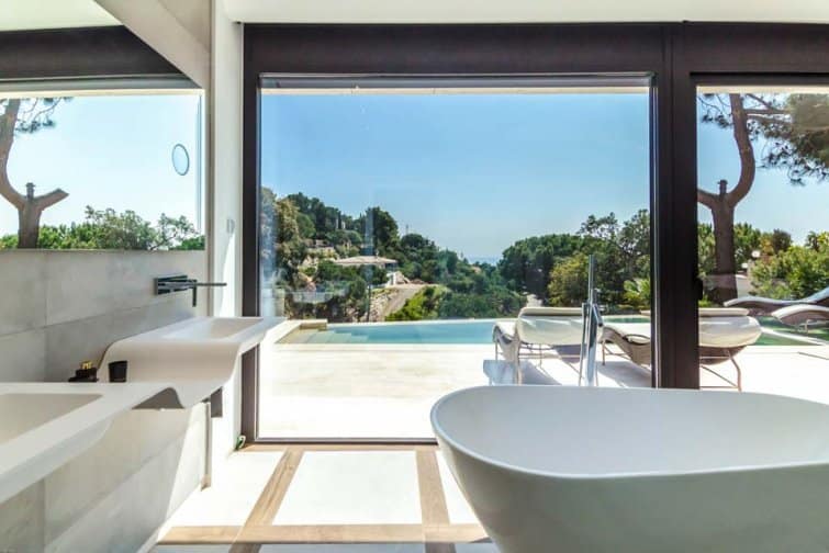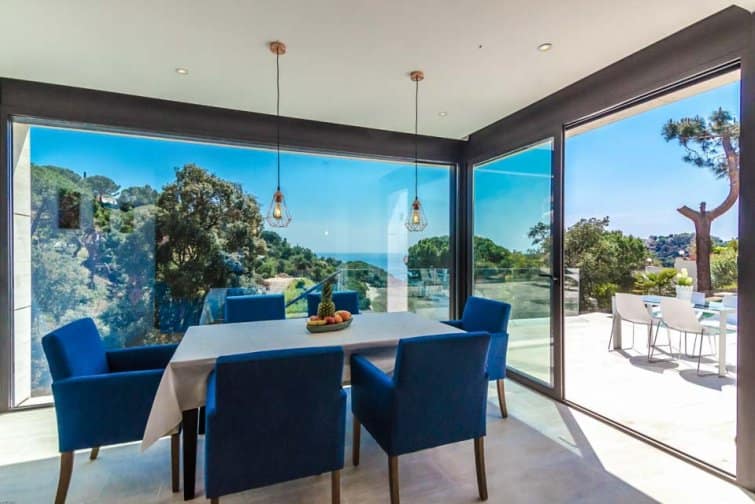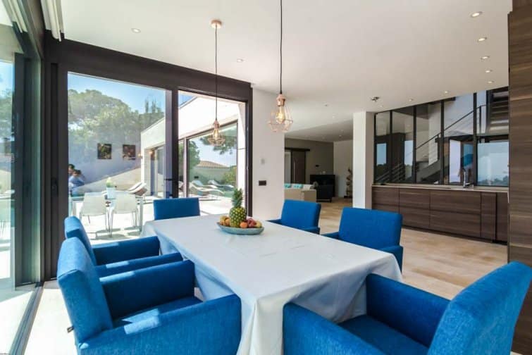 Set on a quiet street in an urban area of Spain, Villa Rosalicia is nestled among lush green countryside and offers immaculate sea views from its beachfront location. Inside, this villa showcases modern interiors that complement the cool and calm atmosphere. In the living room, floor to ceiling windows instantly provide the space with open and airy elegance. The kitchen and dining area are well equipped with a dining table for six guests and a range of modern appliances and utensils.