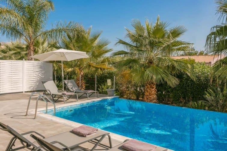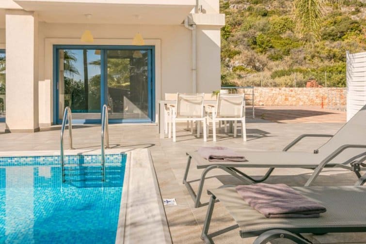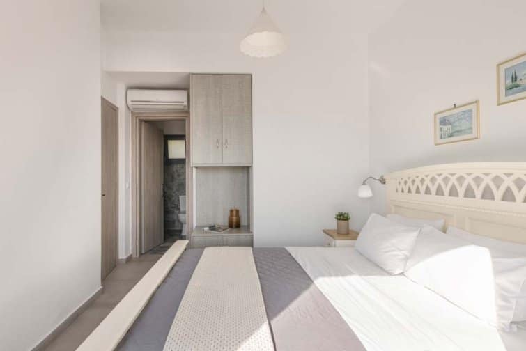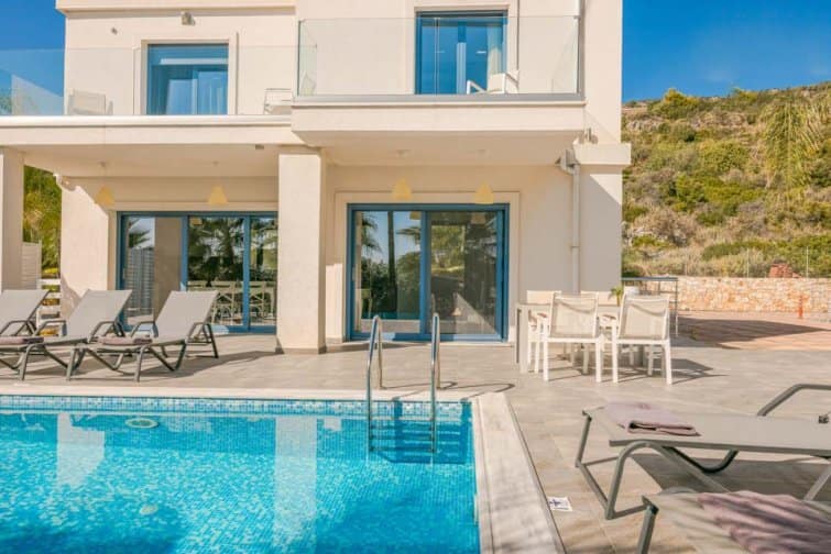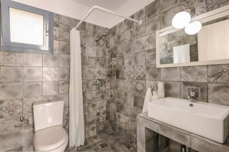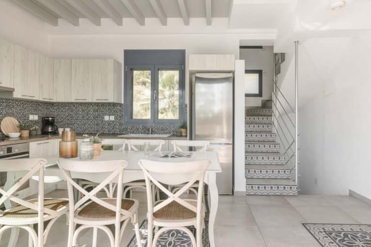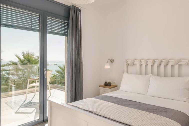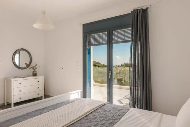 Back at the villa, Mediterranean blue, mosaic tiles, and complementary white accents perfectly capture the true essence of Greece. Outside, the infinity pool boasts unobstructed sea views alongside Kefalonia’s rugged green landscape. Surrounded by sun beds, sun seekers are sure to be in their element. From the balcony, watch as the world goes by from a height. Under the shaded patio, there is plenty of space to escape from the midday sun and for socialising after another day spent in paradise.