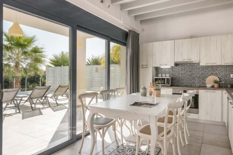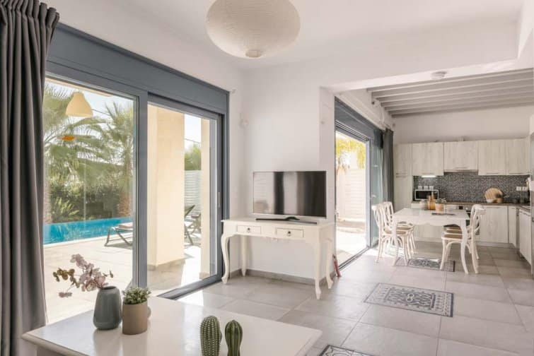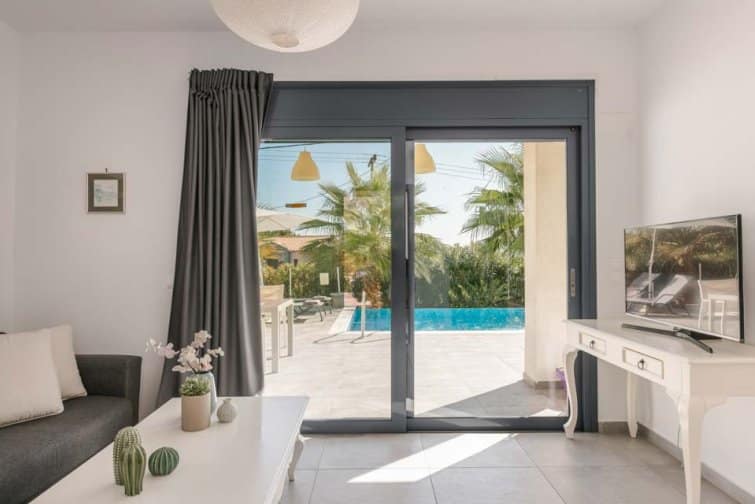 A dining area, living room, and kitchen can be found through the wide glass patio doors. Equipped with all the latest mod cons, including a dishwasher and coffee machine, this property makes self-catering holidays effortless. With air conditioning, Wi-Fi, and satellite TV, your stay at Villa Starfish Skala is sure to be cool and comfortable.
