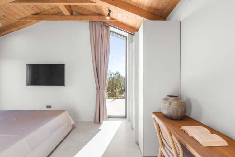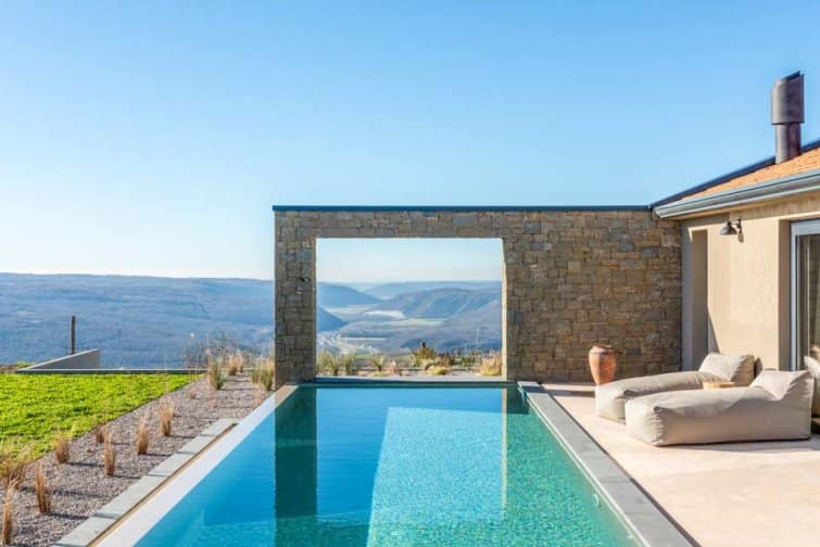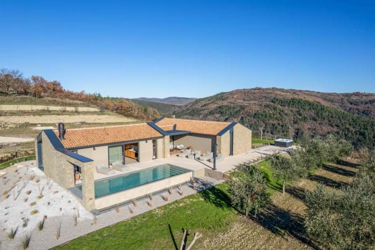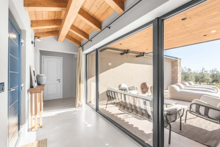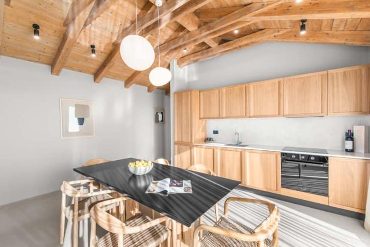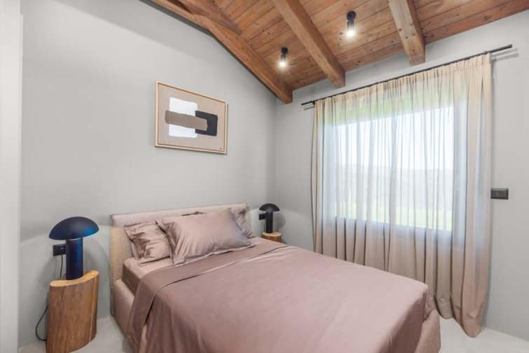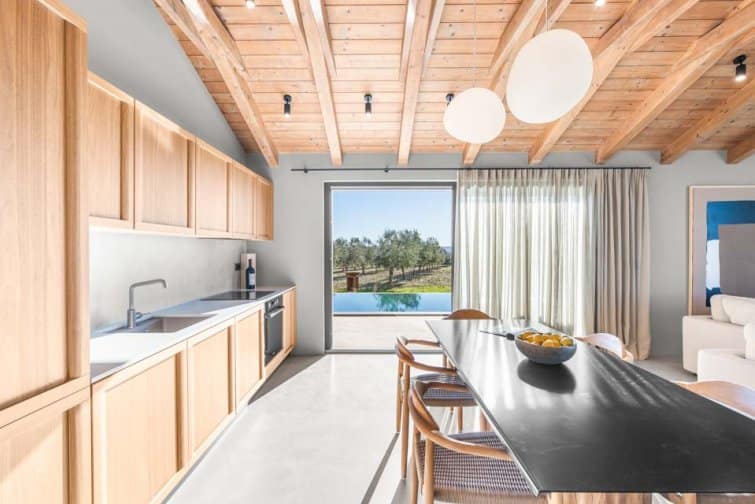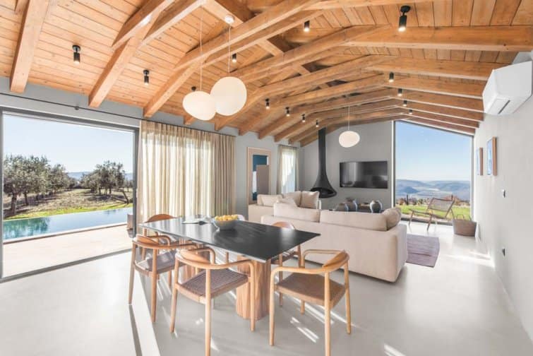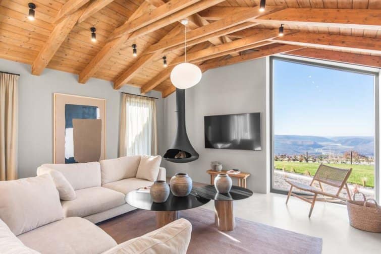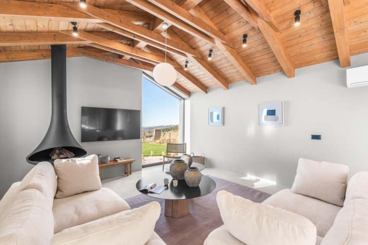 Thoughtfully designed to harmonize with its natural surroundings, the house boasts floor-to-ceiling windows that invite the outside in, ensuring that every corner is imbued with the beauty of the landscape. Utilizing natural materials and earthy tones, the interior pays homage to its idyllic setting. Vaulted ceilings adorned with wooden beams accentuate the spaciousness, blurring the boundaries between indoors and outdoors.